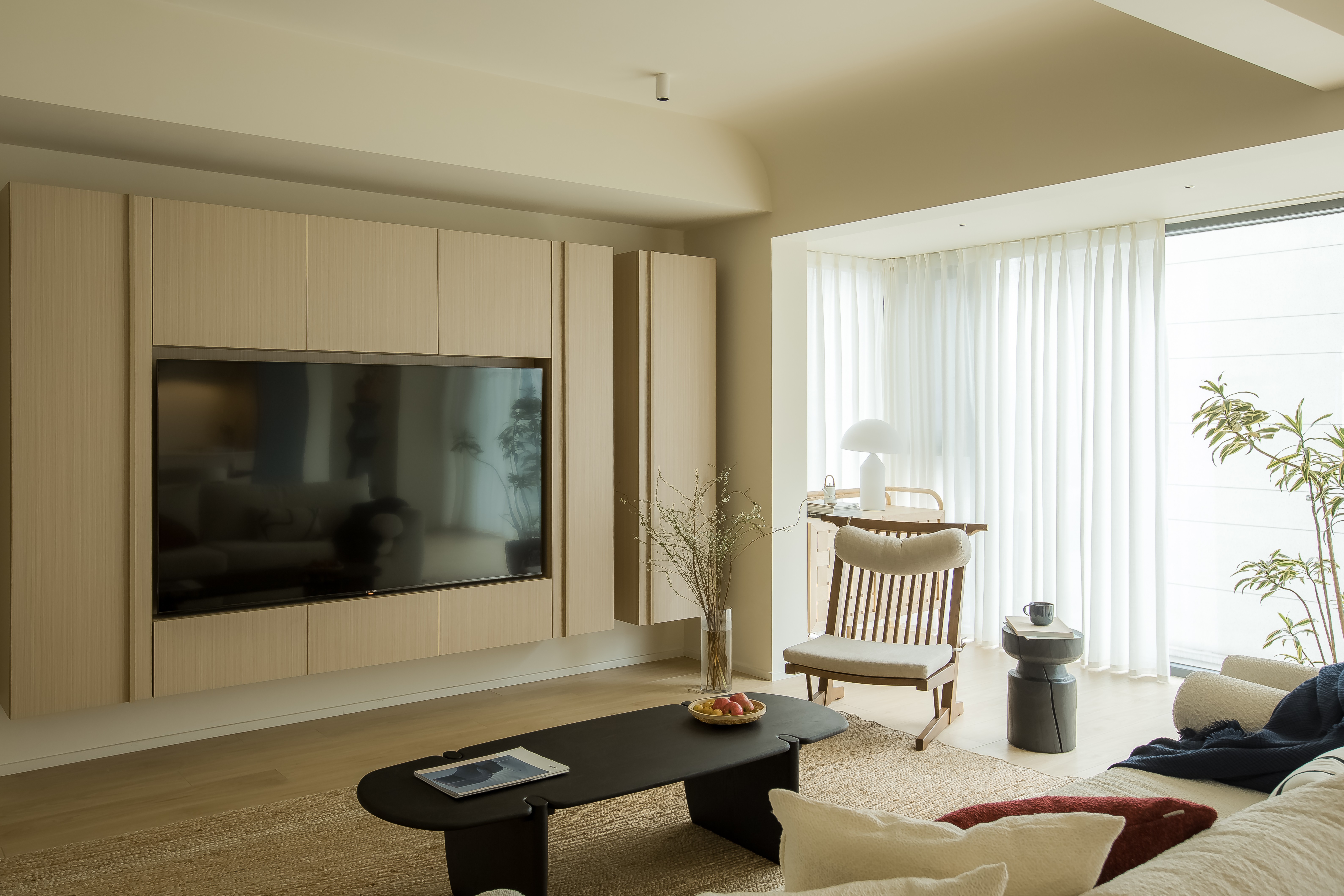 客厅靠窗的区域,女主人偶尔会在这里练习瑜伽,赋予生活更多互动场景,此刻没有风格的束缚,气质却是很沉静。我们把原来正对走道的卧室门设置成隐形门,让整个墙面变得整体干净。