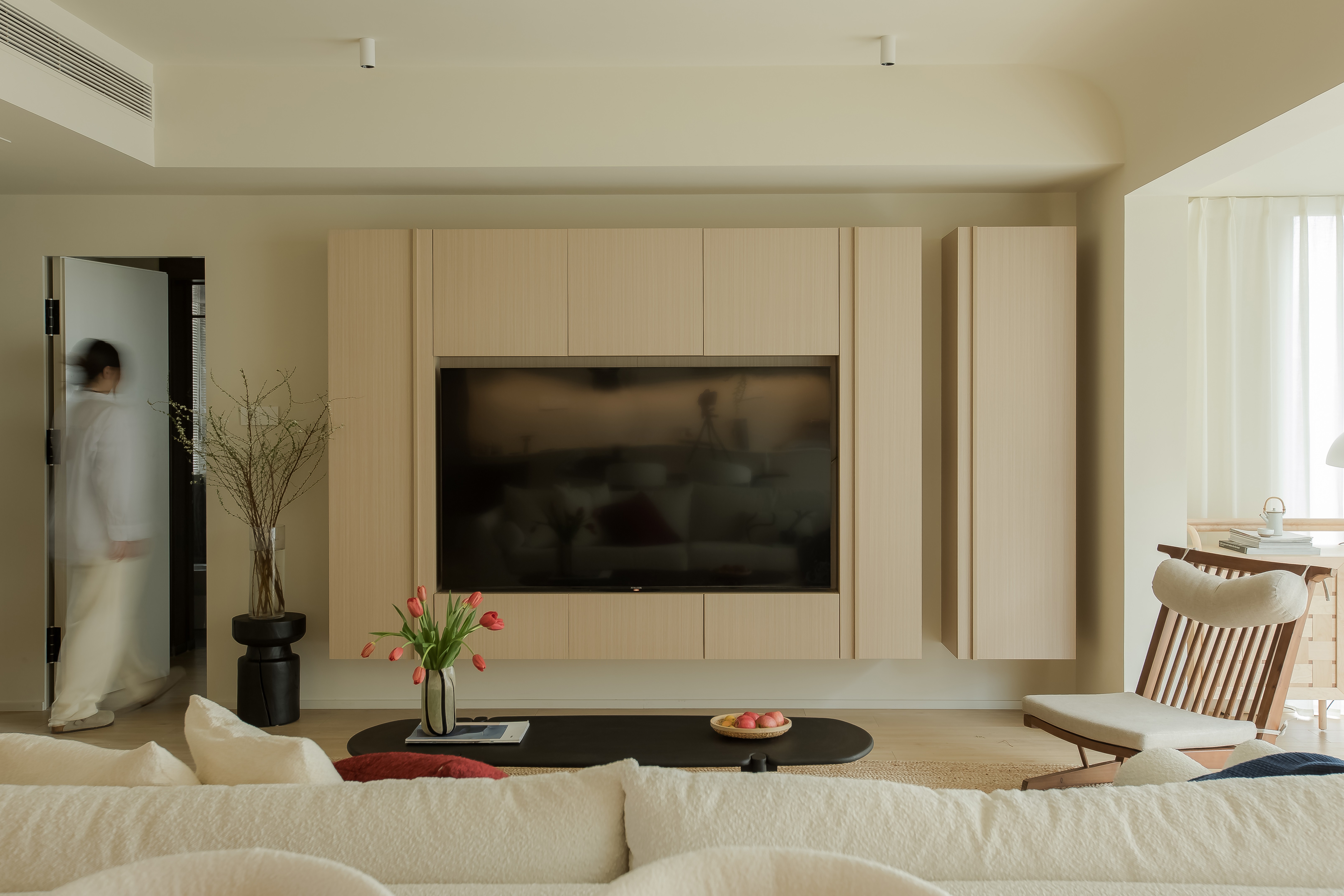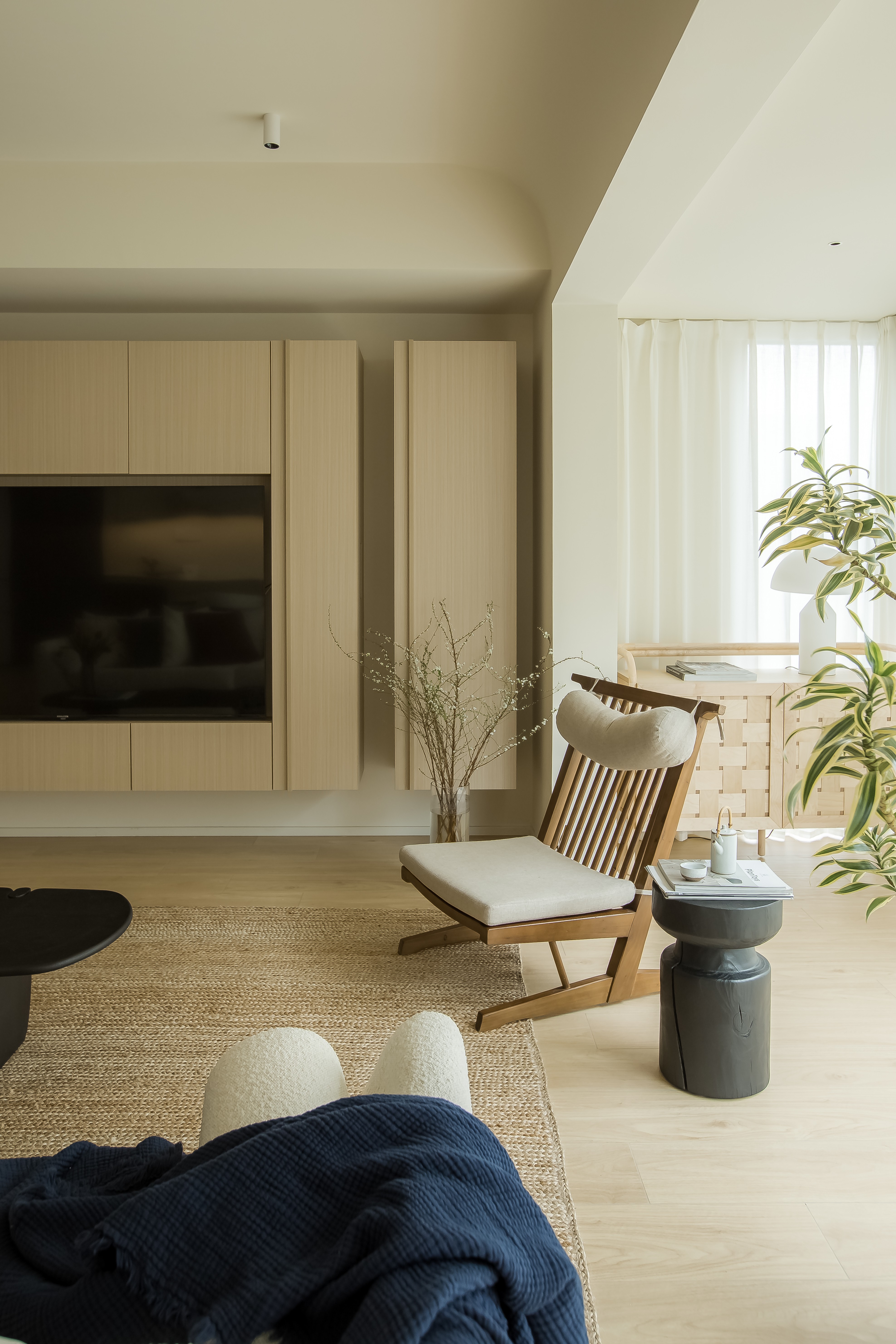 空间意境:全屋以大面积奶杏色墙面搭配橡木色家具及木纹砖,呈现柔和自然的色调和质感,再加上浅色的圈绒沙发,中古休闲椅,营造出舒适、松弛的空间氛围,润物无声,治愈人心。我们把阳台纳入客厅后,阳光可以更多的进入到室内,茶余饭后来到客厅,不急不慢地蜷入羊羔绒沙发的温柔乡里,时而翻读书籍,时而看看窗外发呆放空。客厅靠窗的区域,女主人偶尔会在这里练习瑜伽,赋予生活更多互动场景,此刻没有风格的束缚,气质却是很沉静。书房是男主人最喜欢的空间,他可以在这里放松地阅读、冥想,奶杏色的百叶窗,温润统一,营造出一个宁静、舒缓的空间氛围。
