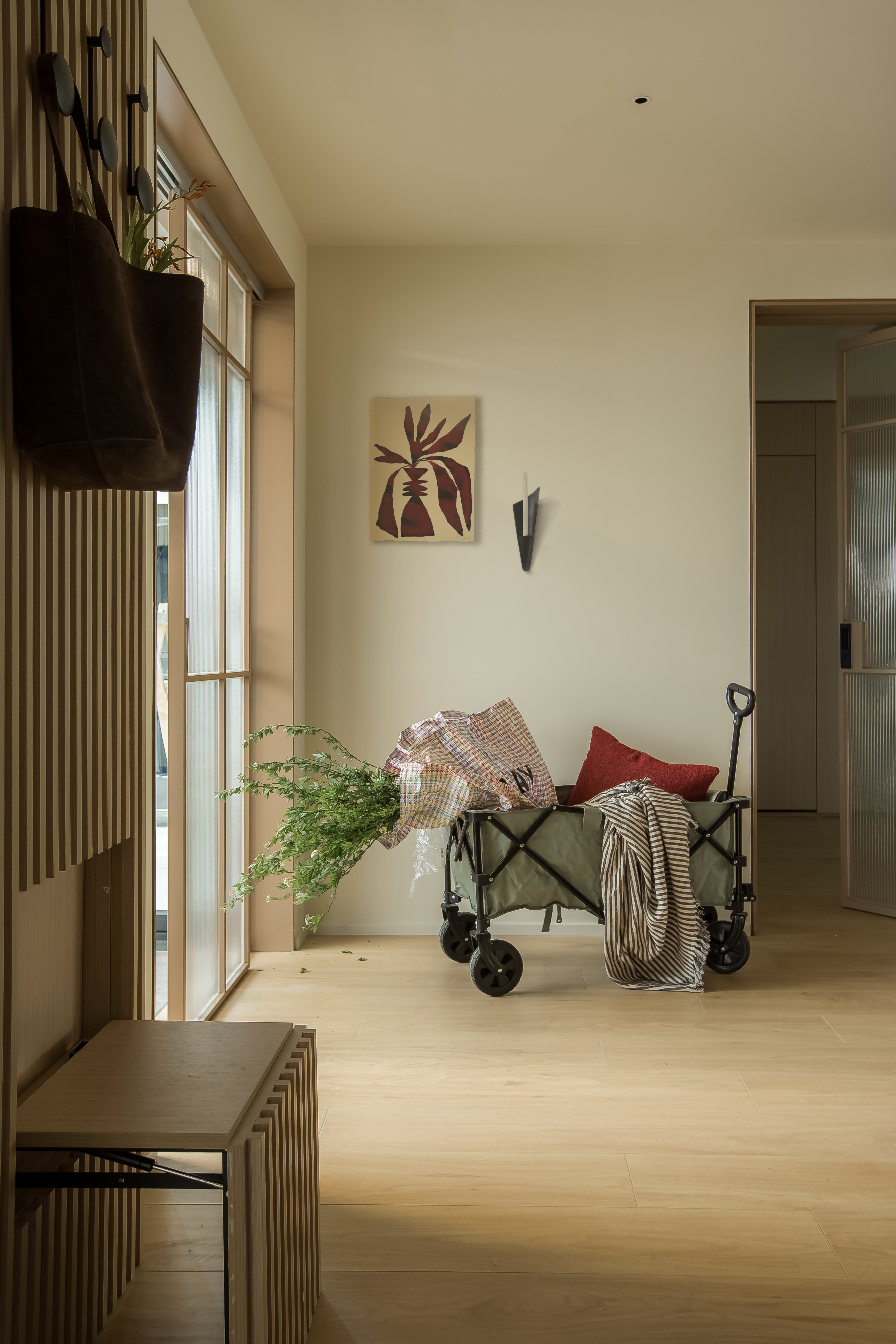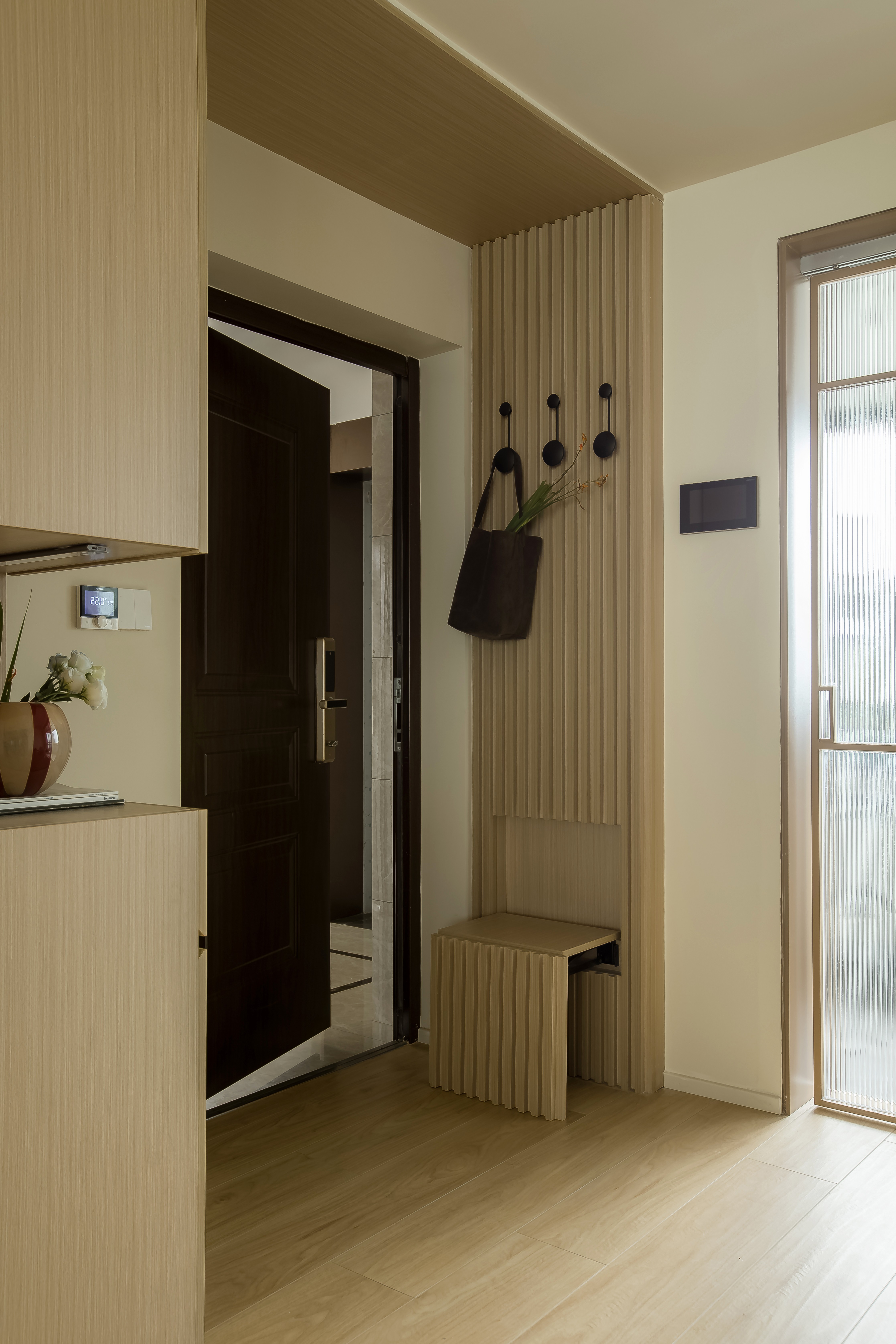 巧妙利用木格栅板,设置了折叠换鞋凳,既可以提供坐下换鞋的便利,又可以在不需要时将其折叠起来,释放出更多的空间,隐形精致。折叠凳上方的MENU衣挂,圆润的造型精致可爱,可以轻松挂包包和回家后脱下的外套,方便利落。