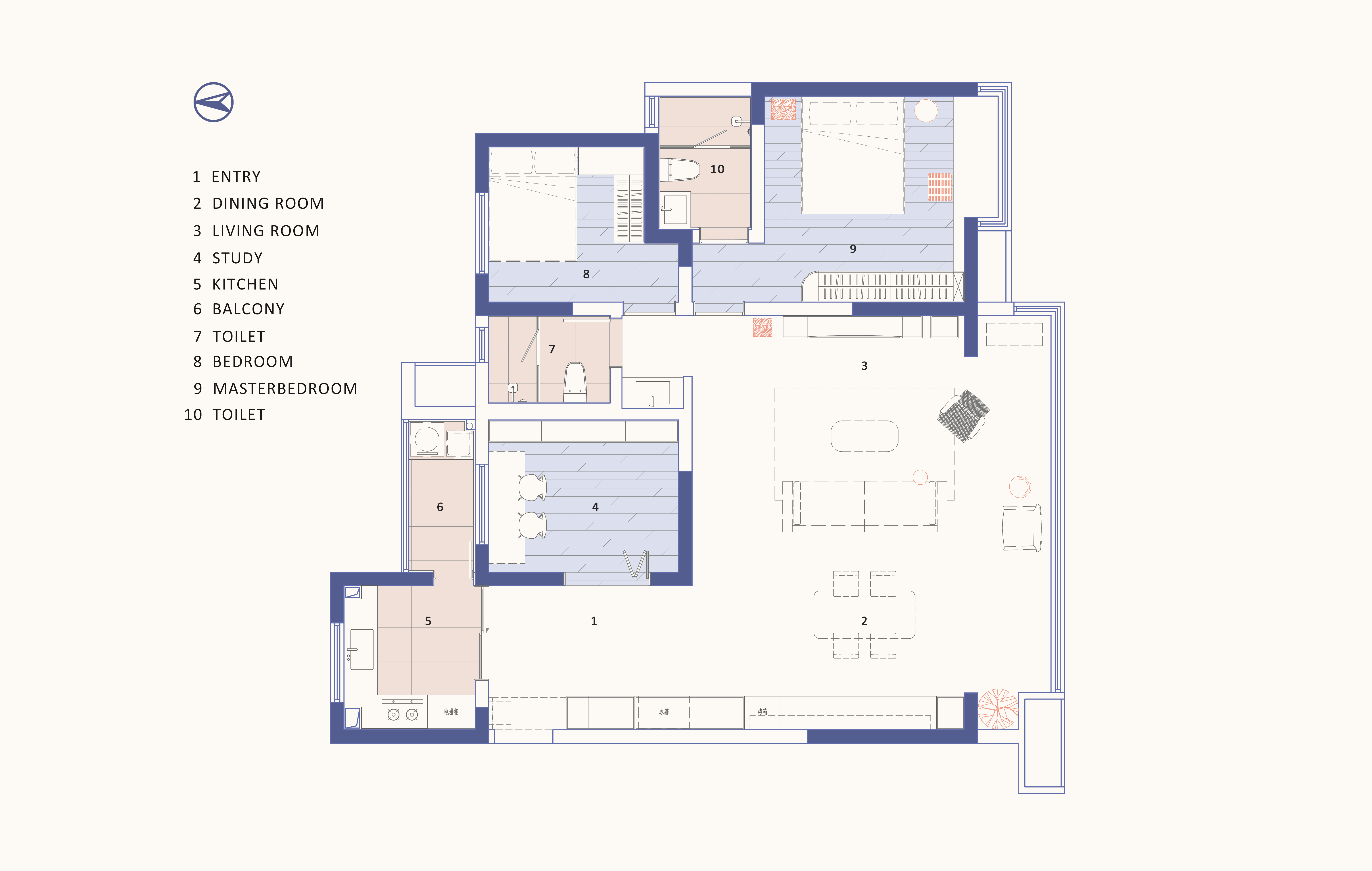 我们把靠近玄关的房间作为书房,调整了入口位置,进一步明确东西向空间的动静关系,即便有客宿情况也可以保证主客之间的隐私距离。 -