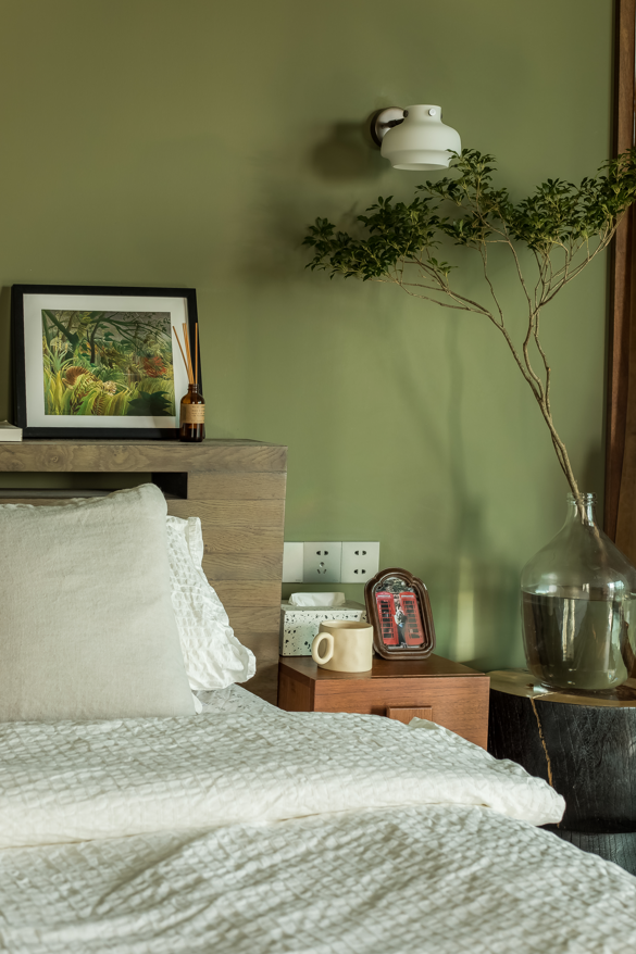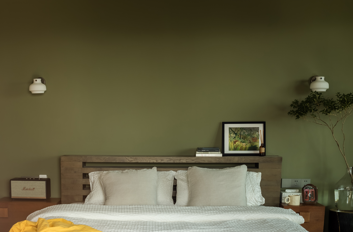 卧室墙面的橄榄绿和家具的柚木色相映成趣,营造宁静温暖的卧室氛围,能让人完全放松的最柔软最美好的地方。