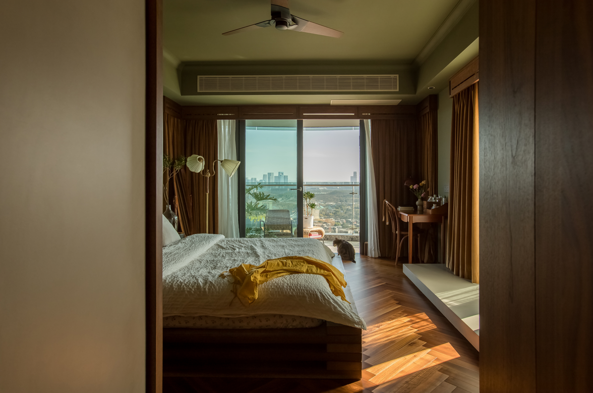 落眼走廊尽头的卧室,房间双面落地玻璃门把露台外的景致框成了一幅一幅连续的画面,透过2.4米的窗帘可以遥望一个湖的春夏秋冬。