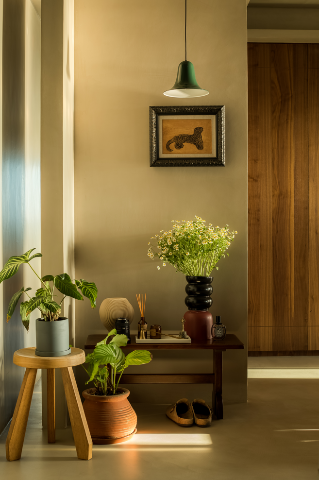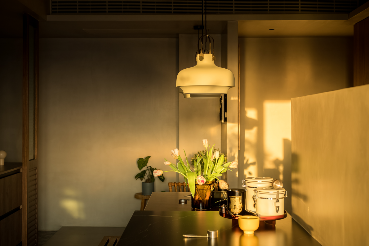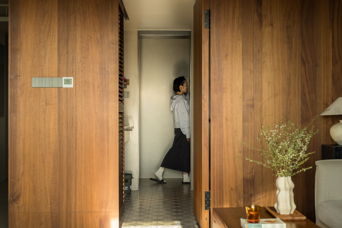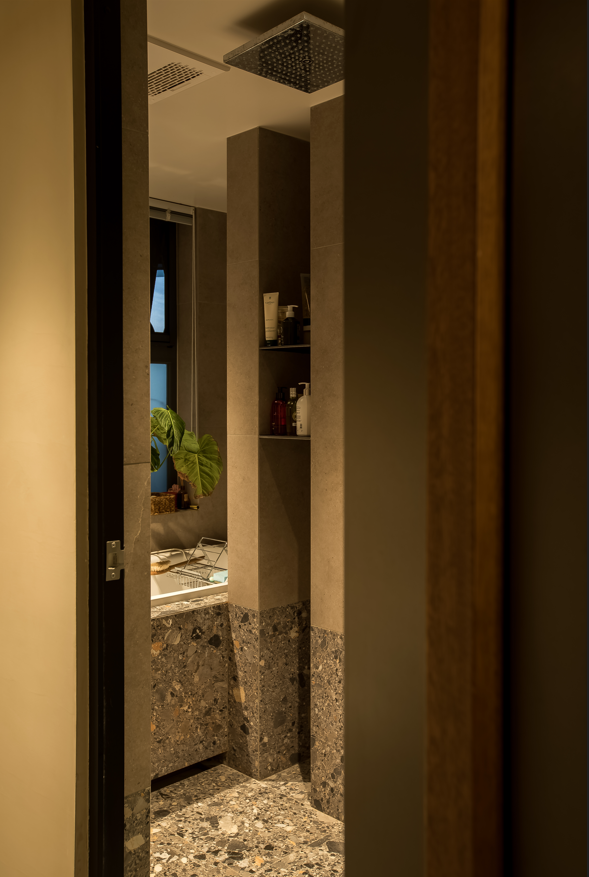 回家步入玄关,地面铺装水磨石老砖有种能让人卸下疲惫的魔力,随这种质朴氛围渐入到松弛平和的生活状态。