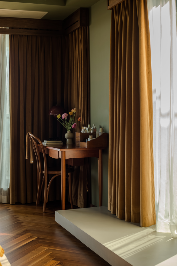 妆台安放在床尾角落,小巧精致的柚木梳妆台时不时散发木质香调。