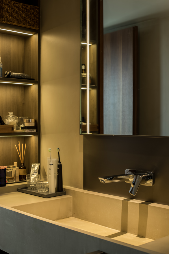卫生间延续了公区的中性灰调,微水泥台盆一体无缝设计,便于日常清洁打理,洗手台上可以放置常用的洗漱用品,随手好拿放,浴室柜内嵌灯带,补充台面照明,简约统一。
