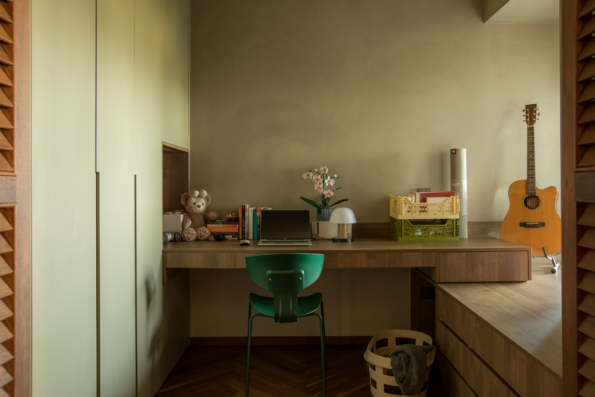 空间意境:采用了松灰作为基调,辅以天然胡桃木皮墙板作为中间色搭配,让空间既能沉淀情绪,营造松弛感,同时在接纳饱满光线的时候能罩染出空间的温润雅致,不论是墙面的画作,还是搭配老家具,都能道出浓厚的人文底蕴。一扇海棠玻璃移门,拉开厨房的序幕,黑色方格砖与胡桃木搭配,复古又温润。卧室墙面的橄榄绿和家具的柚木色相映成趣,营造宁静温暖的卧室氛围,能让人完全放松的最柔软最美好的地方。