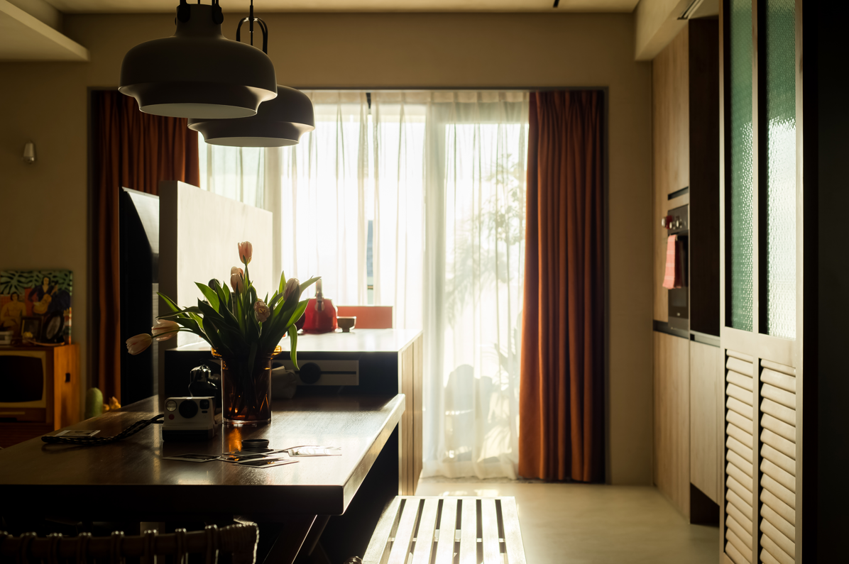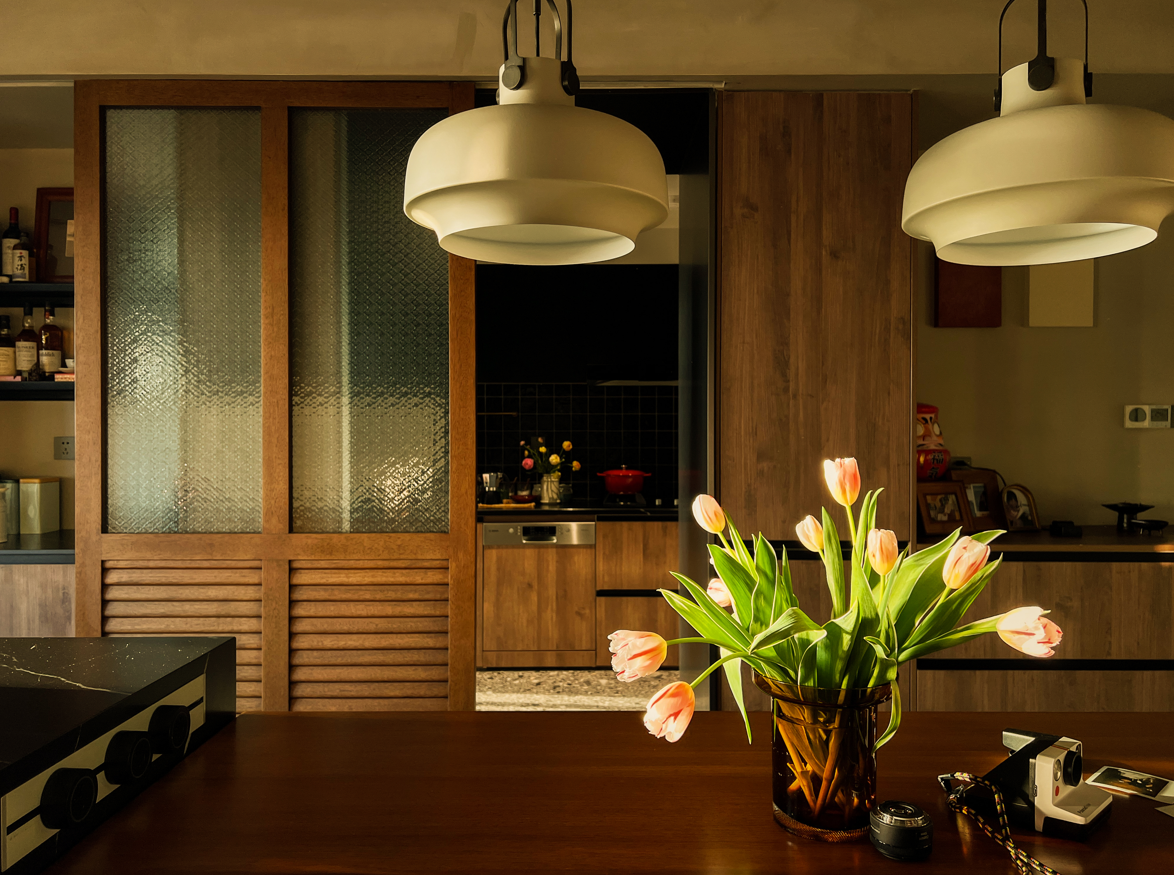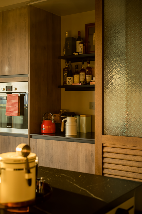 一扇海棠玻璃移门,拉开厨房的序幕,黑色方格砖与胡桃木搭配,复古又温润,在快节奏的工作后享受烹饪带来的治愈,不管是快手菜还是精心的烹饪,配上一杯小酒,便可以让人沉静在餐厨之间细碎的美好里,感受生活的温度。