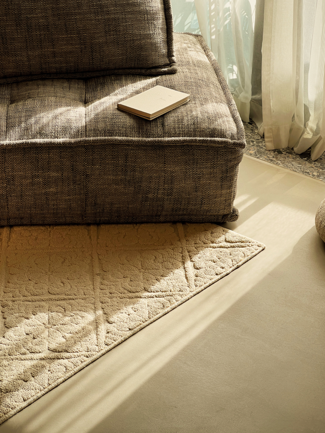 灰白相间的棉麻沙发搭配奶白色老花羊毛地毯,下午三四点的阳光漫射进屋。
