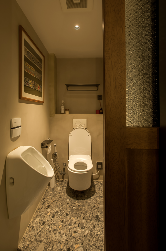 卫生间做了干湿三分离设计,洗手台单独独立出来放到半开放区域,里面则设置了马桶、小便池和淋浴房,更加干净卫生好打理。