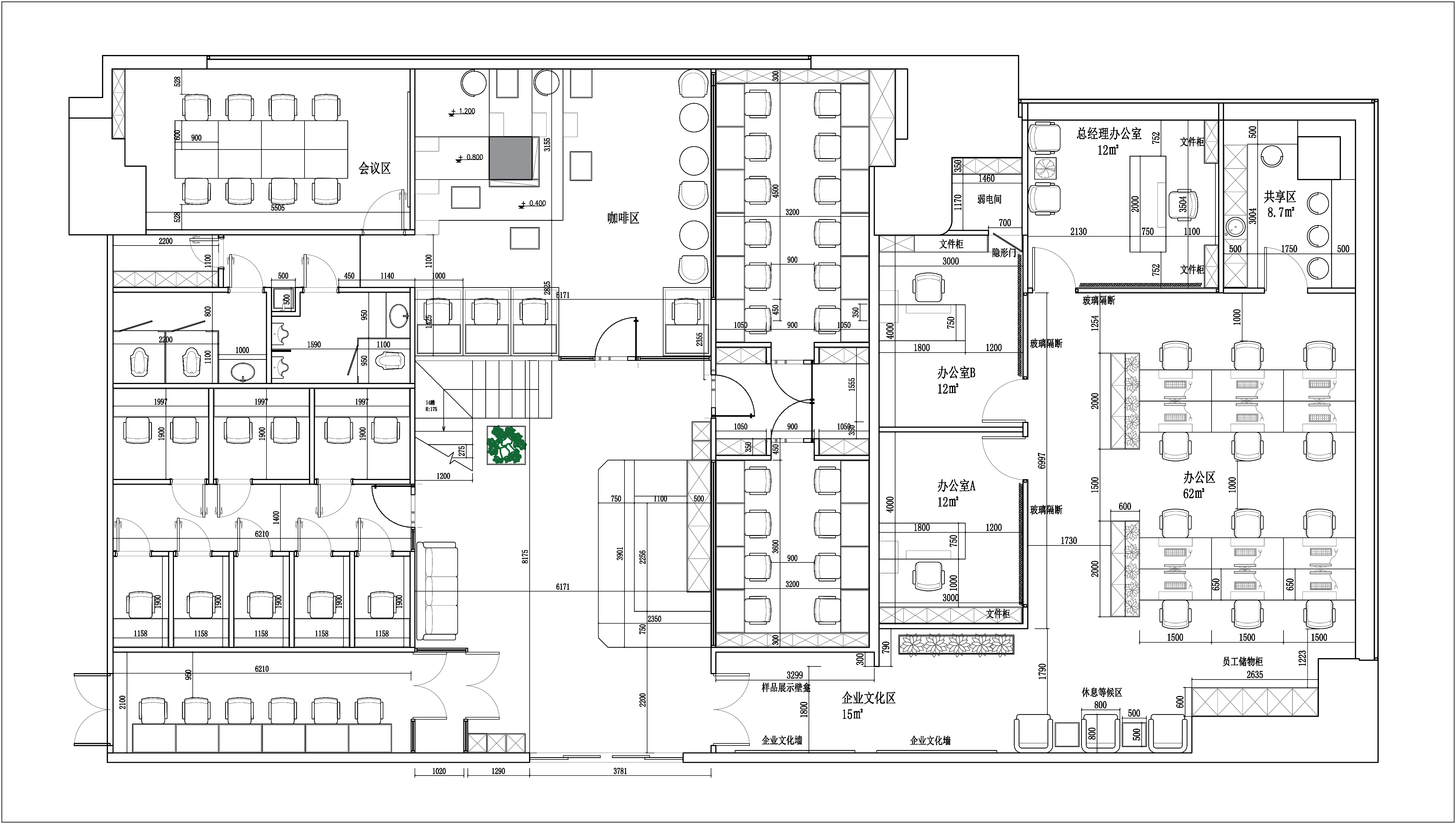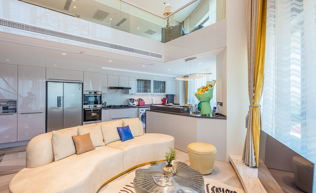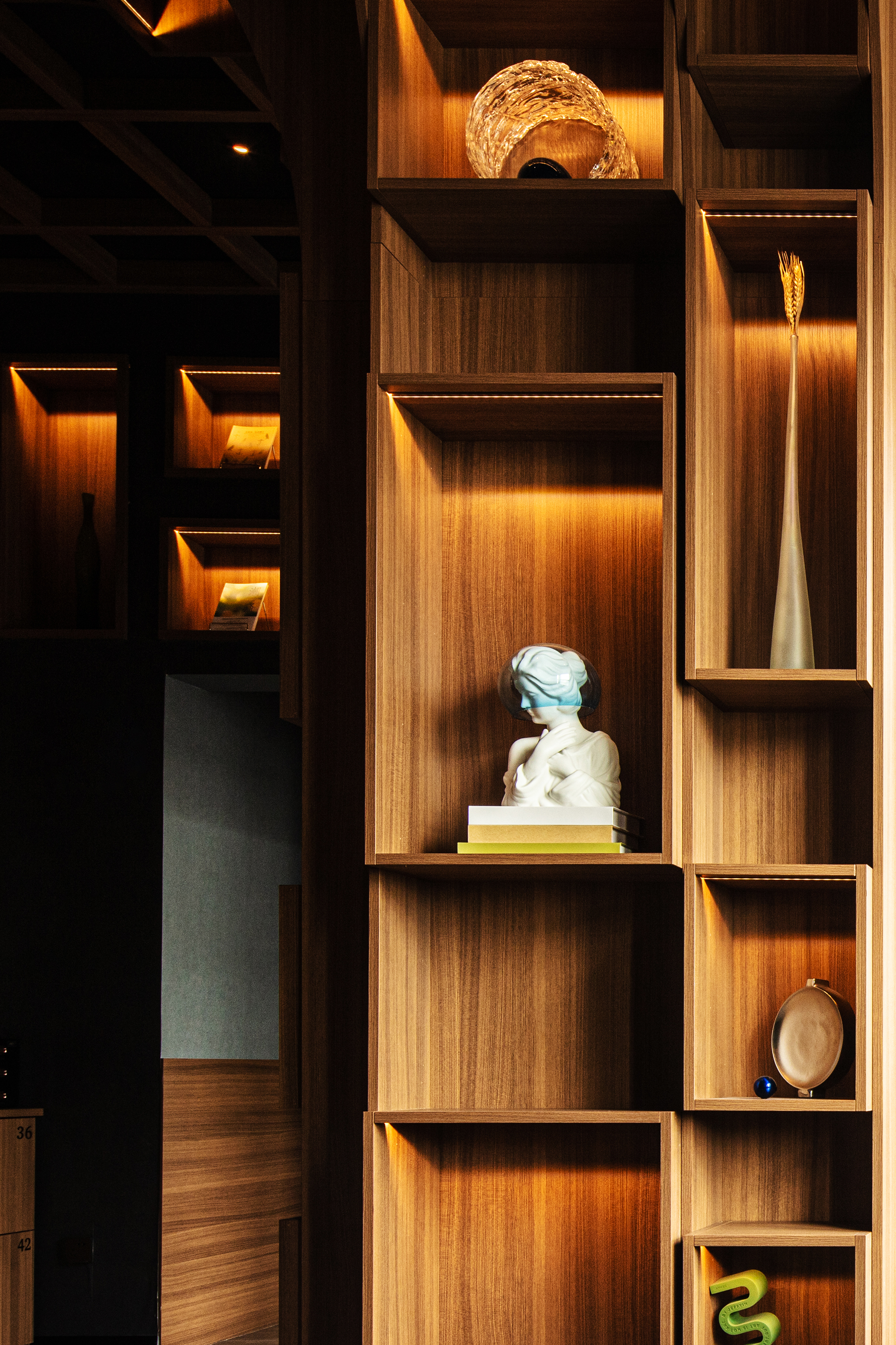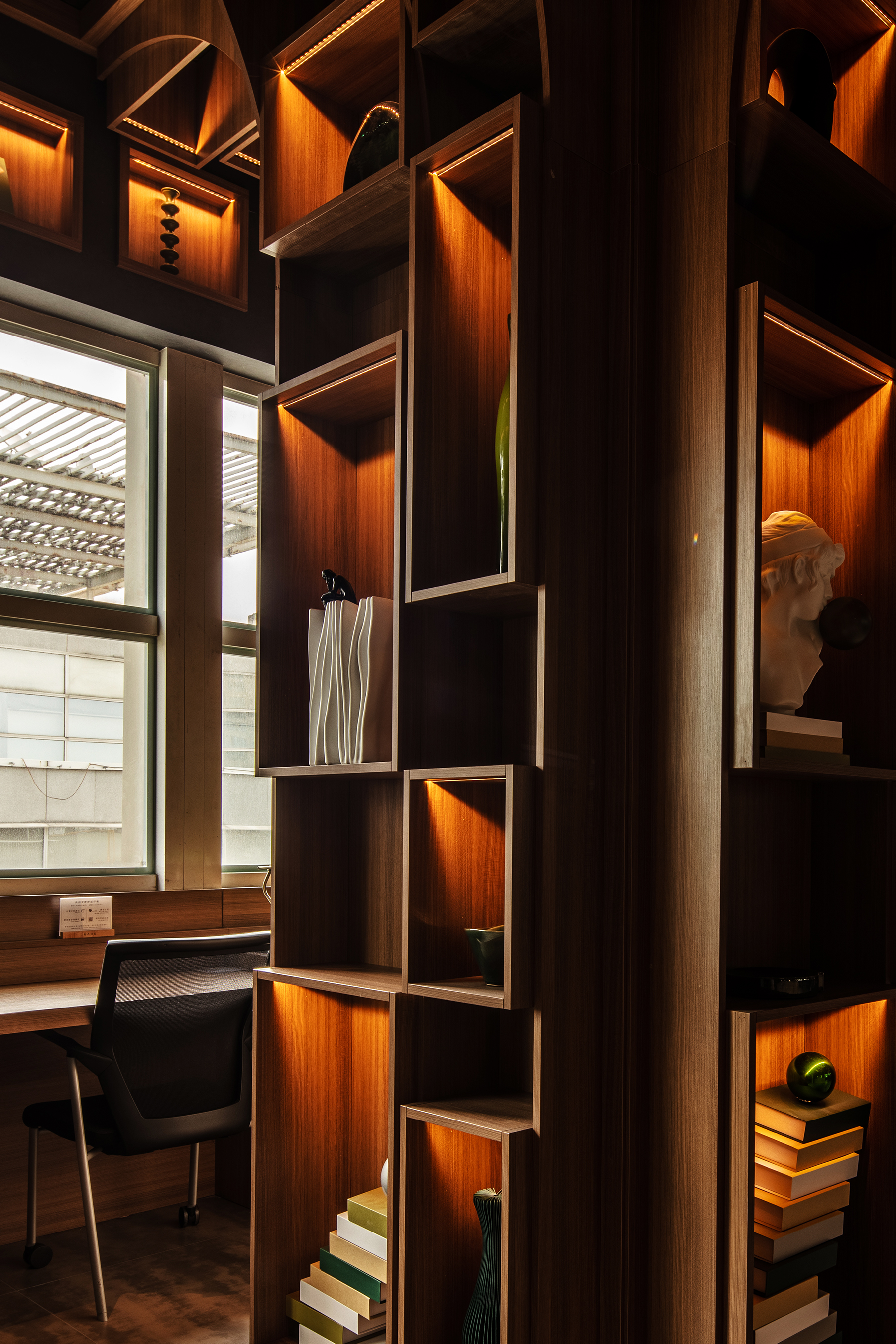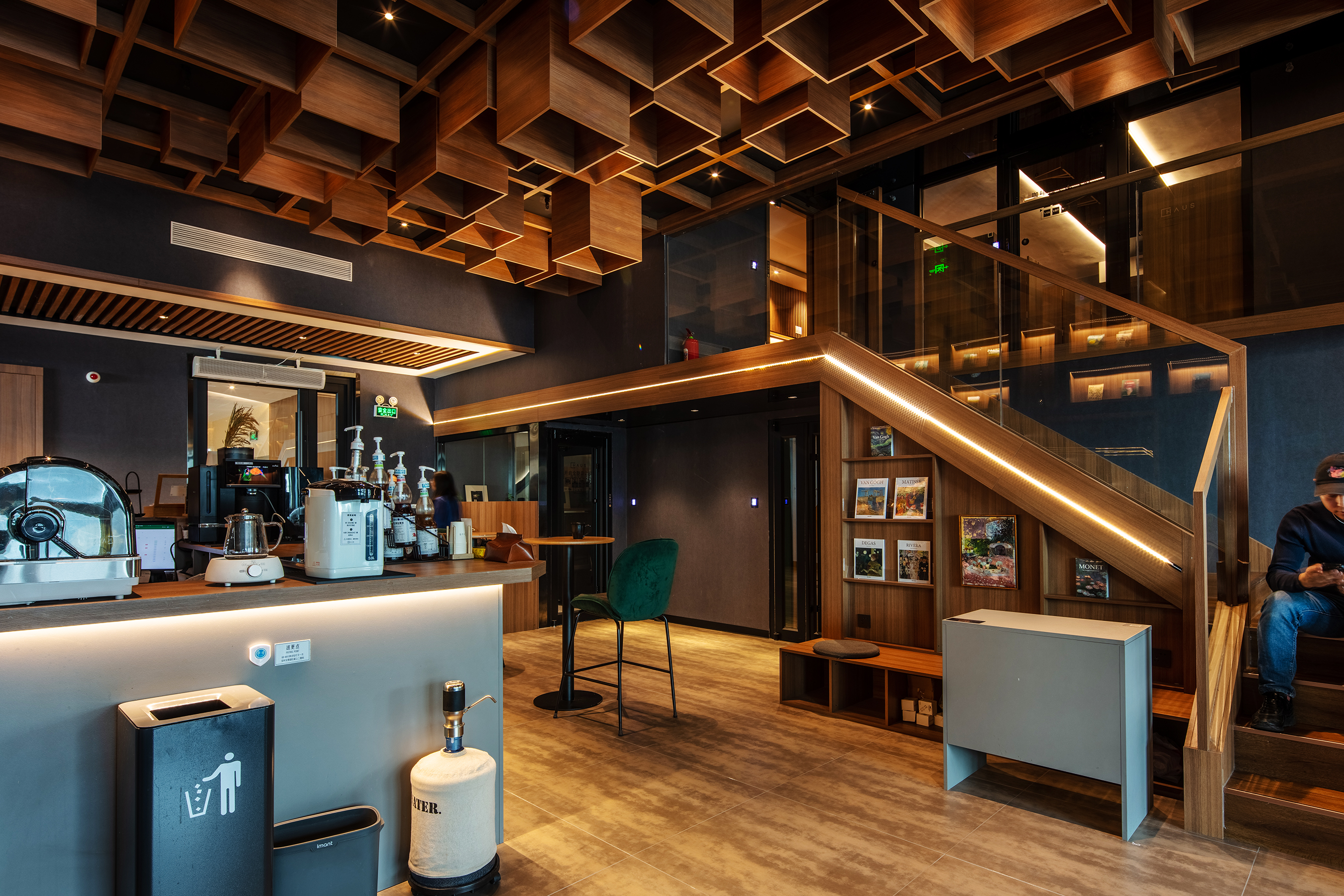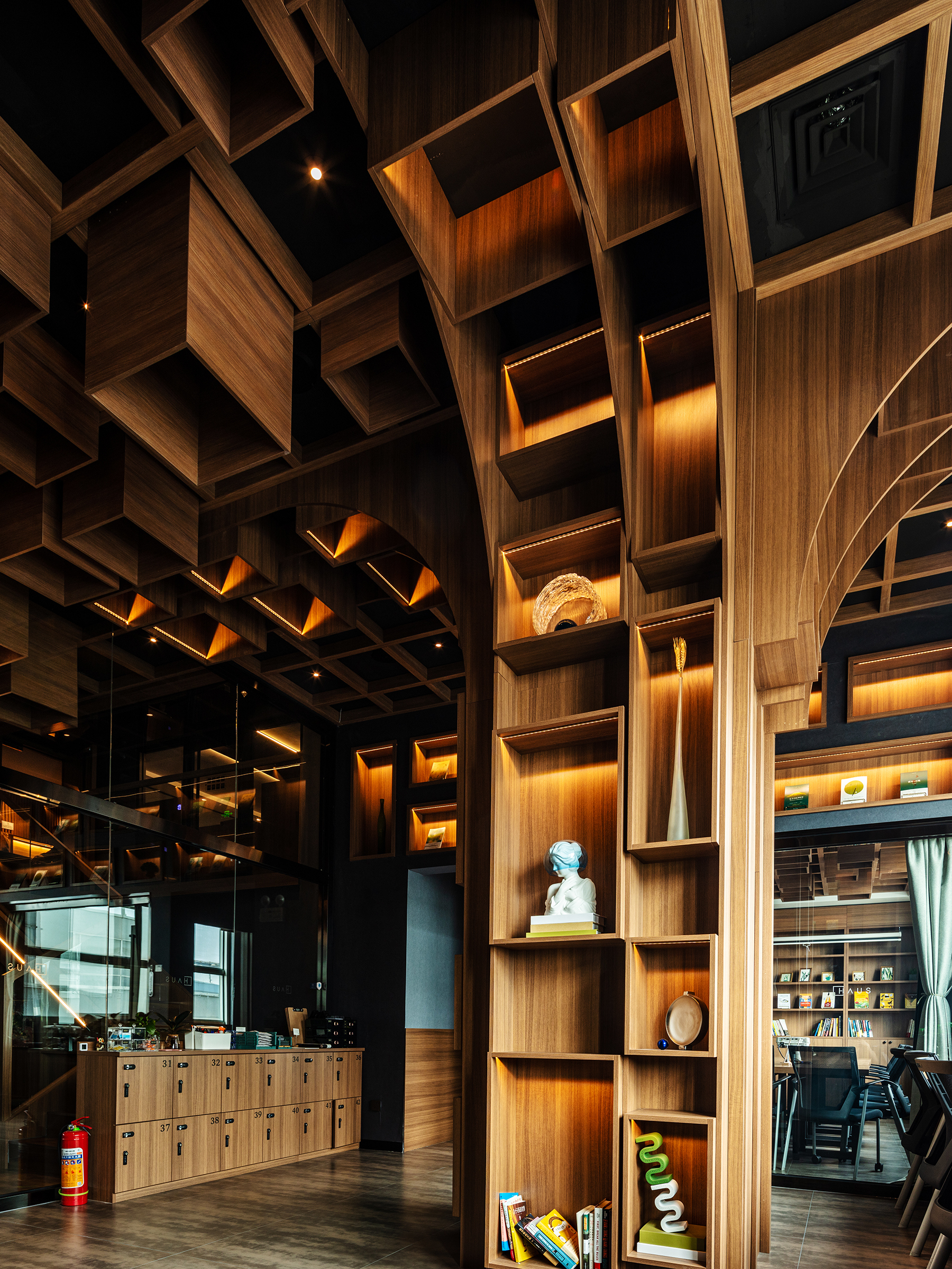 以L型半围合的阶梯平台,天花高低错落的“方盒子”,打破了吊顶的水平线,打破了空间的沉闷与厚重,增添了空间的灵活感,赋予空间共享氛围。