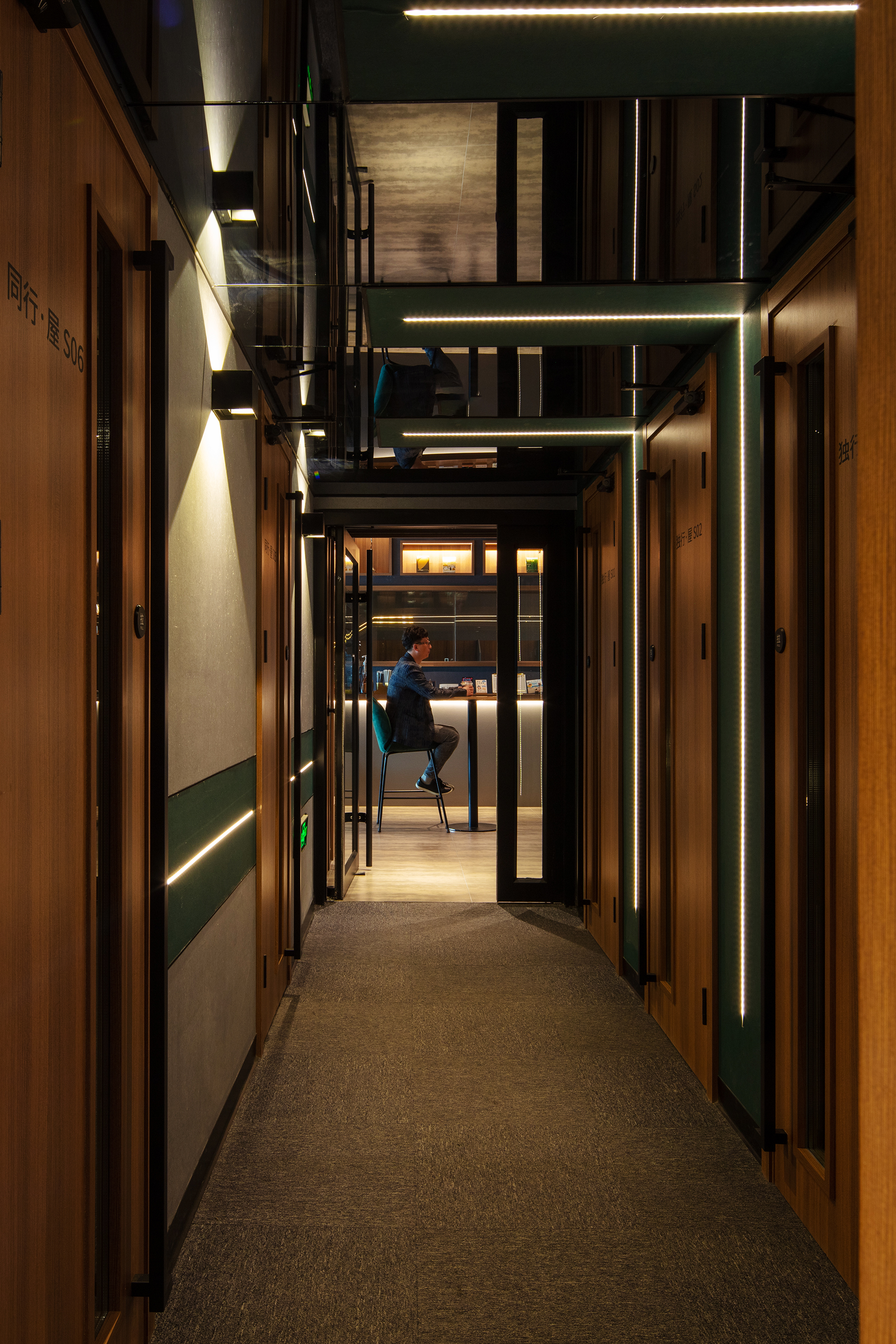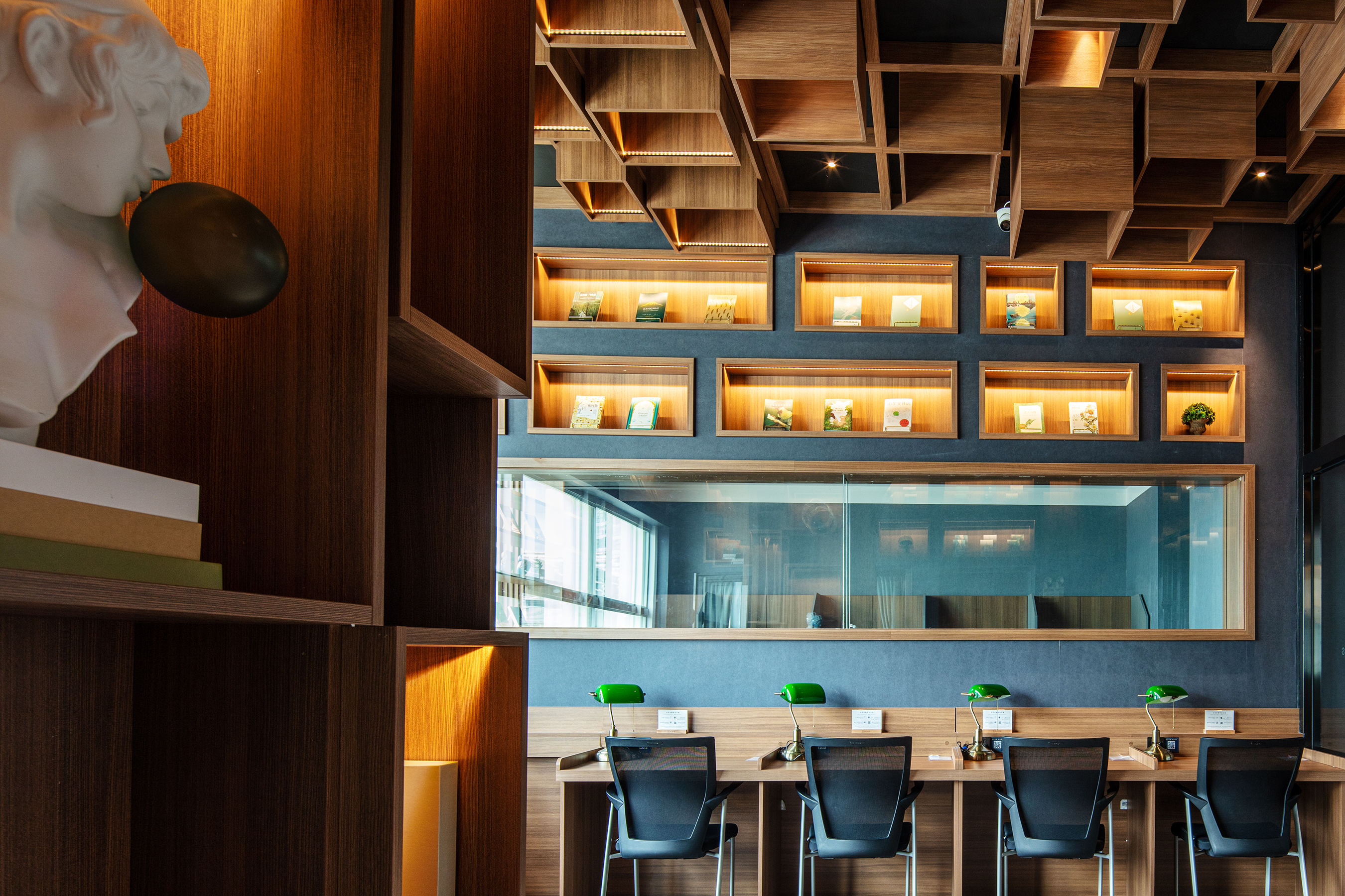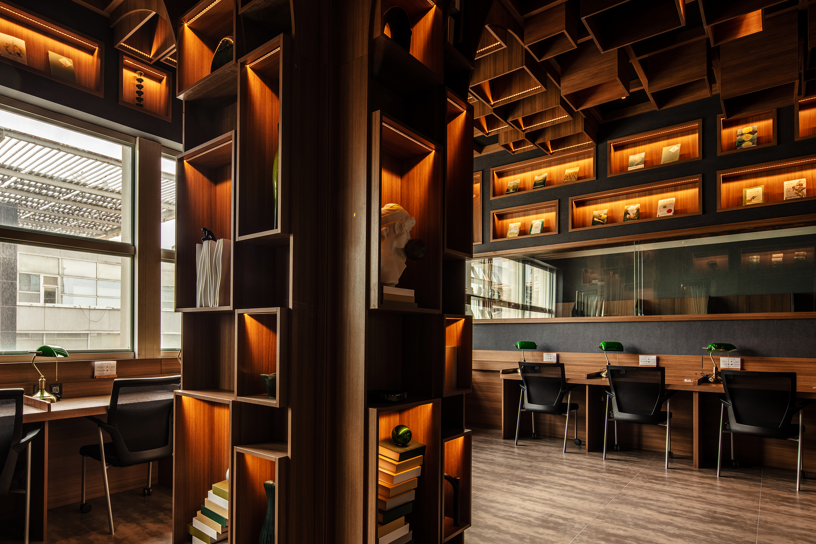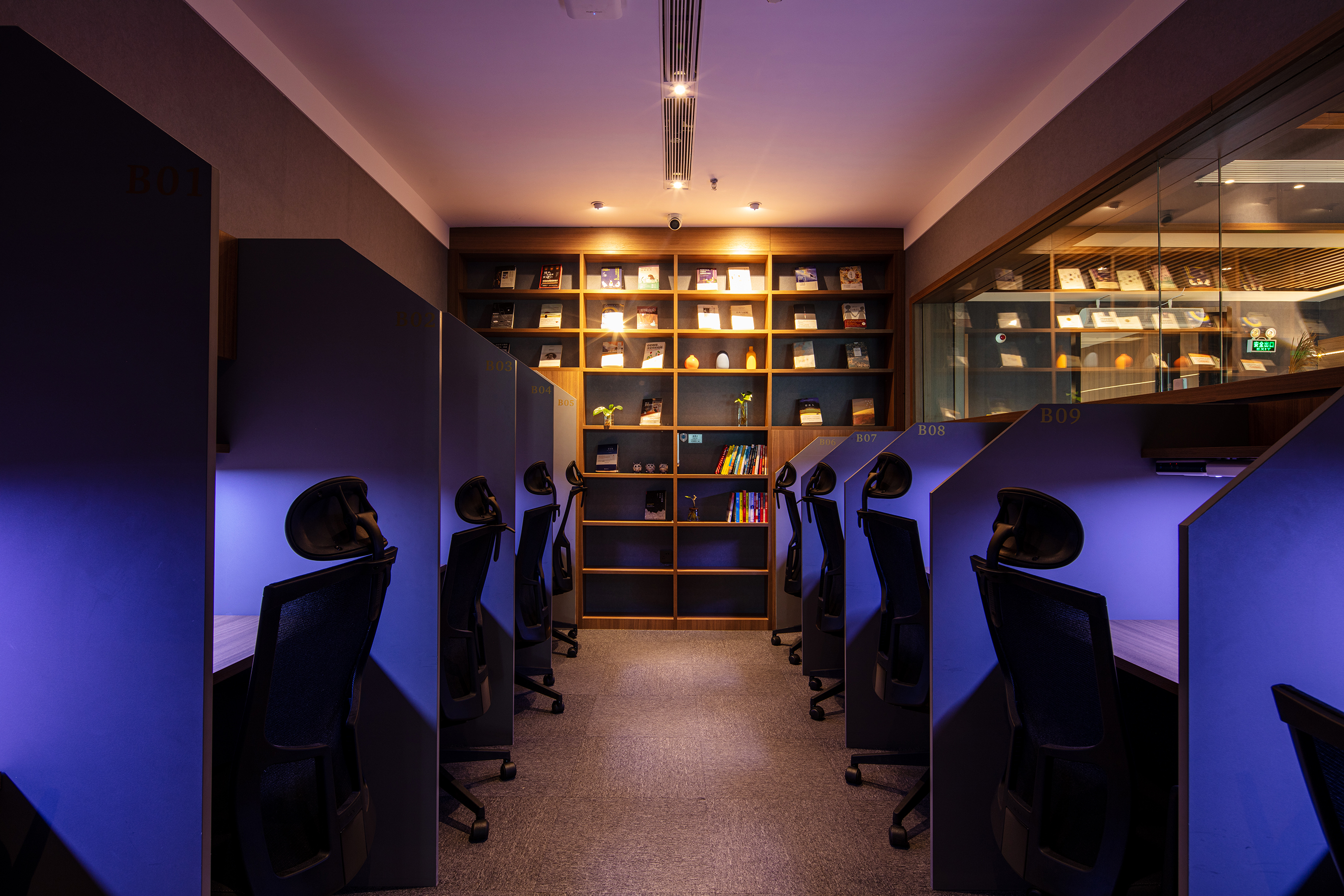 空间分为公共自习区和超静音室两个区域,提供了专业的学习环境和互渗的学习氛围,比起在家里学习更有效率和专注力。而超静音自习室由一个又一个小隔间隔开,每个书桌都设置了方便的供电插座,置物架,舒适的座椅,贴心又方便。为了增强其静音效果,特地设置了较少位置以控制客流,其墙体材质也采用了双层夹胶玻璃,减少噪音。
