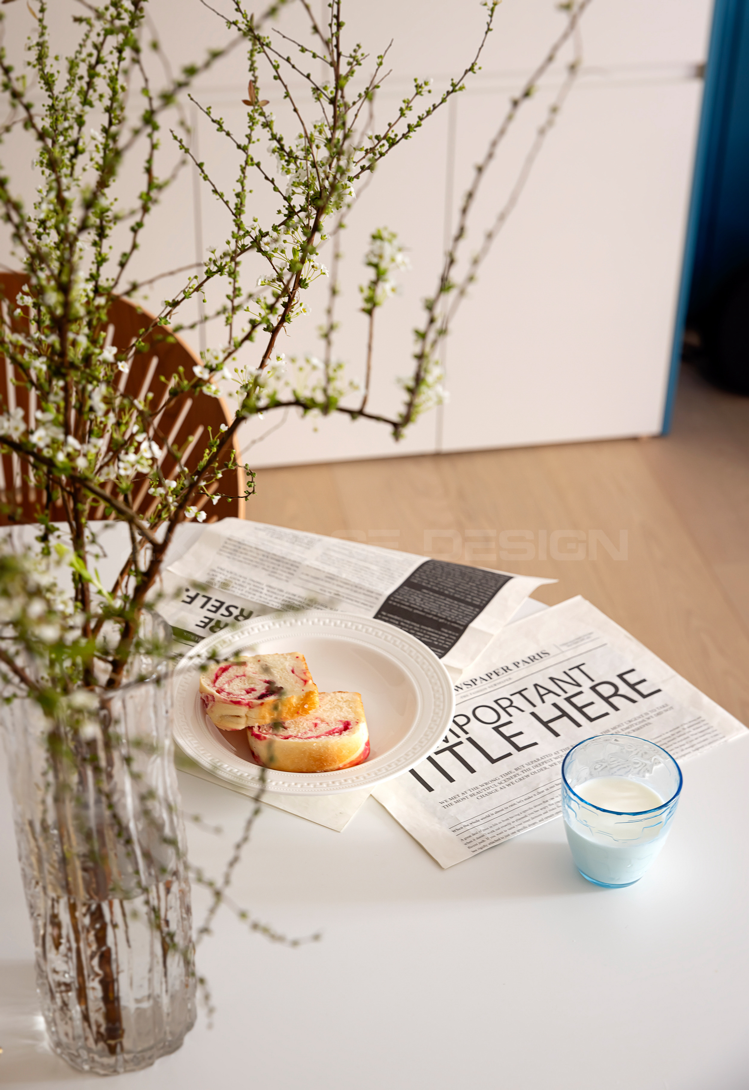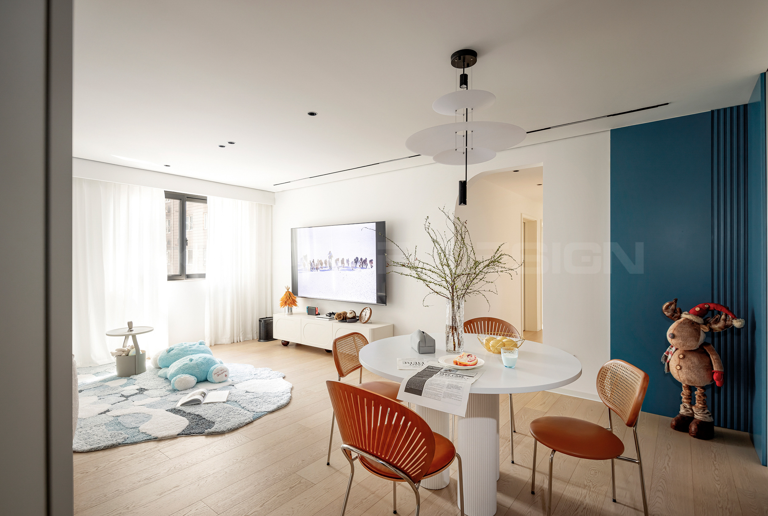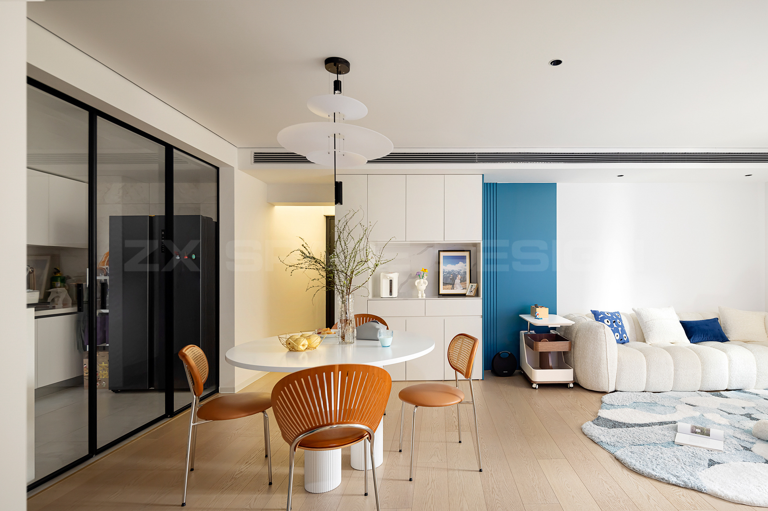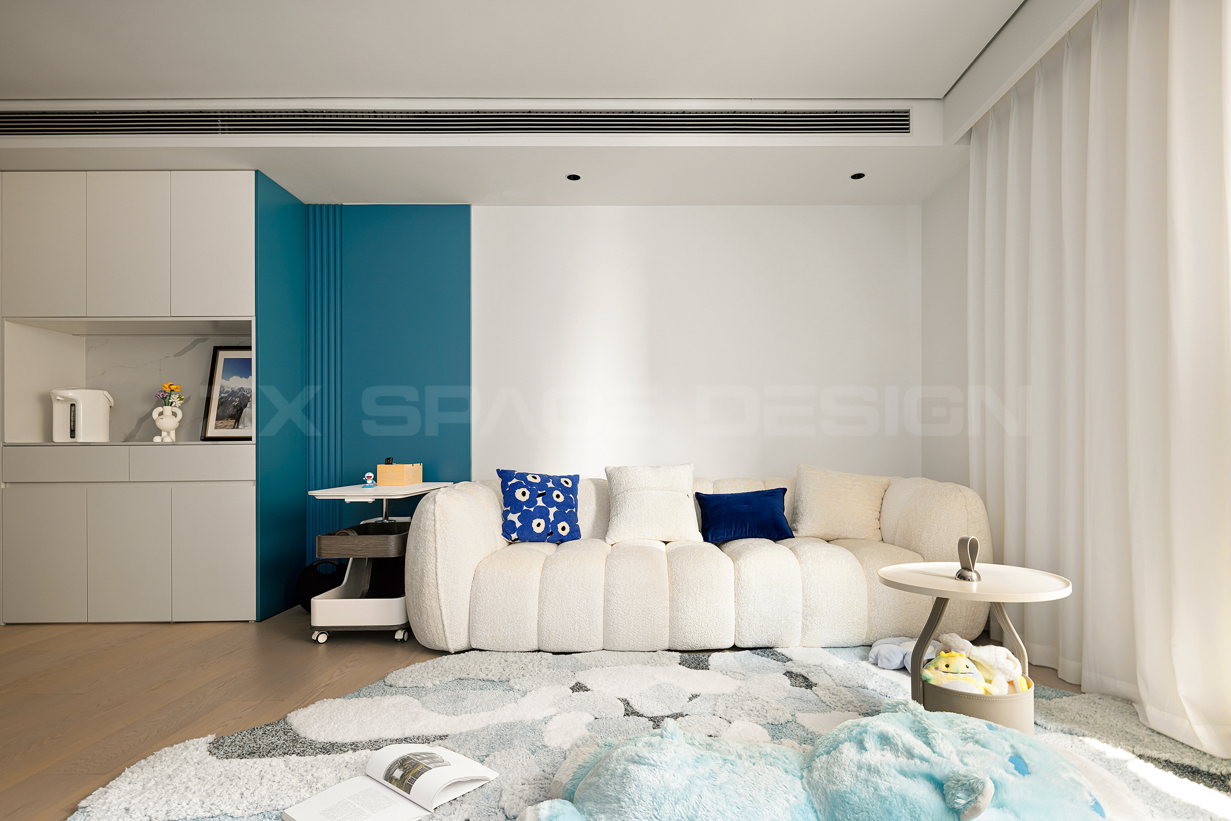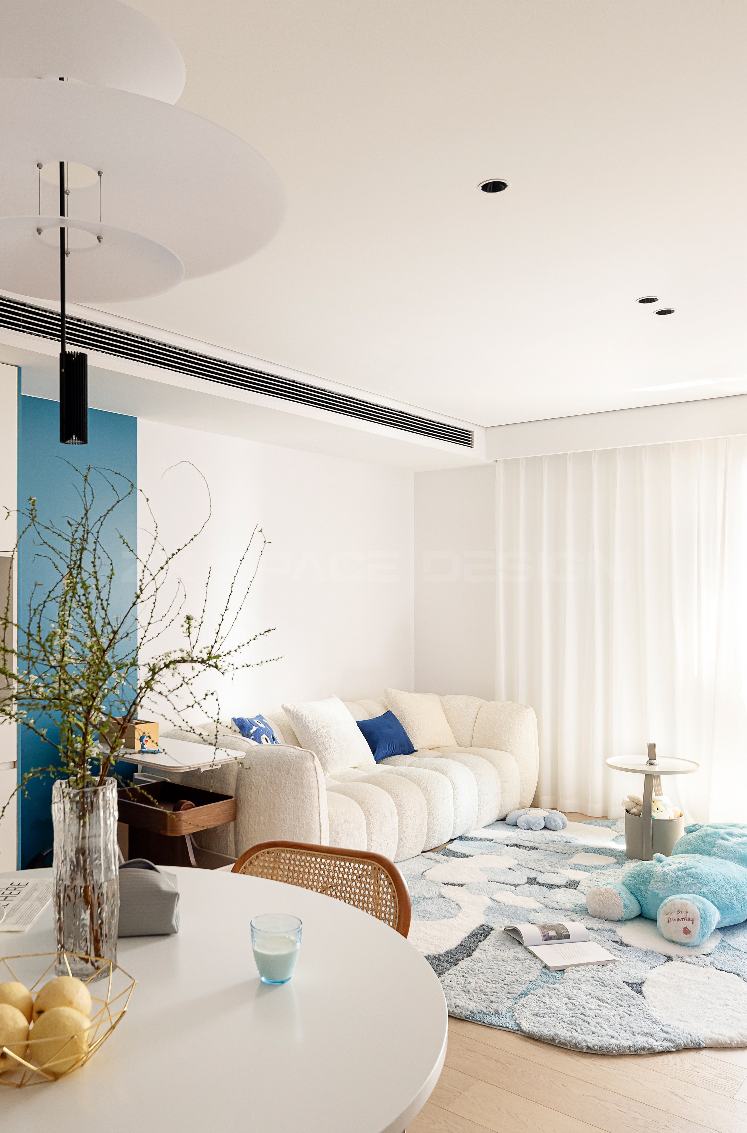 奶油色空间,以蓝色折角和同色饰品点缀。