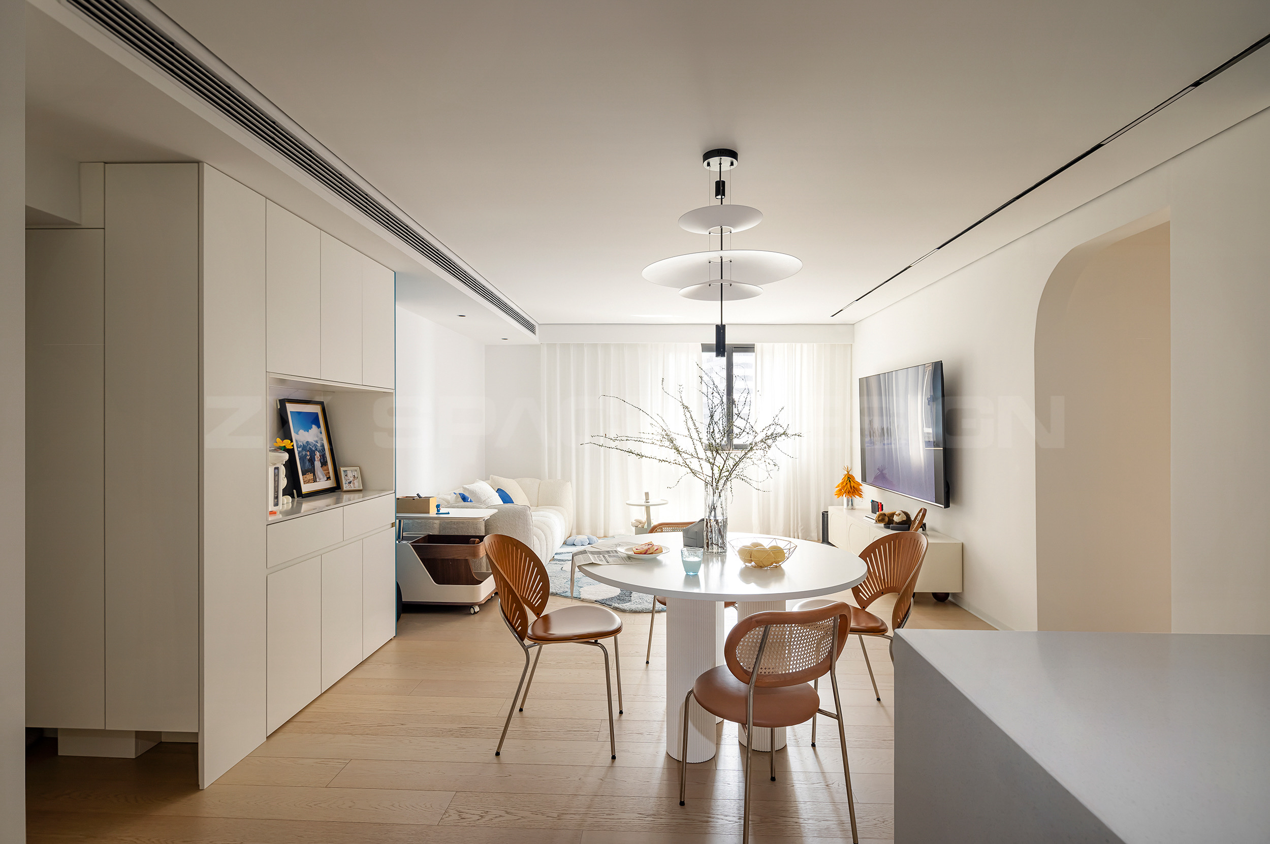 顶部做了长条状出风口搭配线形灯,拉伸空间后,客餐厅显得更大了。