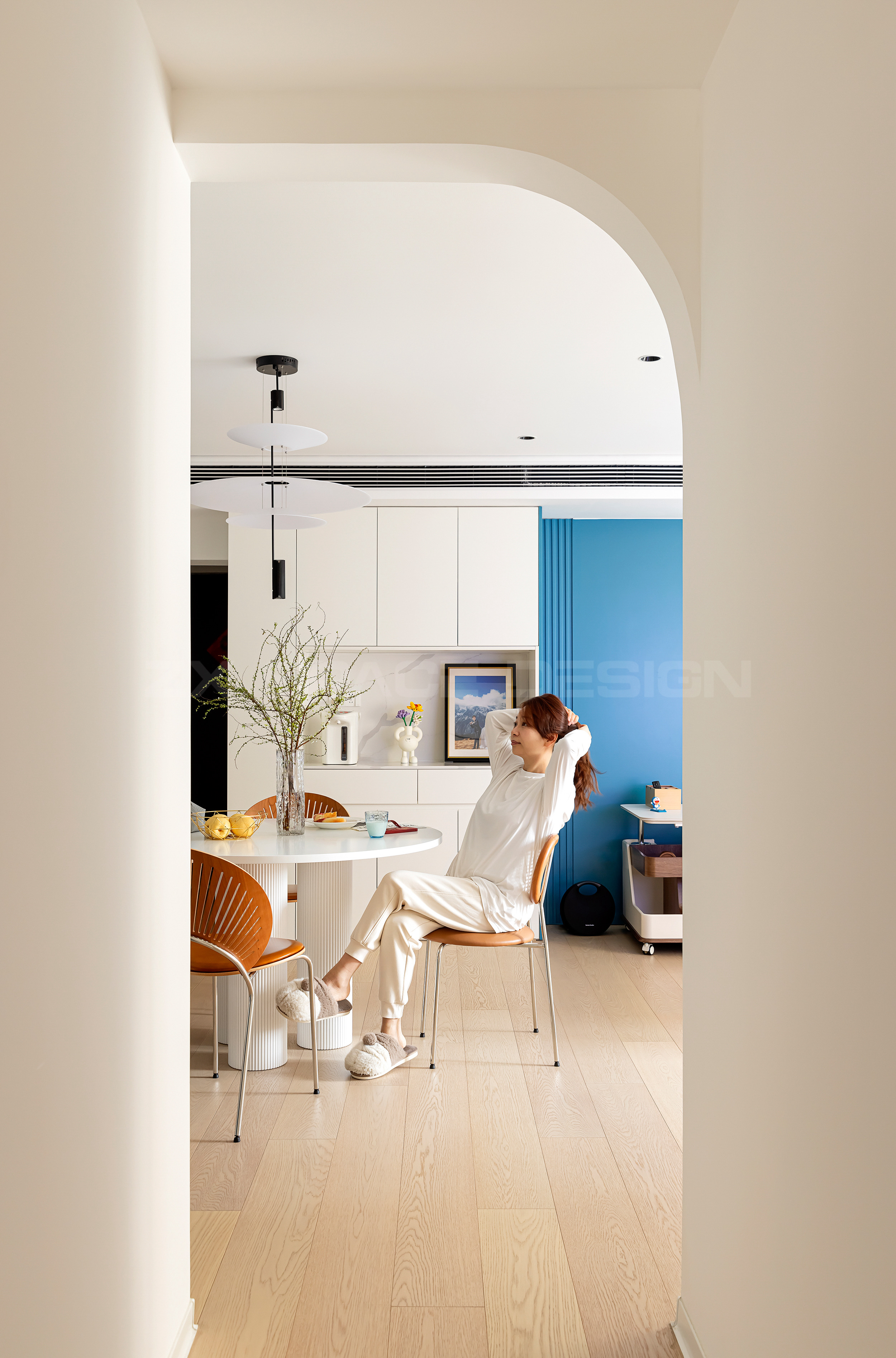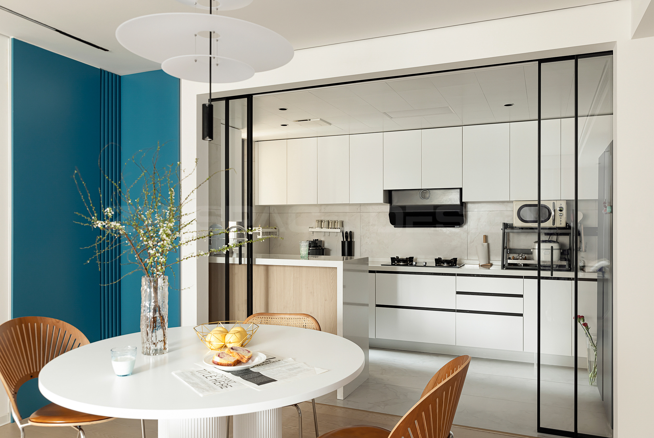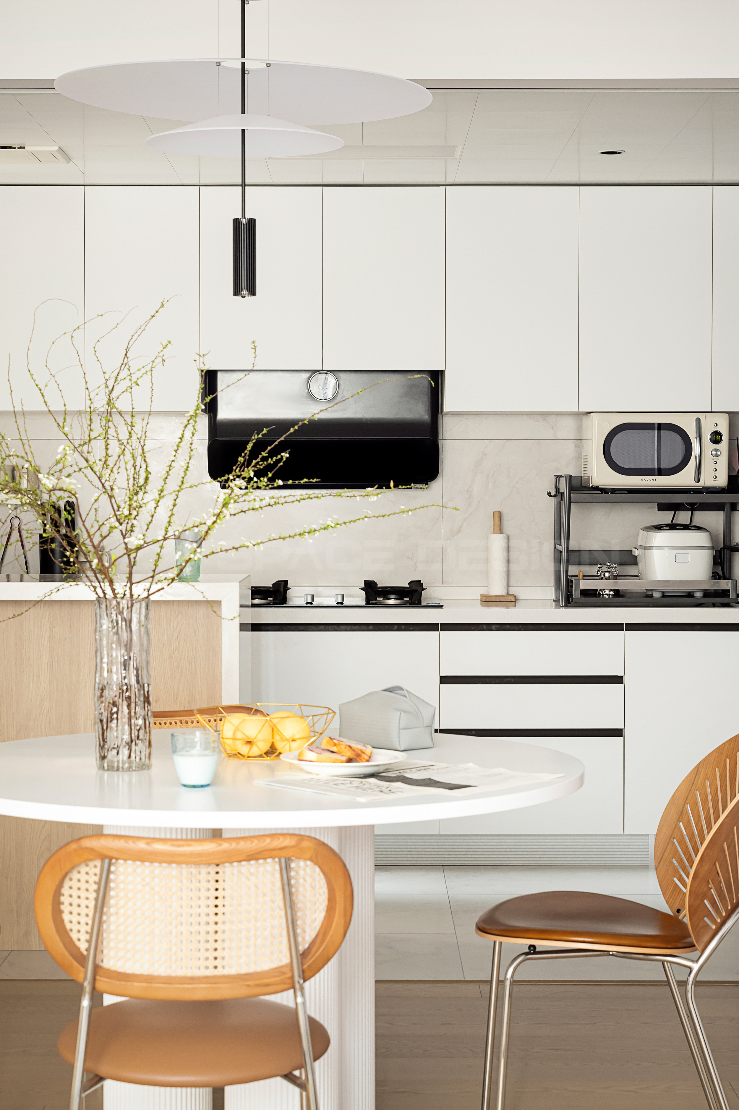 圆形餐桌和吊灯,柔化整屋偏硬的直线感。