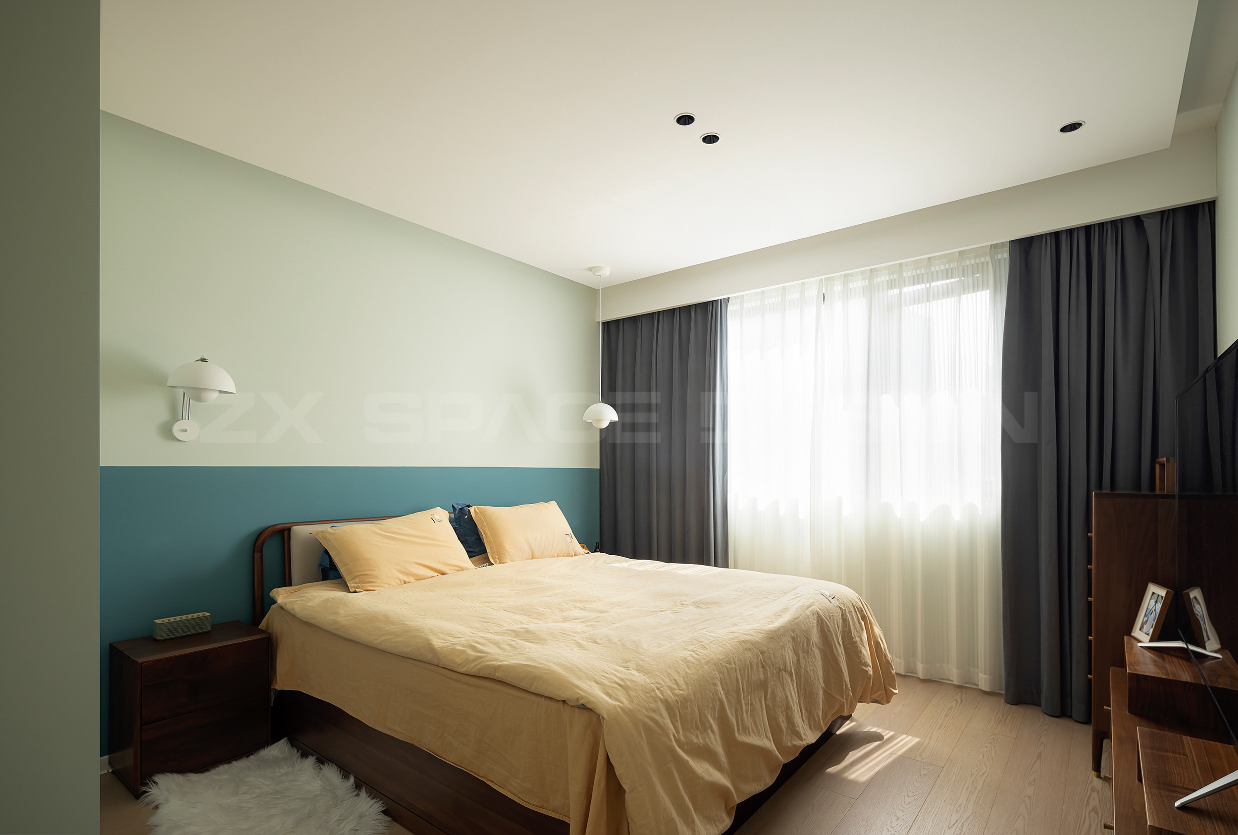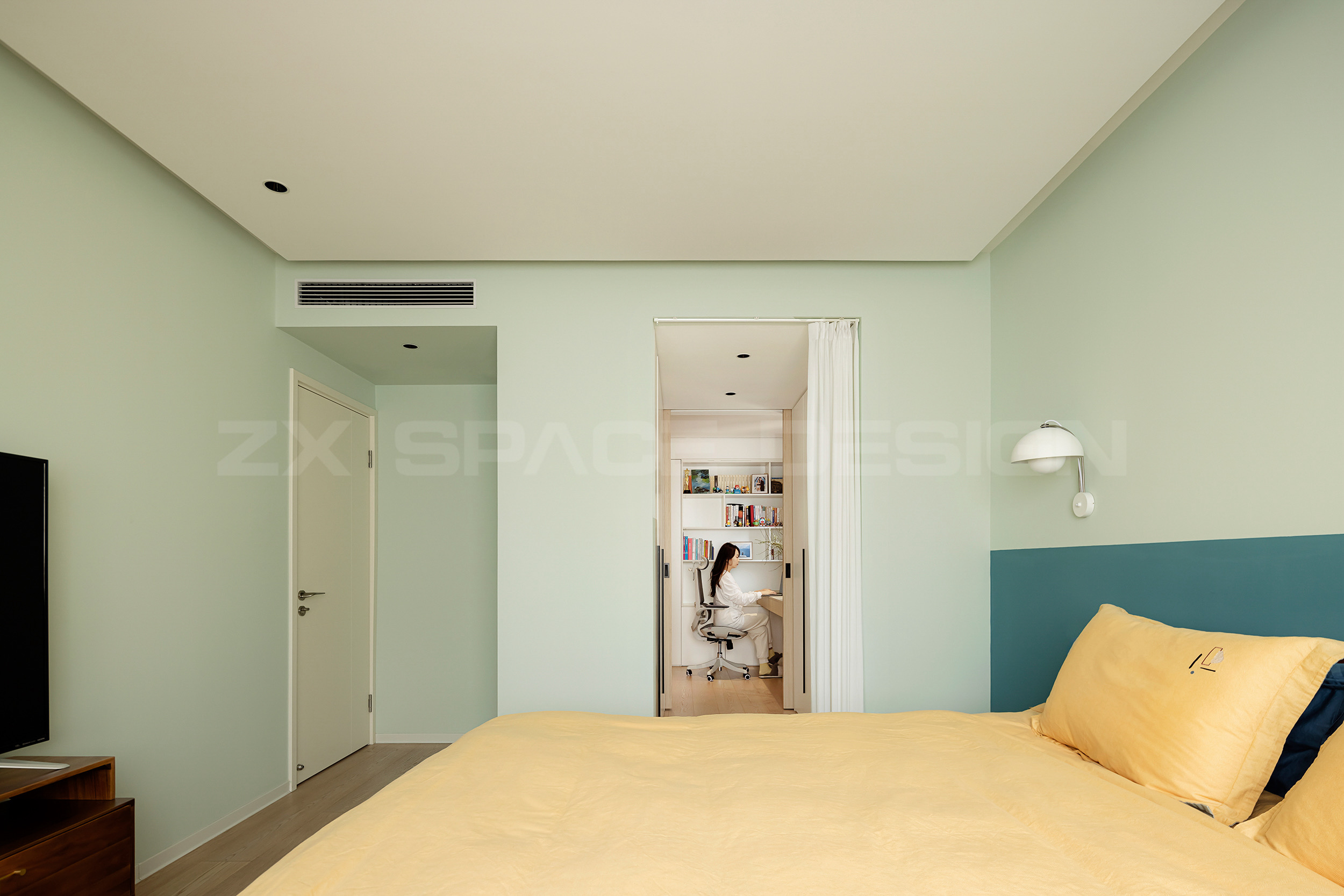 奶油粉绿和蓝色墙面拼色处理。