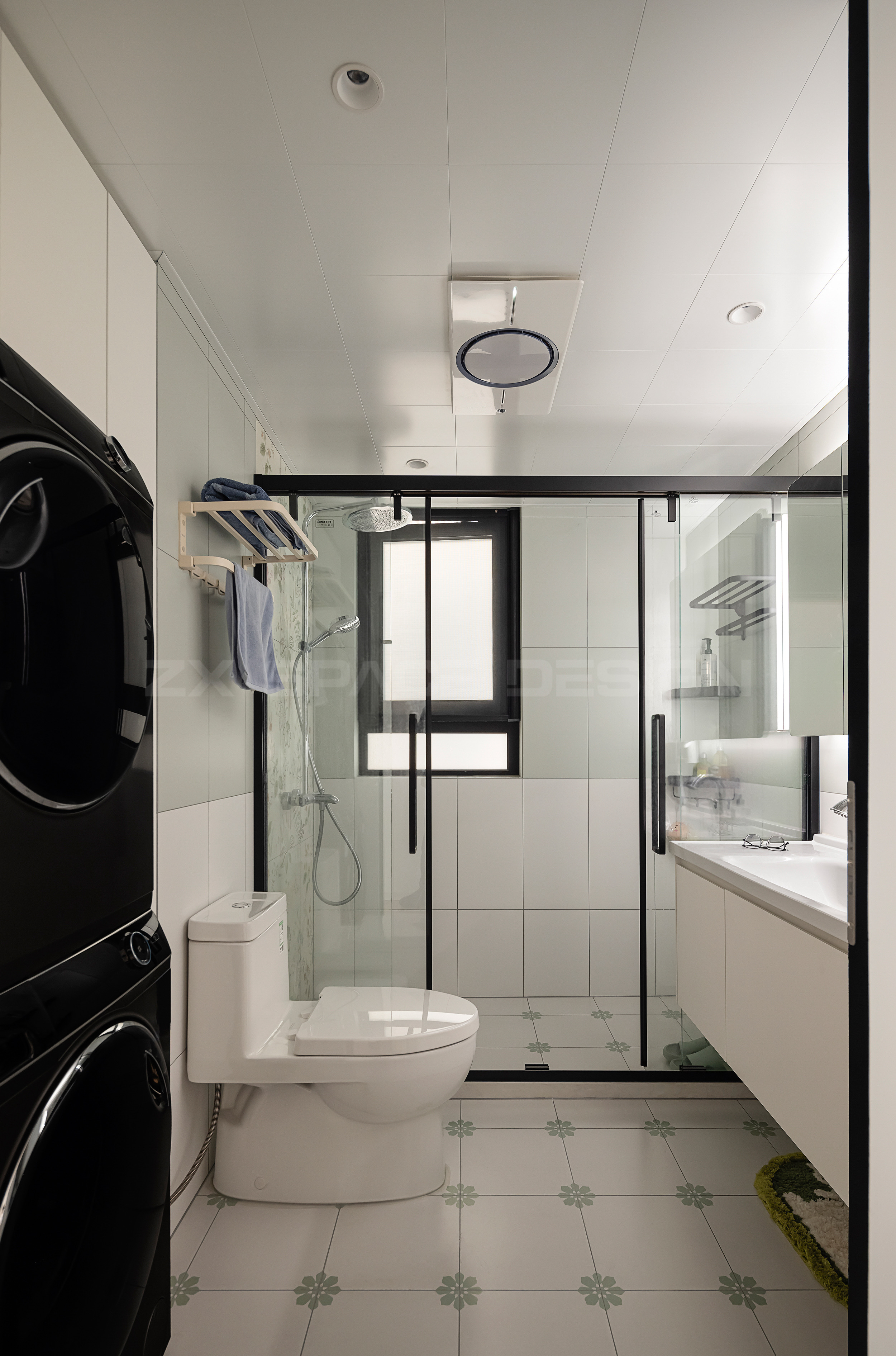 稍大的卫生间,布局洗烘机,干湿一体。选择了清新色彩的砖面。