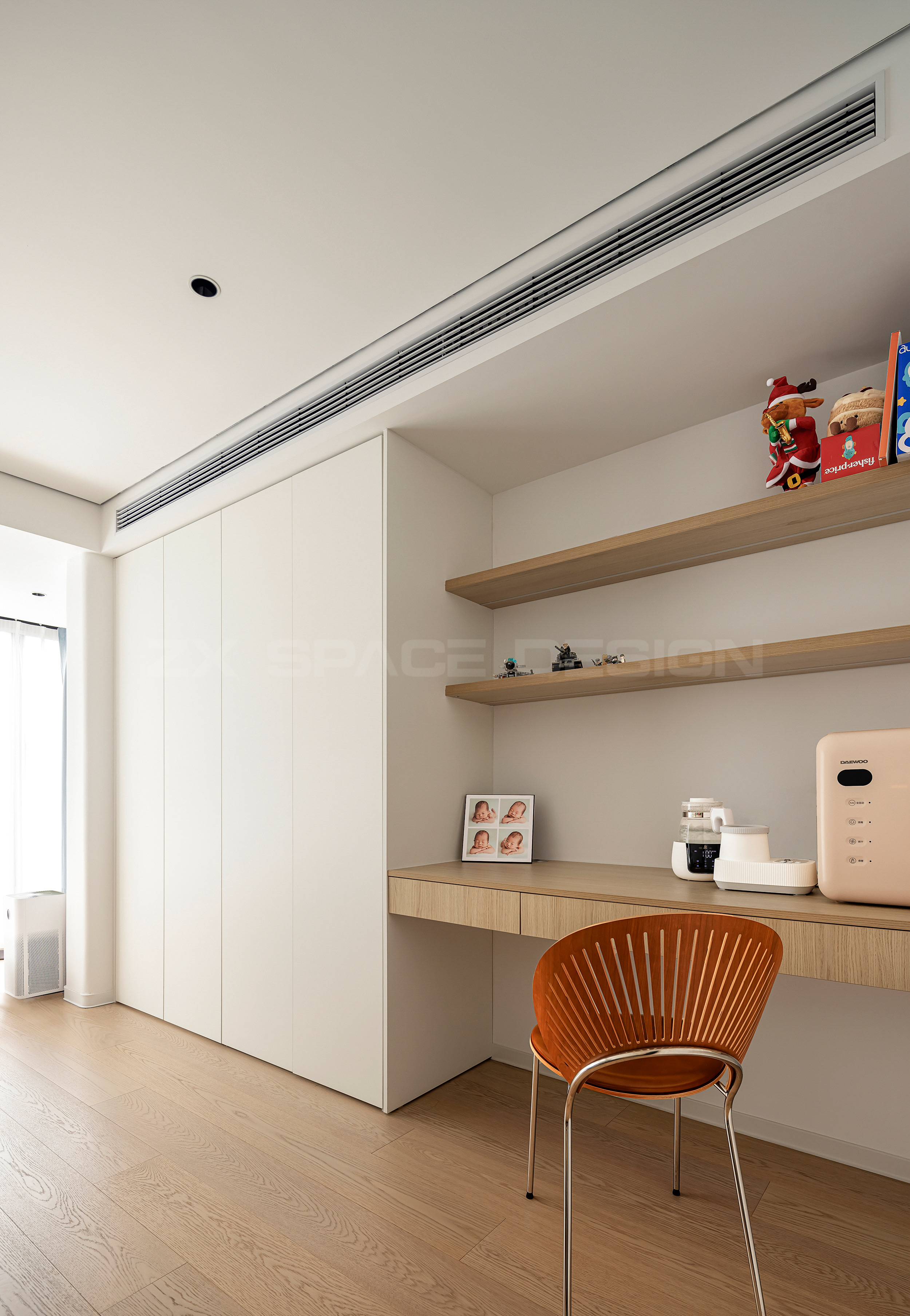 光线最好的一间带阳台的卧室留作育儿房,目前由宝宝和育儿嫂居住。充分的储物空间,长条台面非常适合放置育儿的小电器。
