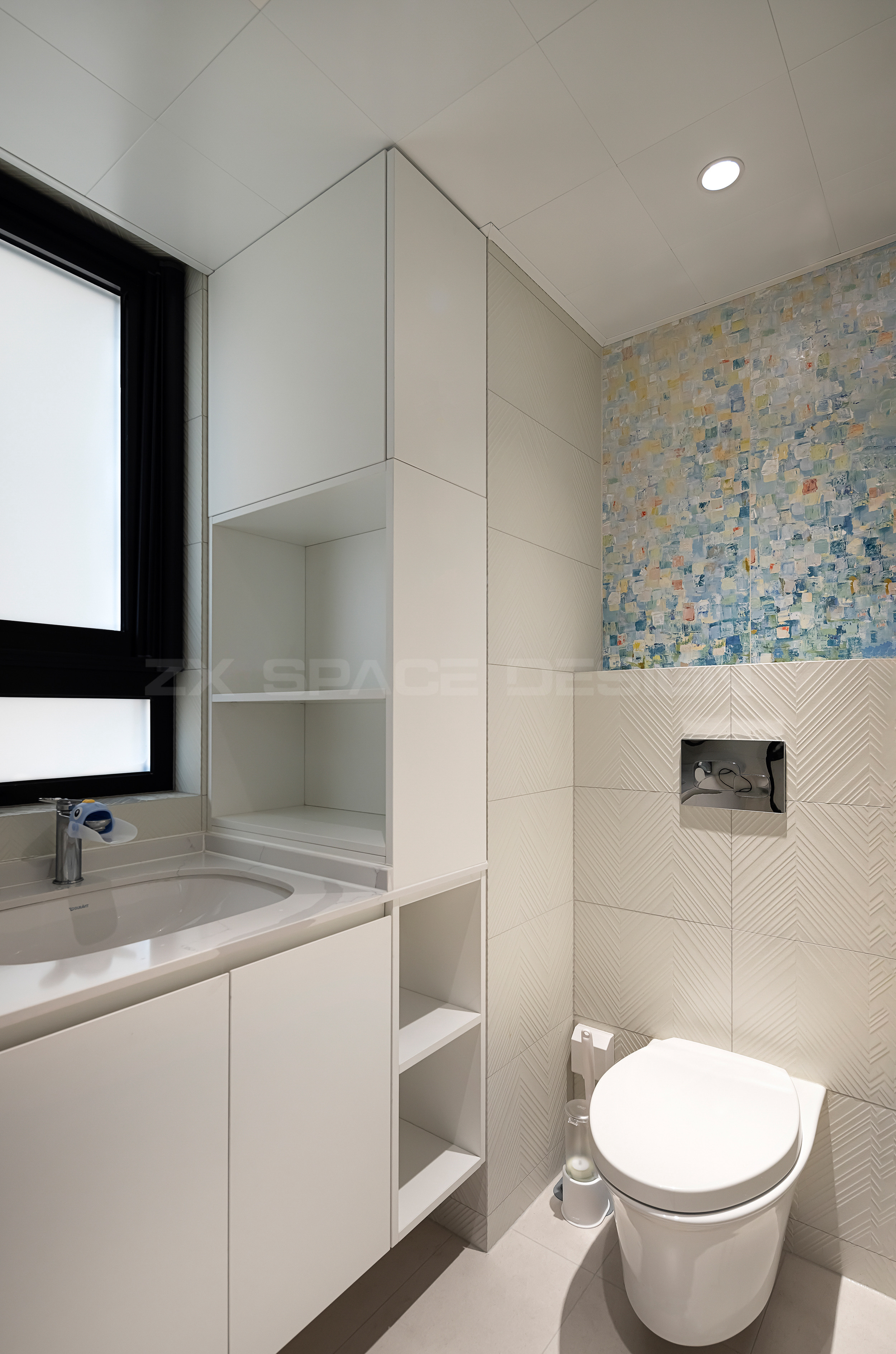稍小的卫生间,离育儿房更近,刚好作为育儿盥洗使用。抽象色彩砖面,为小空间增加浪漫元素。