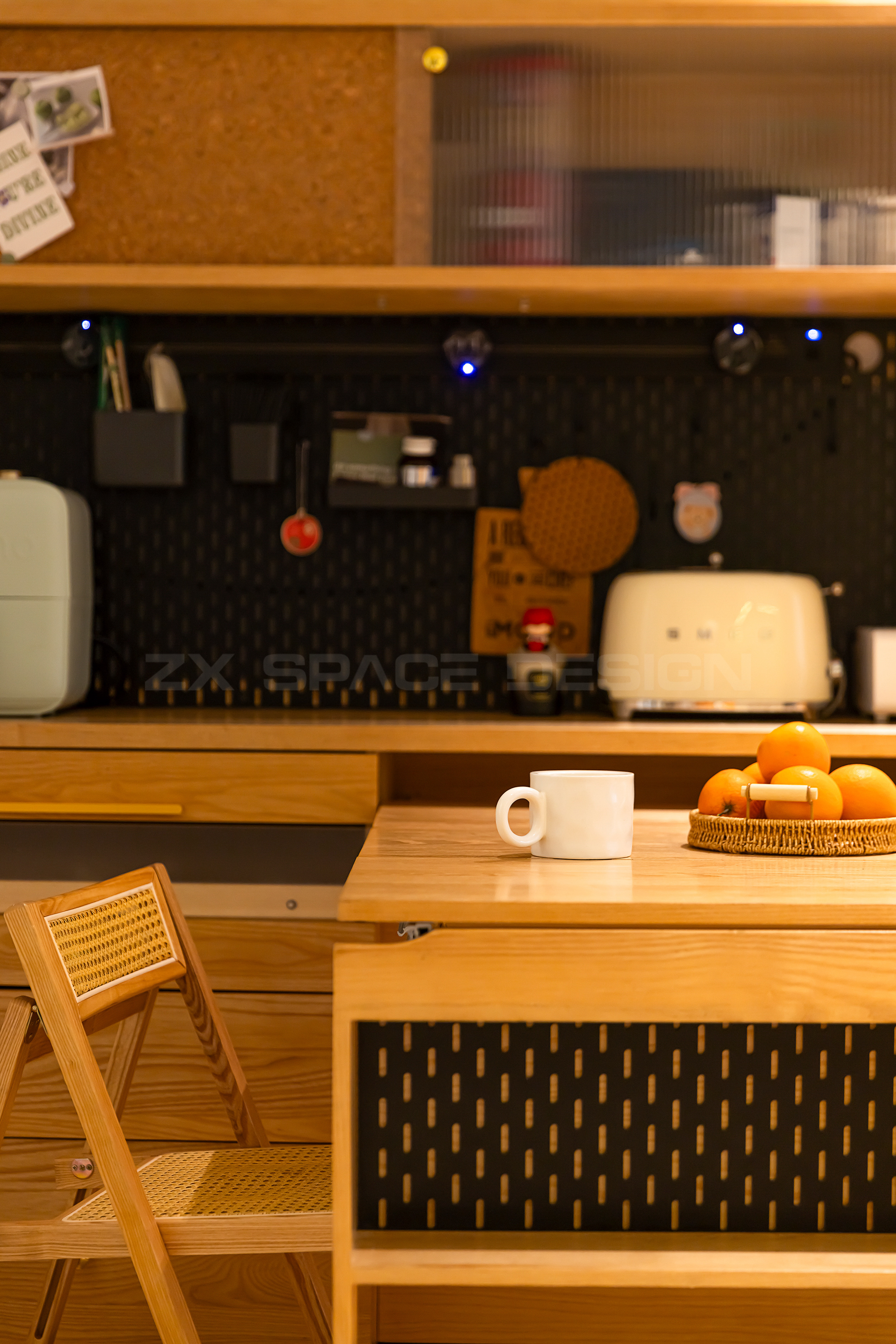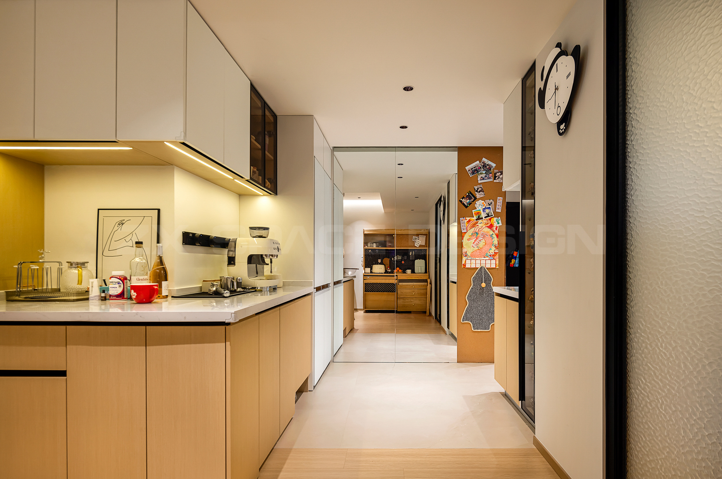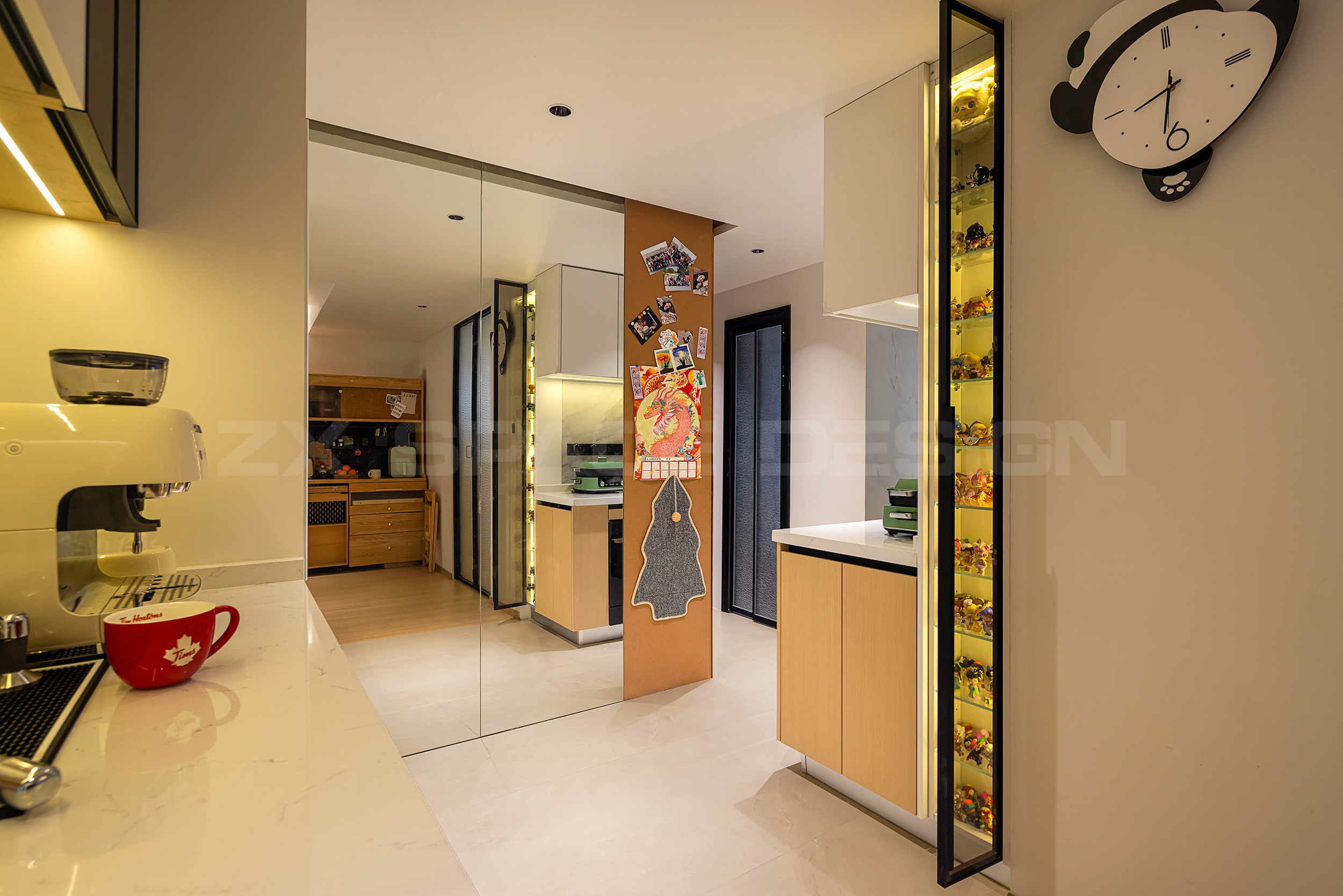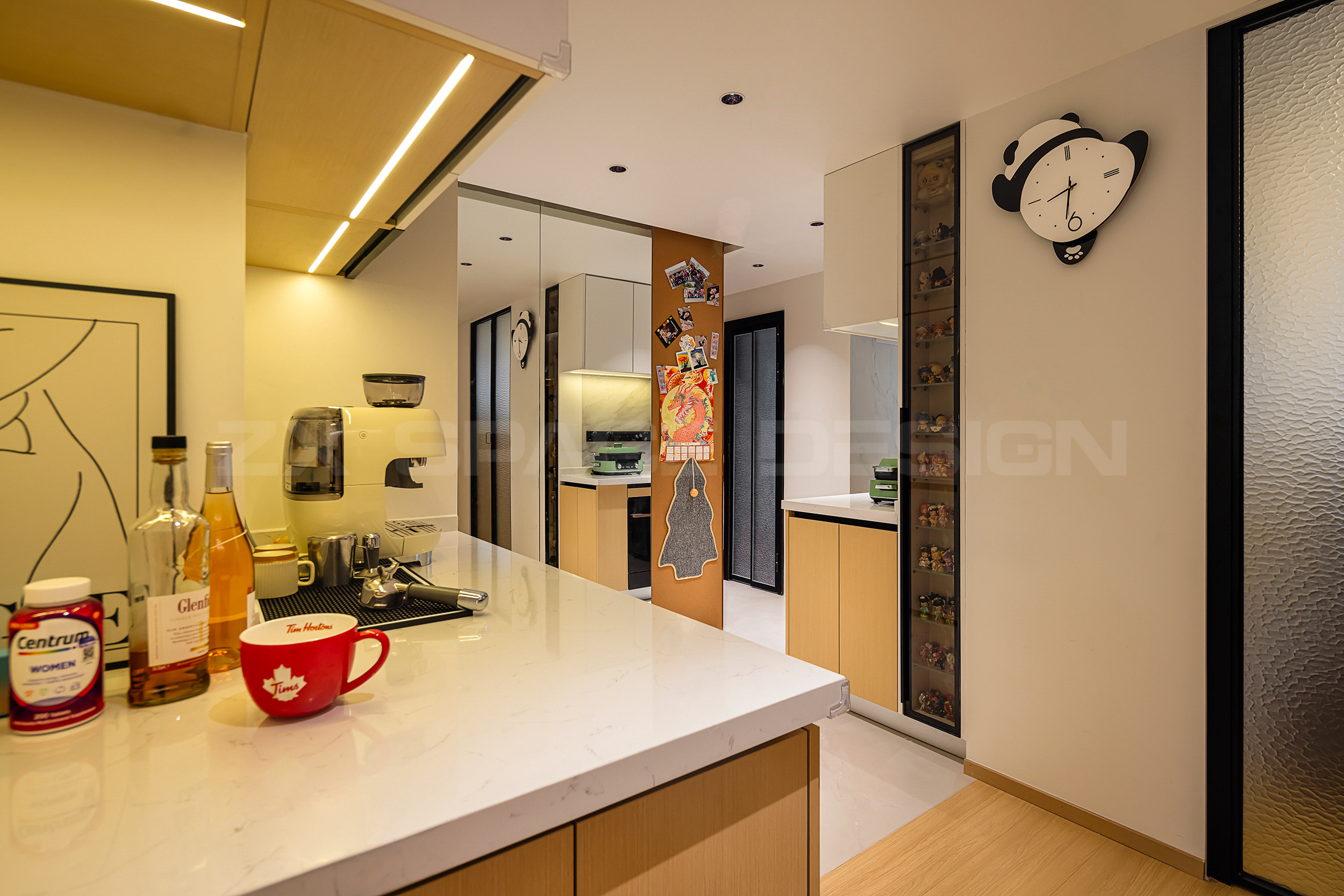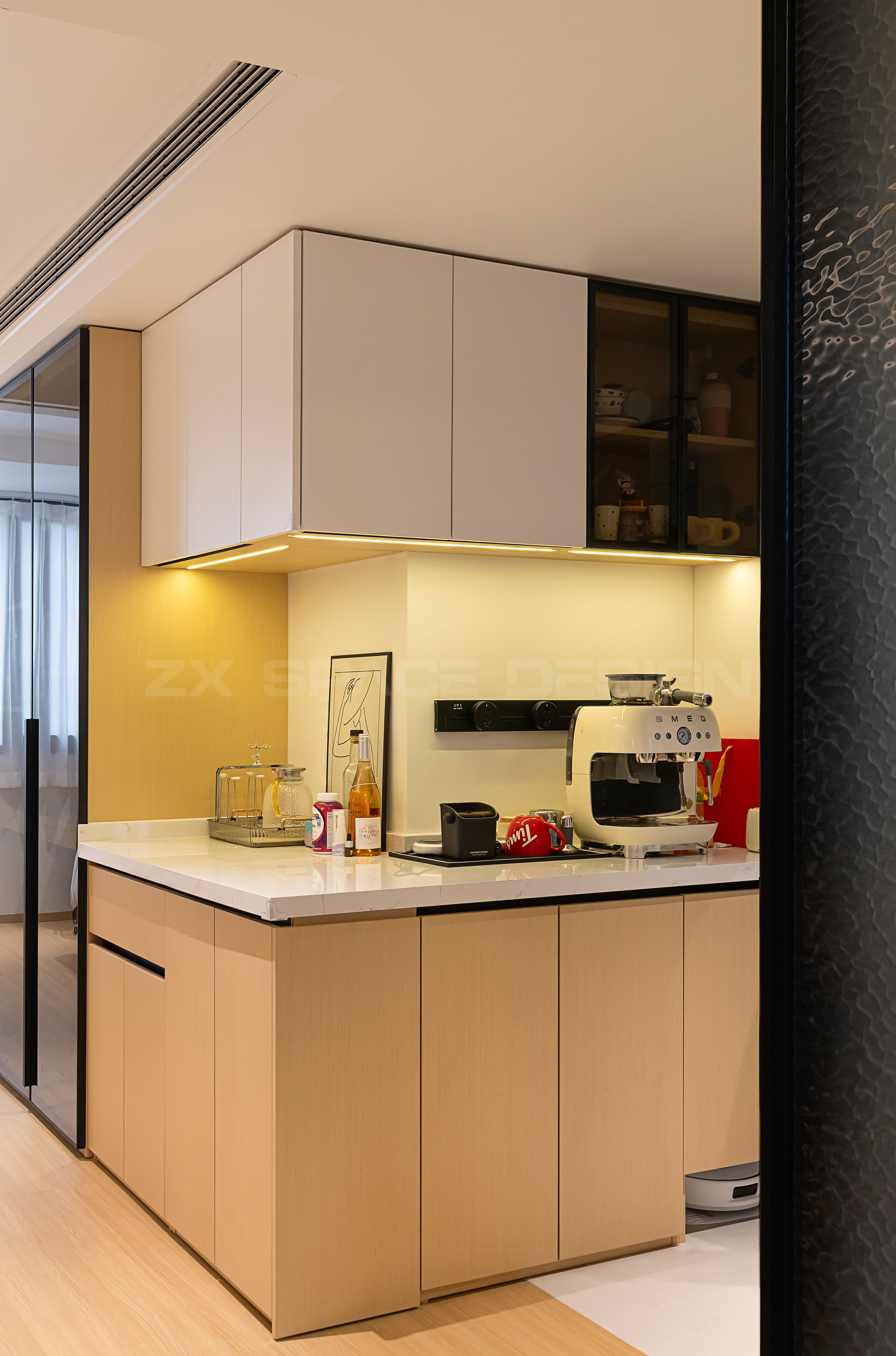 玻璃柜门和开放柜,超适合放置零食和小家电~面包机、咖啡机。