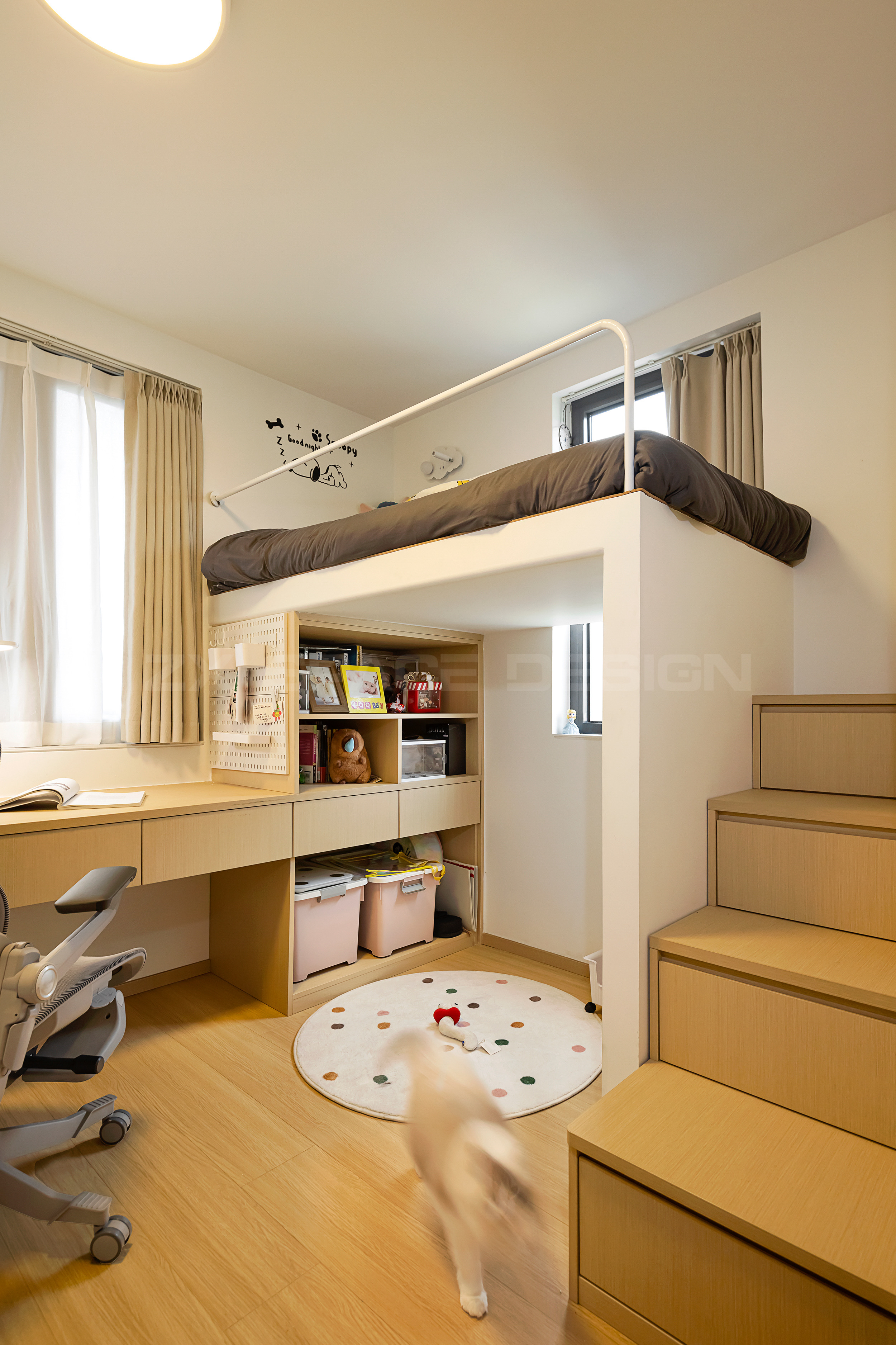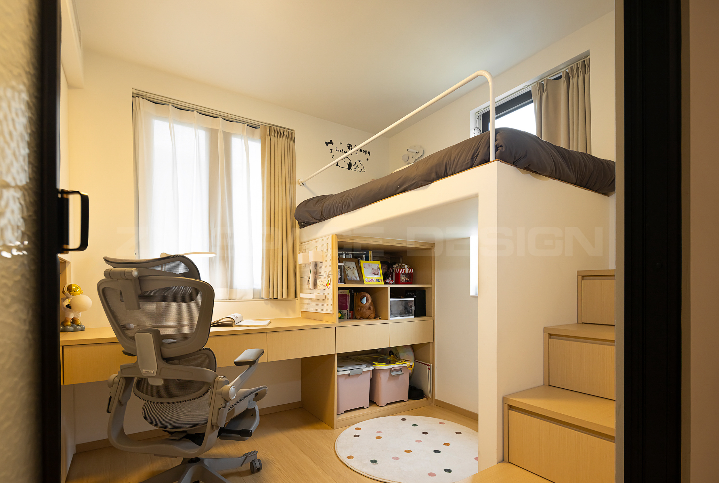 搭建一层半床体,左侧的整体衣柜、中间的书桌、床下的柜体、楼梯踏步柜体,统统不浪费,变成有效储物空间,是原房间储物体量的三倍。