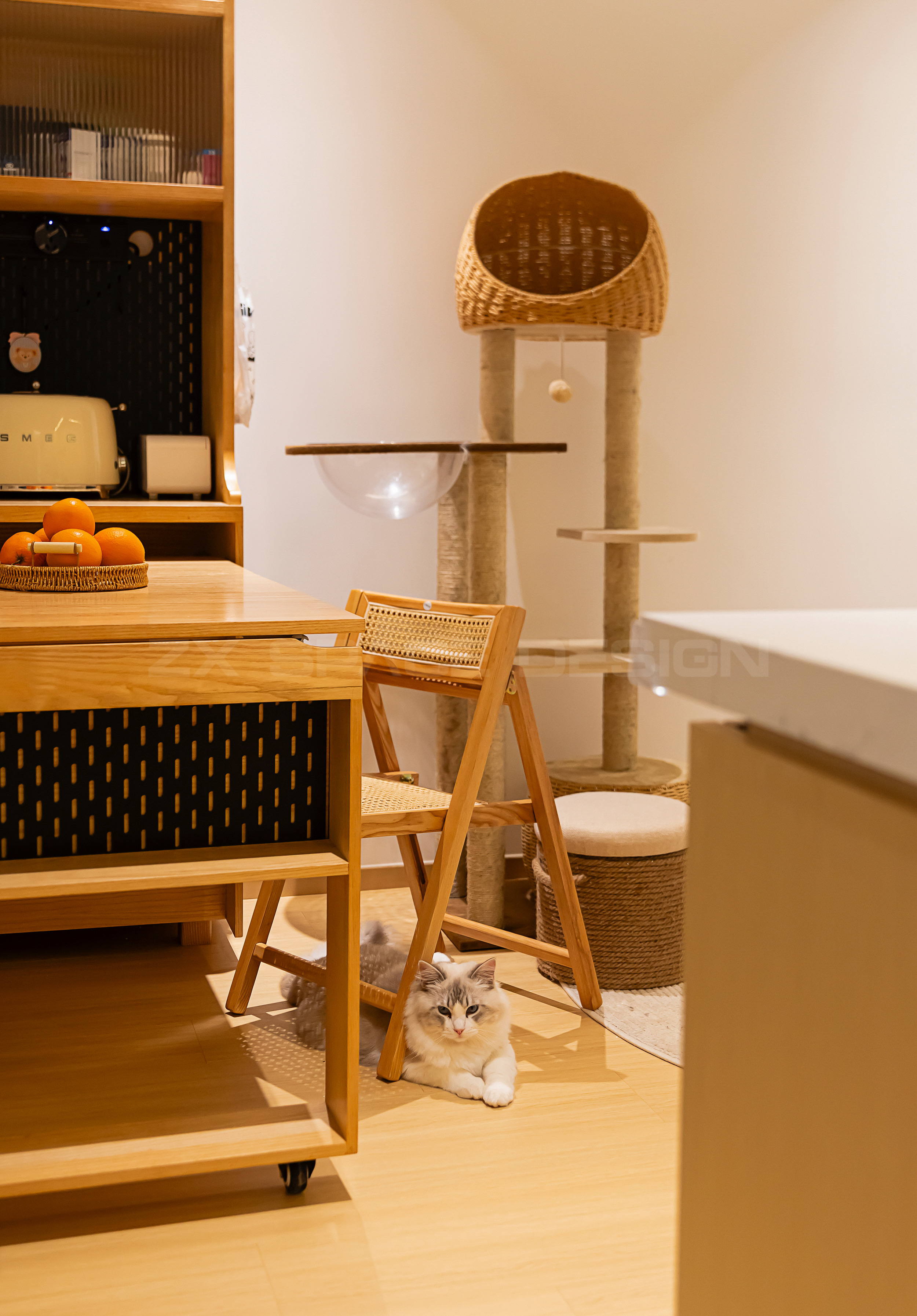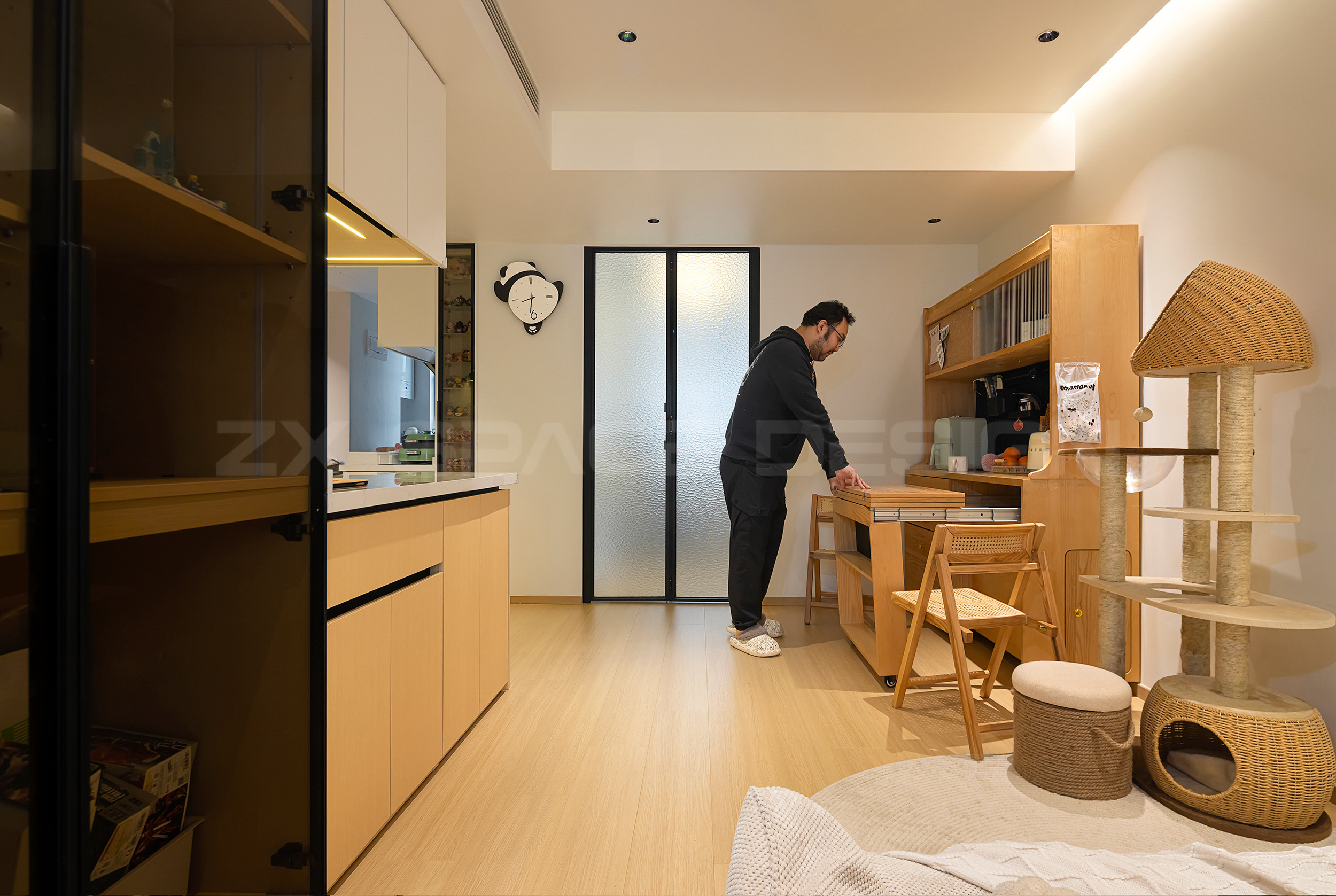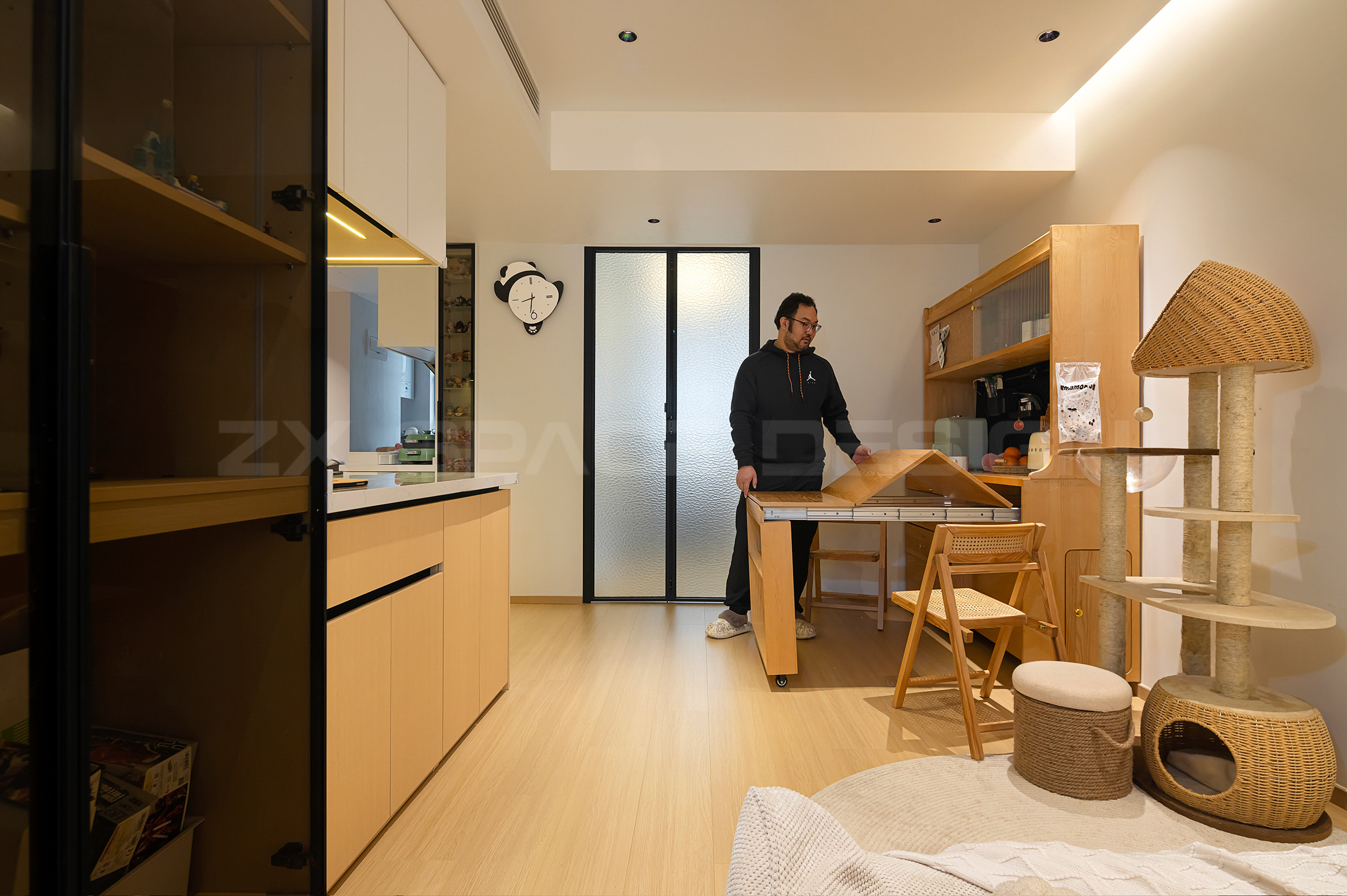 三人两喵,构成小户型特有的温馨氛围。