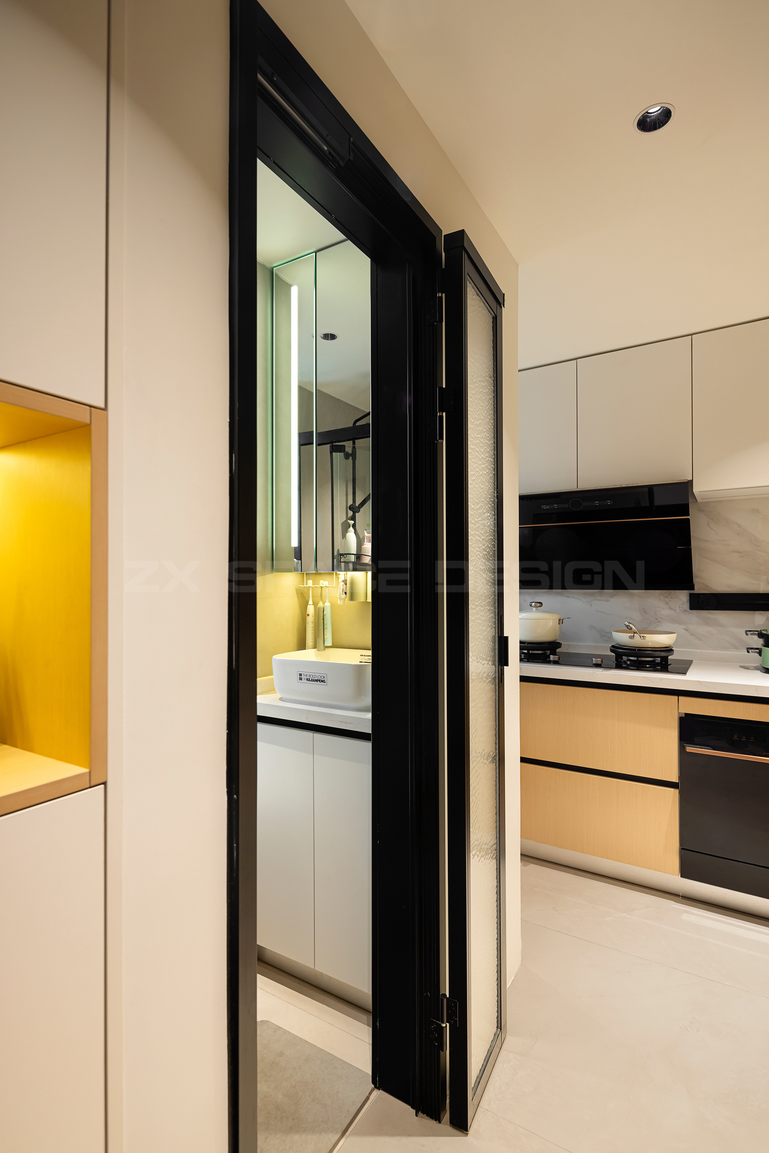 左侧墙体内推,再次压缩空间,为玄关争取到可贵的鞋柜位置。卫生间刚好紧凑放下淋浴、马桶和小台盆。卫生间门特意定制,很小的门洞可以做到折叠加推拉,打开后平贴到墙面上,完全不占用面积。