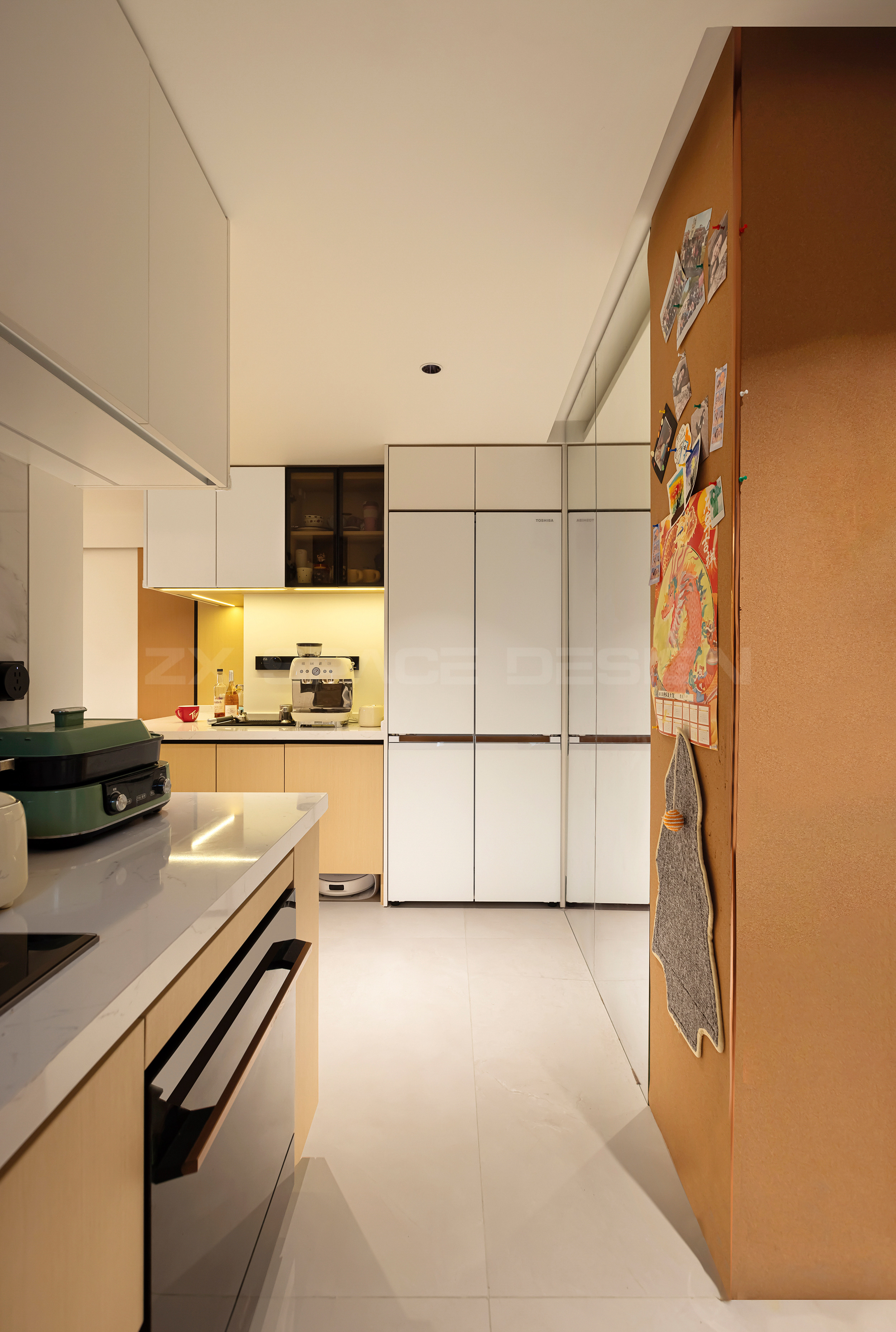L形收纳柜贴着墙,从西厨区一直延伸到客厅。