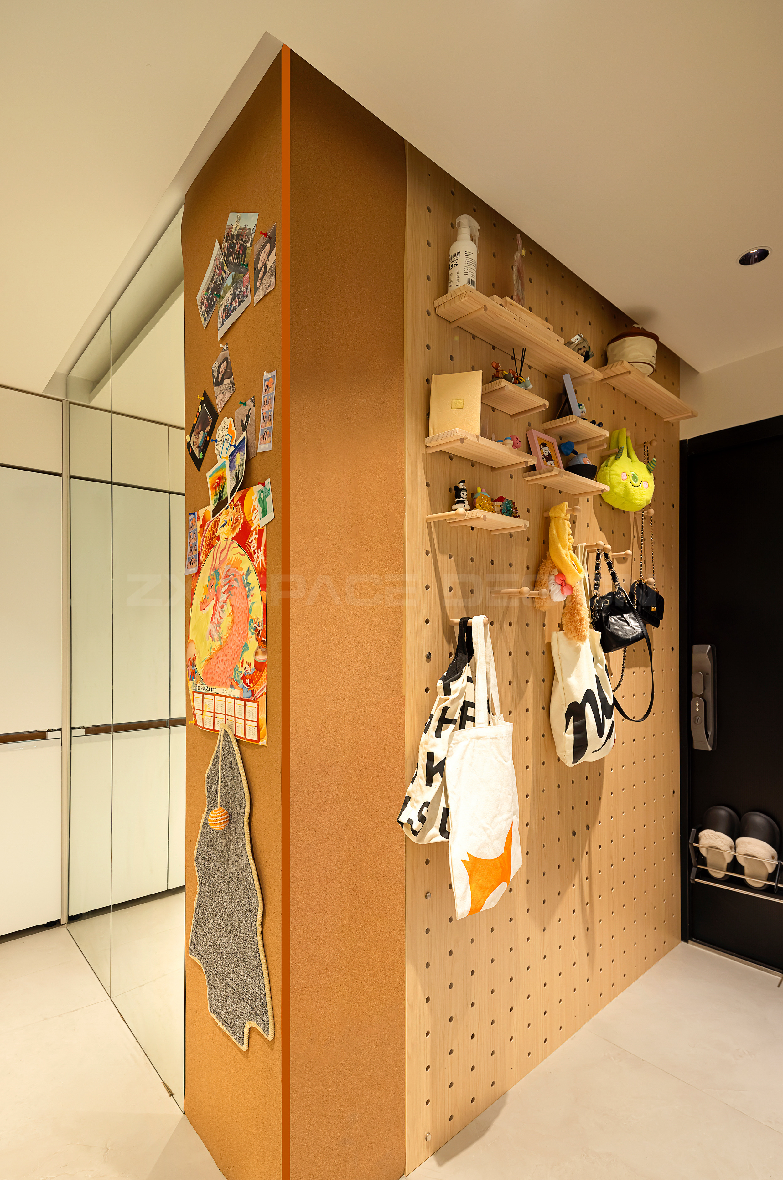 利用“超薄”材质——洞洞板、软木板、镜面,实现收纳的同时,又不占用原本有限的空间。洞洞板随意排布挂取插件,衣服、包包、钥匙轻松摆放。
