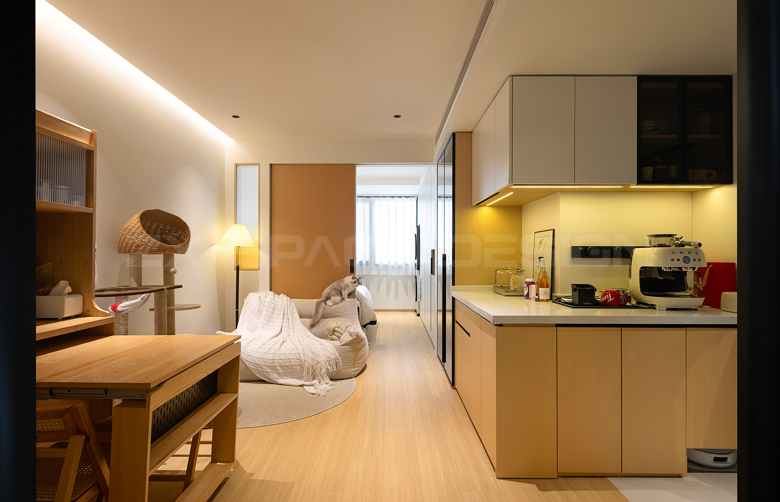 弯弯曲曲的L形墙体,因为有了各类材质的巧妙链接,变得丰富可爱,实用性也大大增加。镜面拉伸,效果优秀,家瞬间大了两倍。