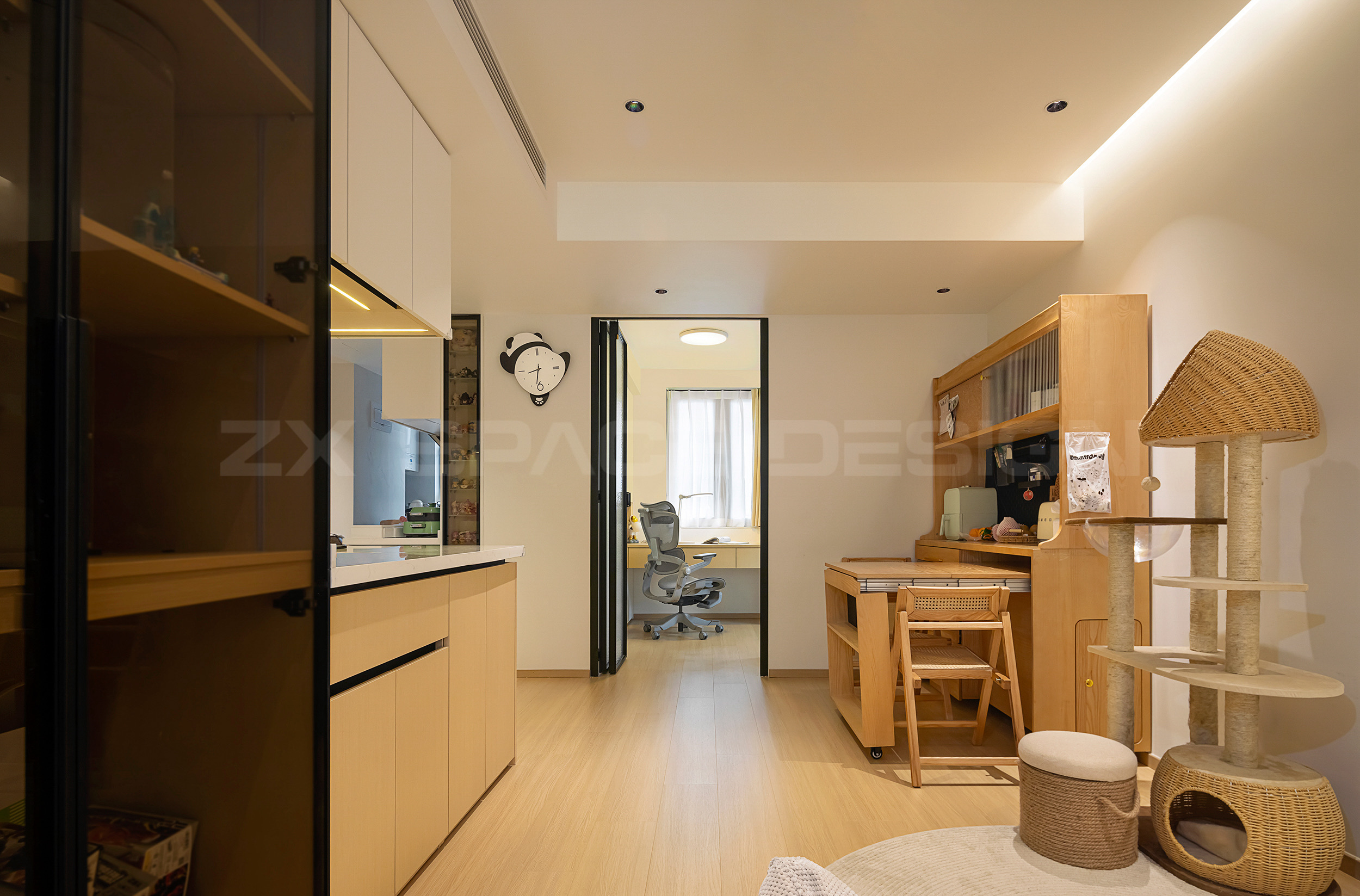 首先解决进门玄关的使用问题,尽可能不去占用过道宽度,去解决入户后的收纳。衣帽围巾可随手摆放。打开厨房,视线更通透。折角转弯处做成承接相连的柜体,既是西厨区也是手办的展示区。儿童房抬高床体,下方储物,小空间实现更多可能。定制餐桌变换多种形式,收进拉开,更灵活实用。