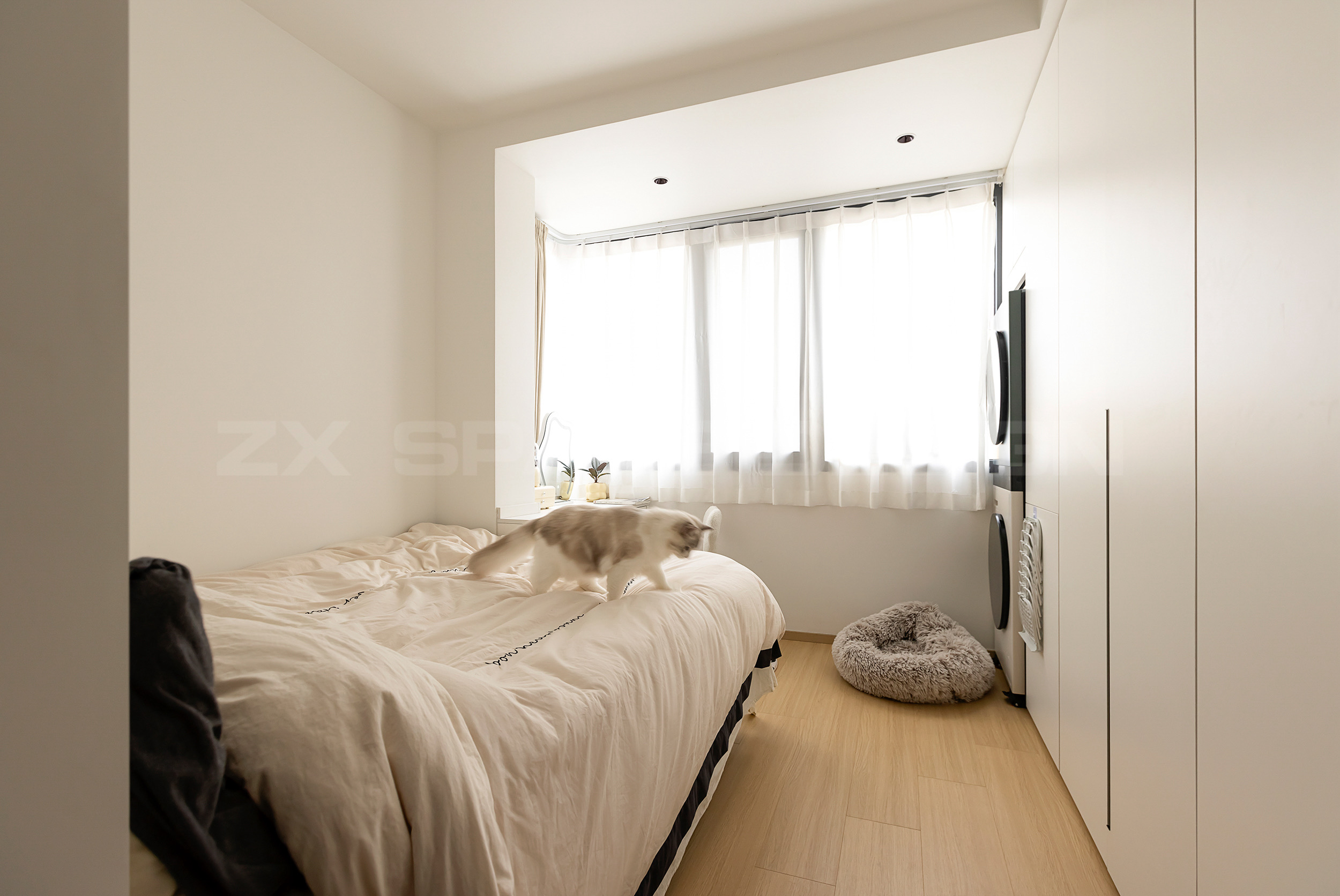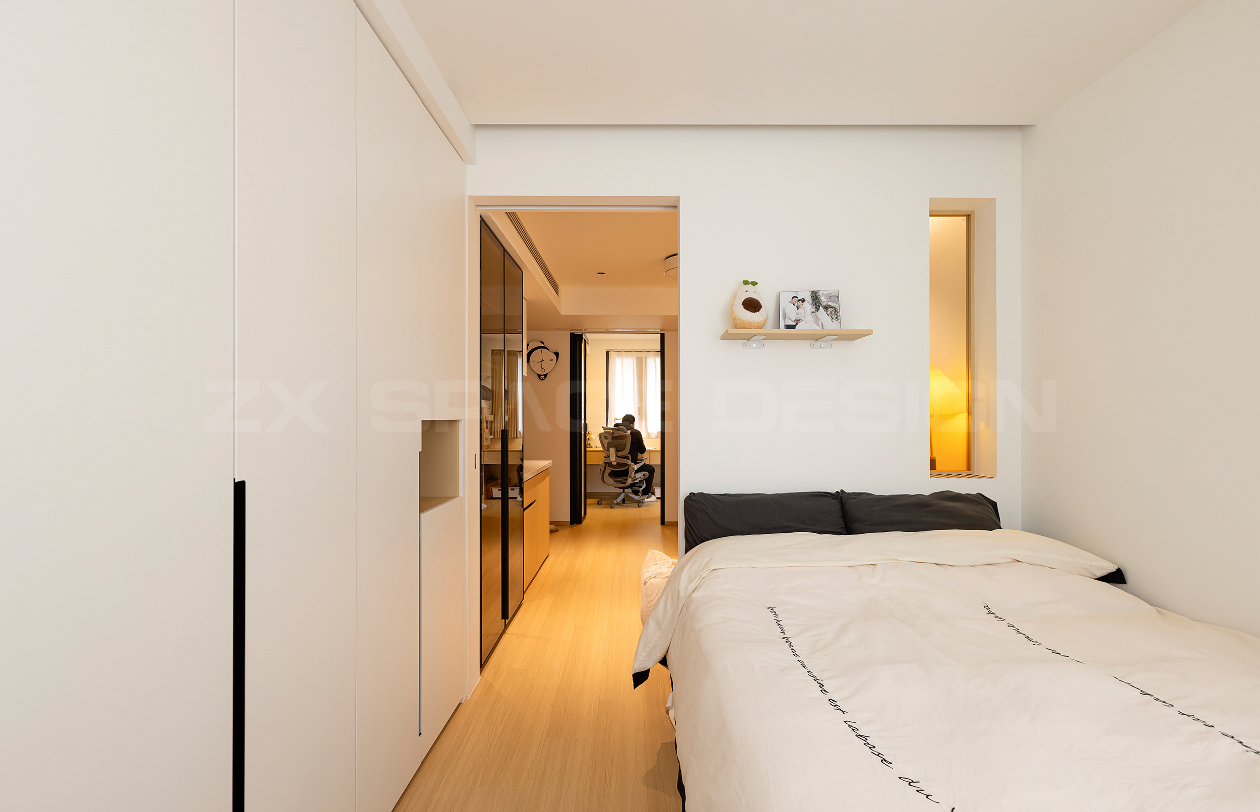 靠墙做了大面积衣柜,所以床体改变常规位置,依势摆放,节省出过道面积。主卧口袋门拉开后,视线贯穿客厅及女儿房,通透感更强。