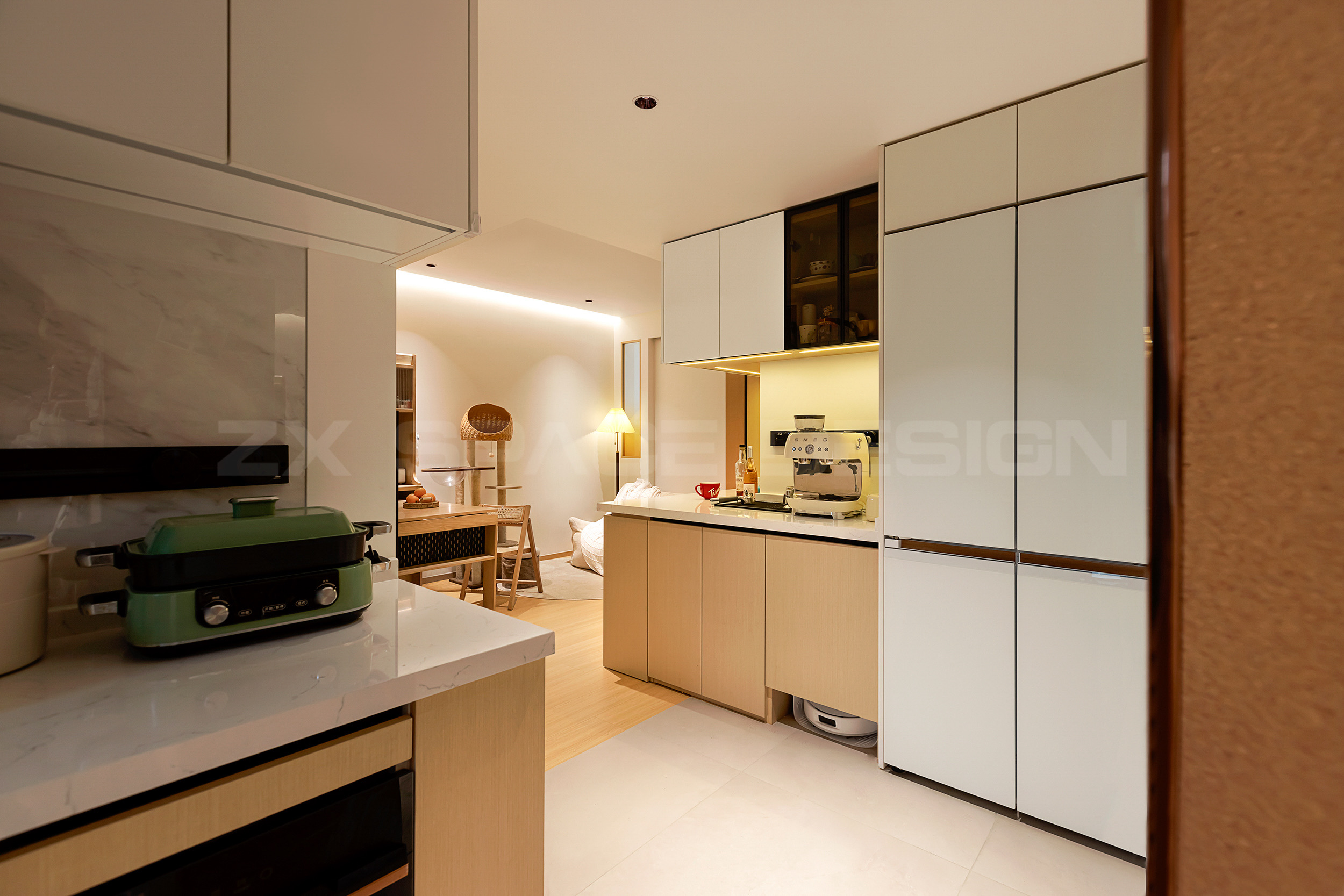 日常饮用水杯,小电器通通安置归位。扫地机器人等家政设备也有了落脚点。