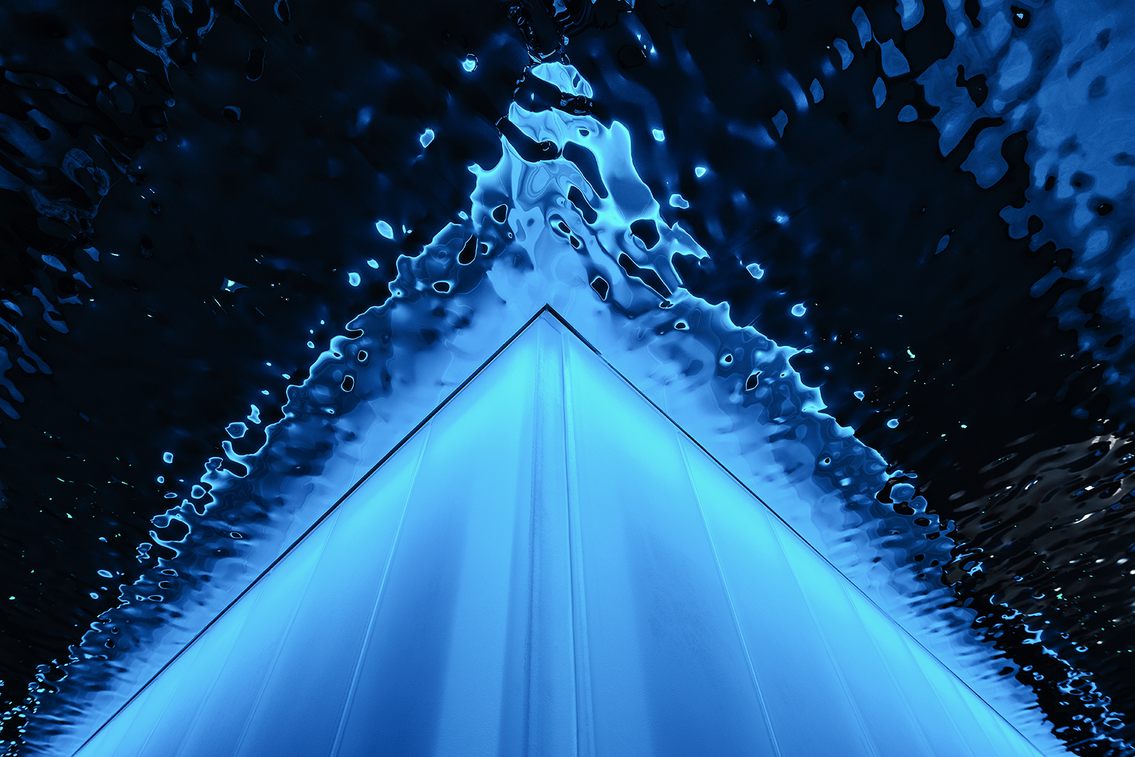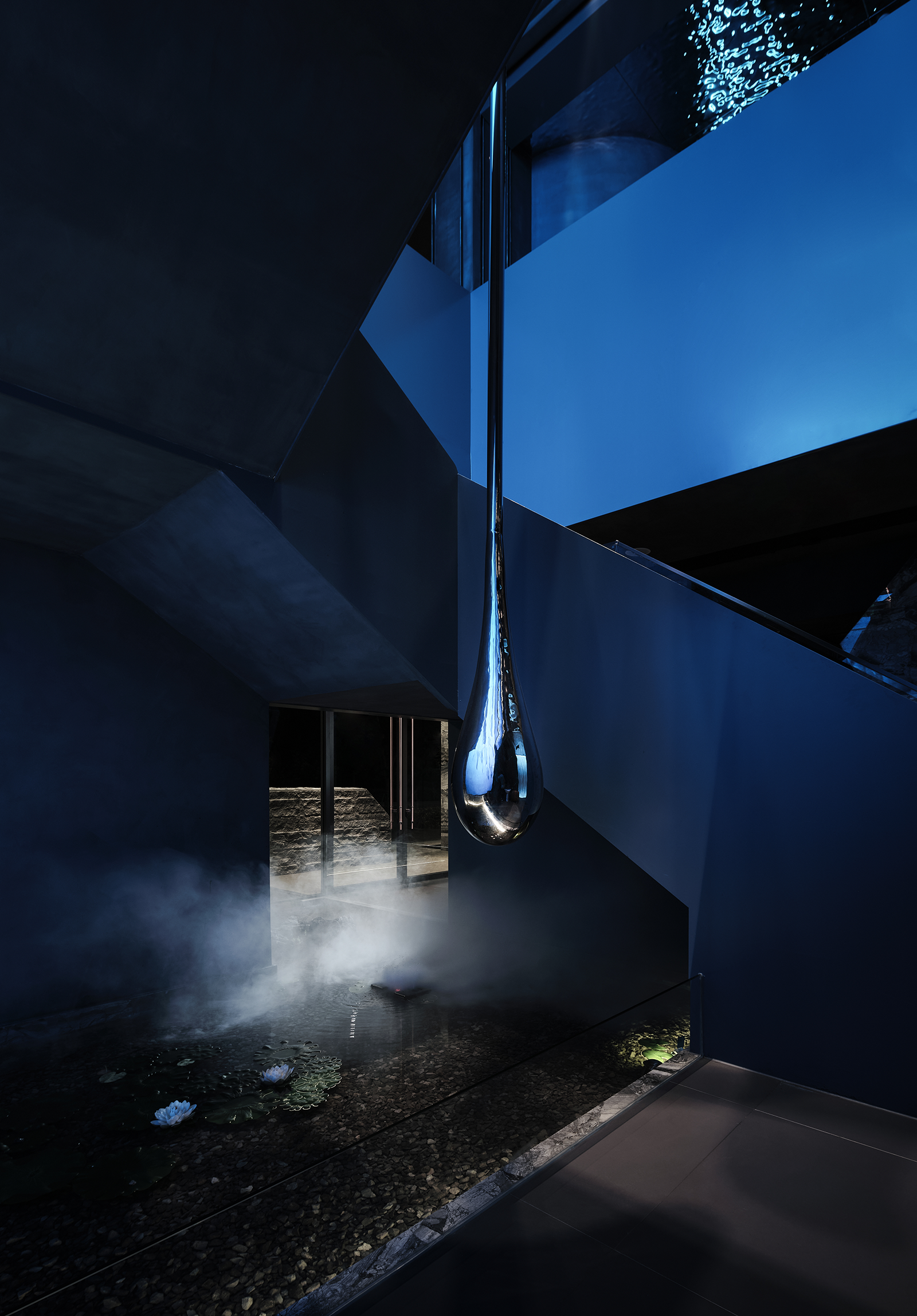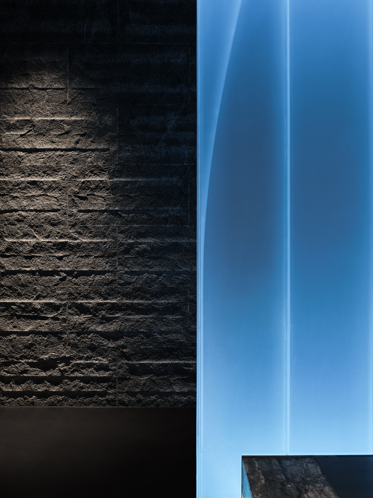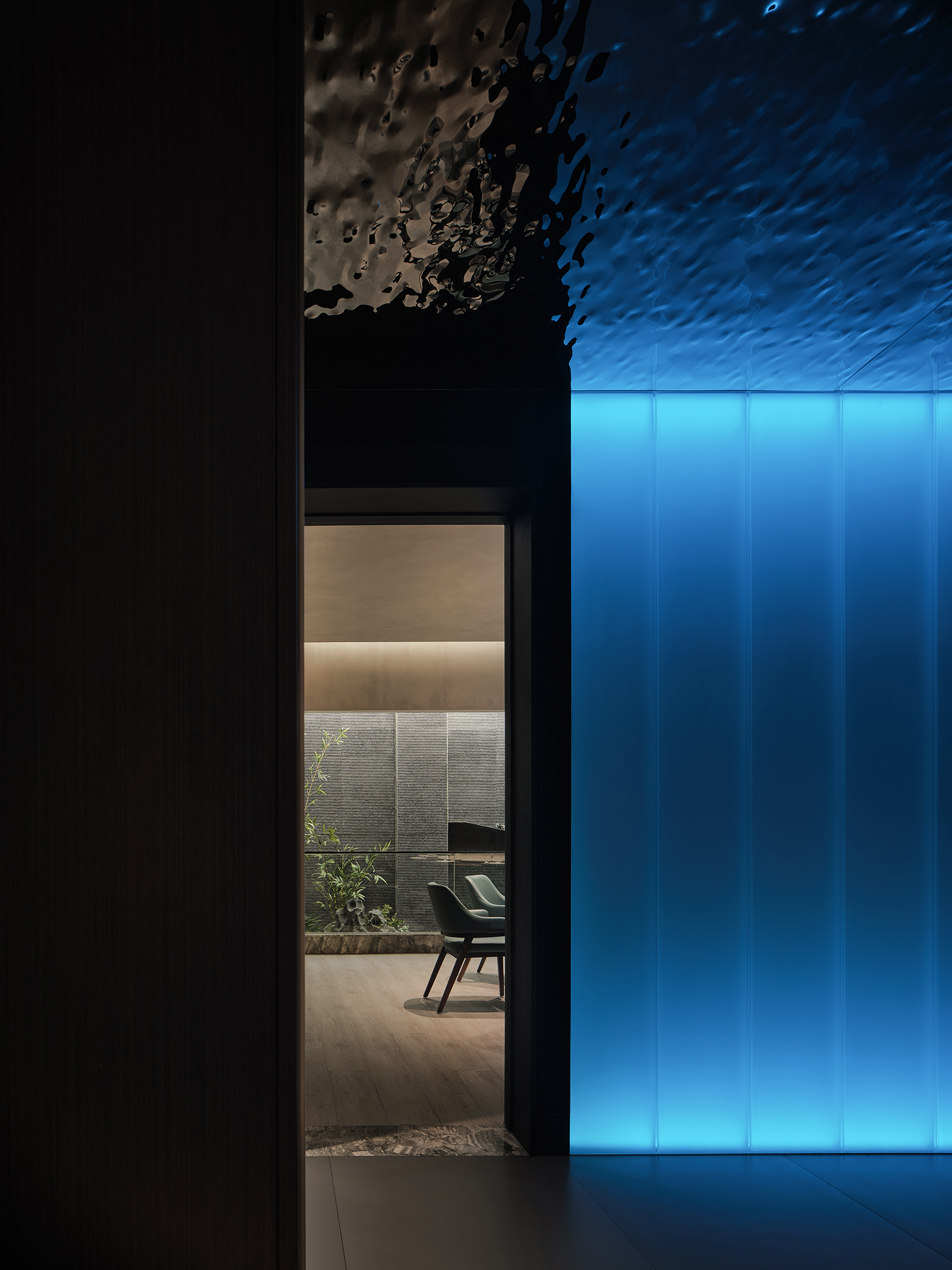 Space spirit is defined as the blue deep sea. This provides people with a peaceful and tranquil experience, creating a strong sense of immersion and resonance between people and space. Set against the backdrop of the sea surface, the deep blue seawater is surging with undercurrents, and the flowing crowd climbs up the stairs, eagerly anticipating the start of the feast. The continuous wave form is like a gaze upon its spirit, and the dim light color accompanies its forward steps. Everything is so calm yet stirred up by inner turmoil.