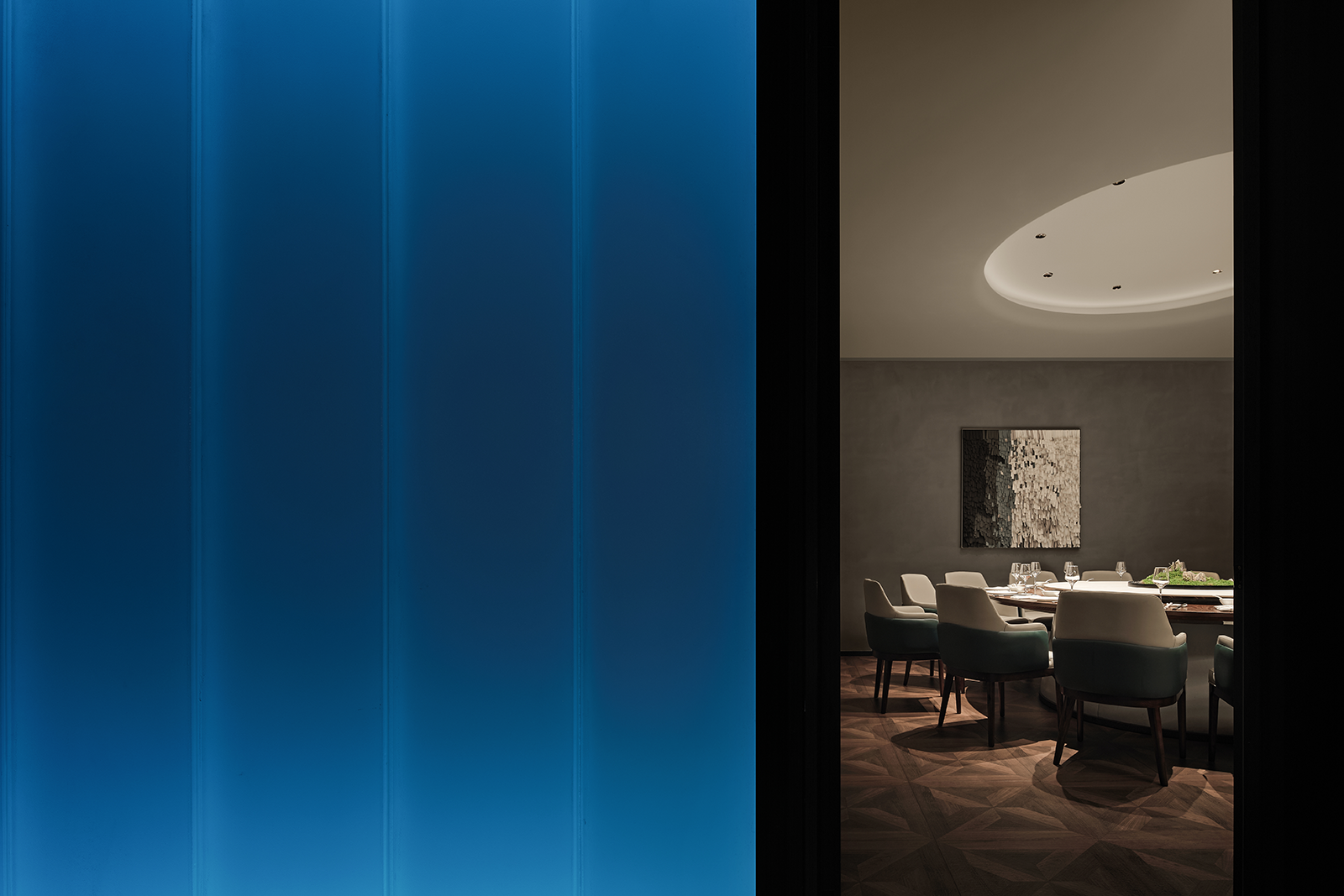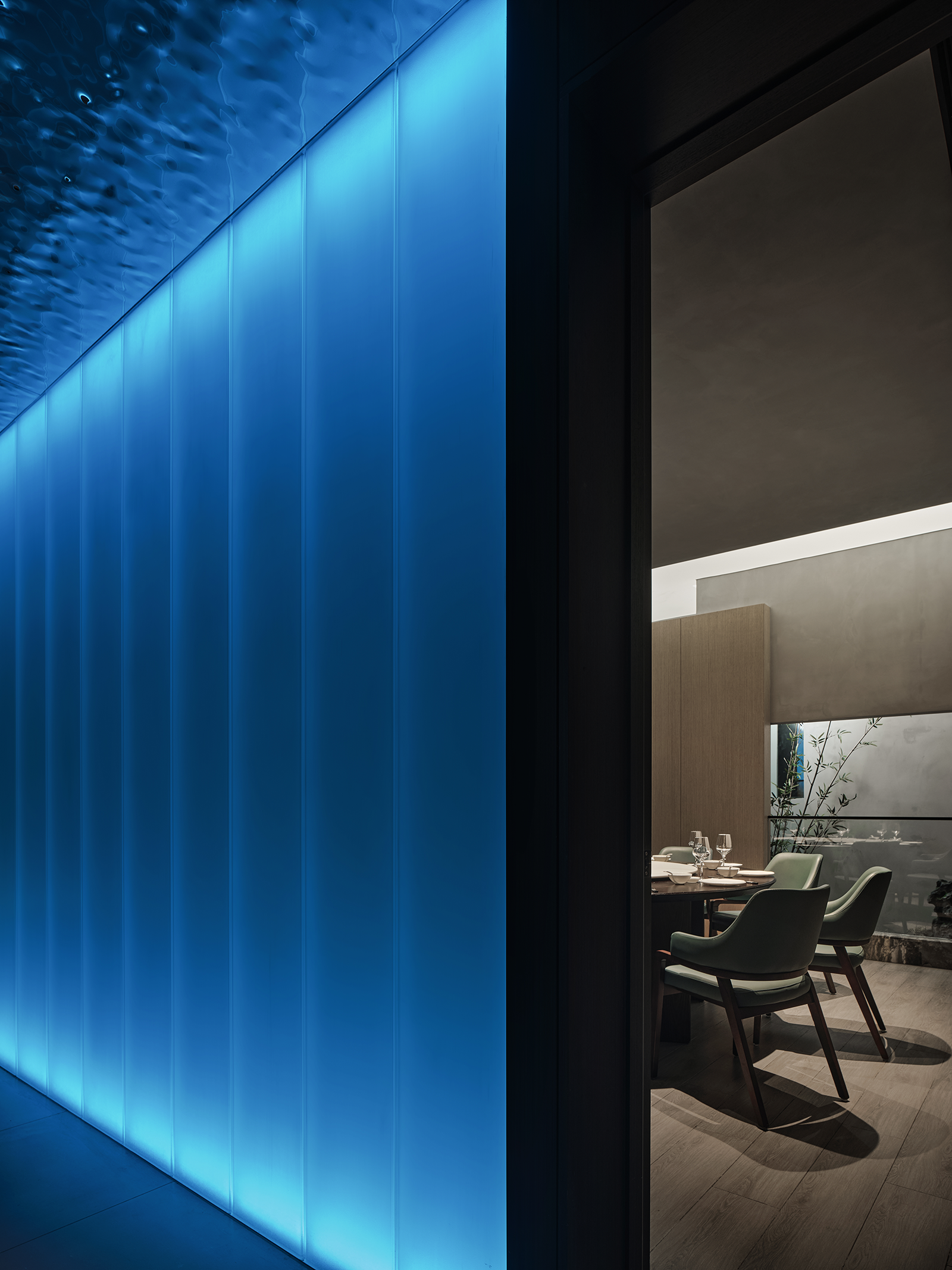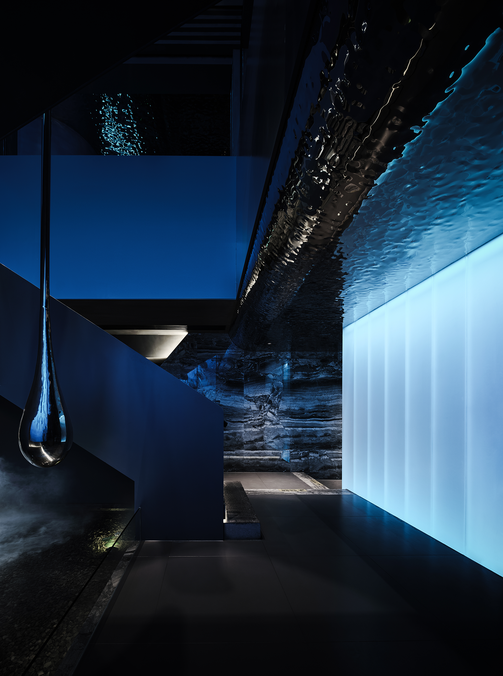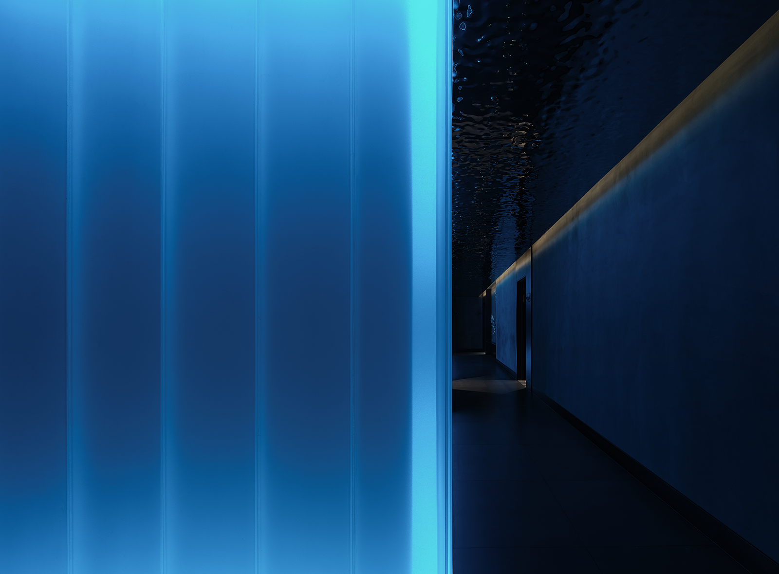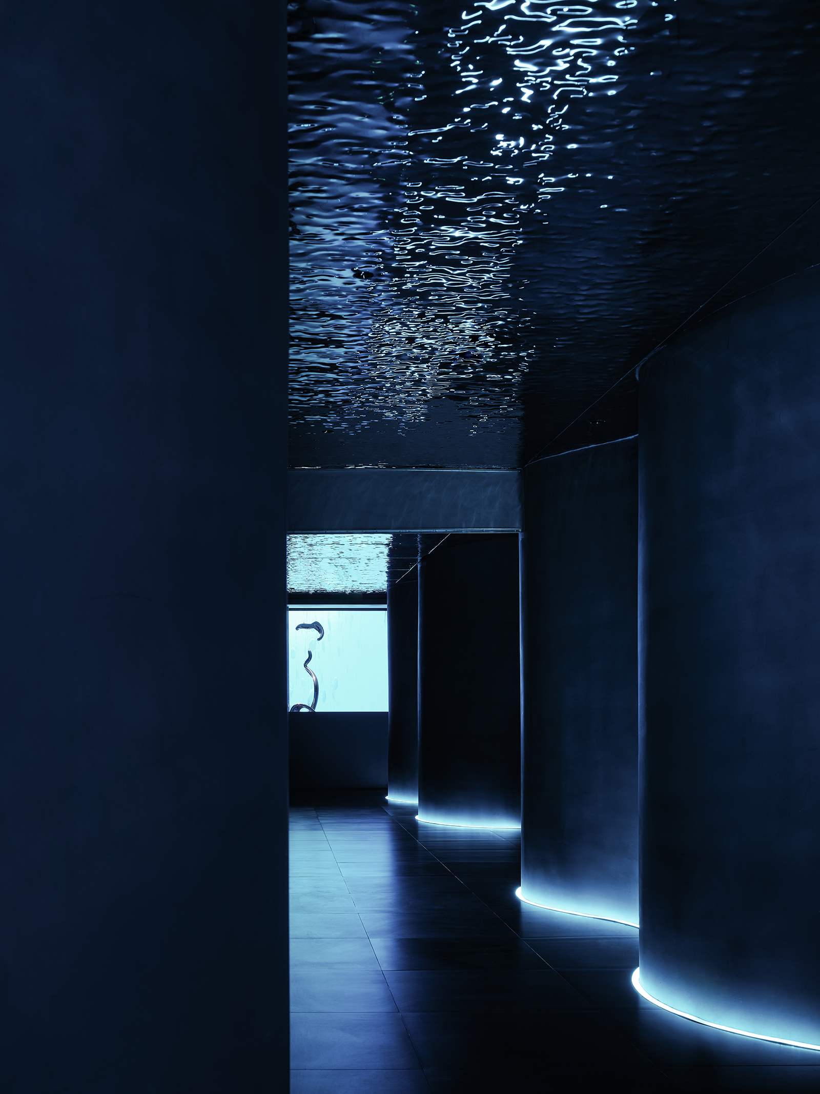空间精神定义为蓝色深海的。以此给予人们安宁、静逸的体验,形成强烈的代入感和人与空间的共振。以海面之下为背景,深蓝的海水暗流涌动,流动的人群拾阶而上期待着盛宴的开始。延绵的波浪形式宛如对其精神的凝视,暗淡的光色为其伴随着前行的步伐。一切是如此的波澜不惊却又泛起内心的波动。