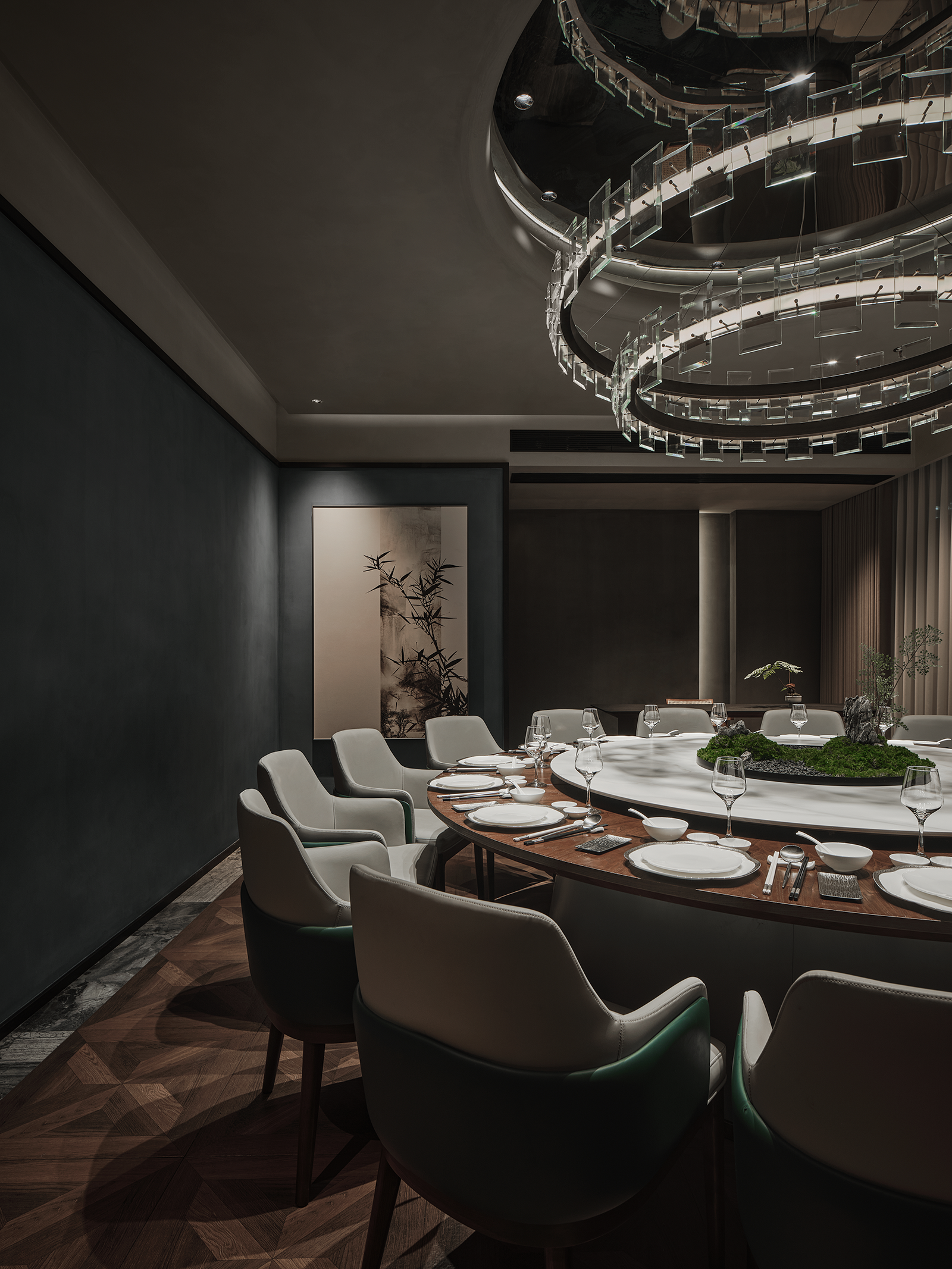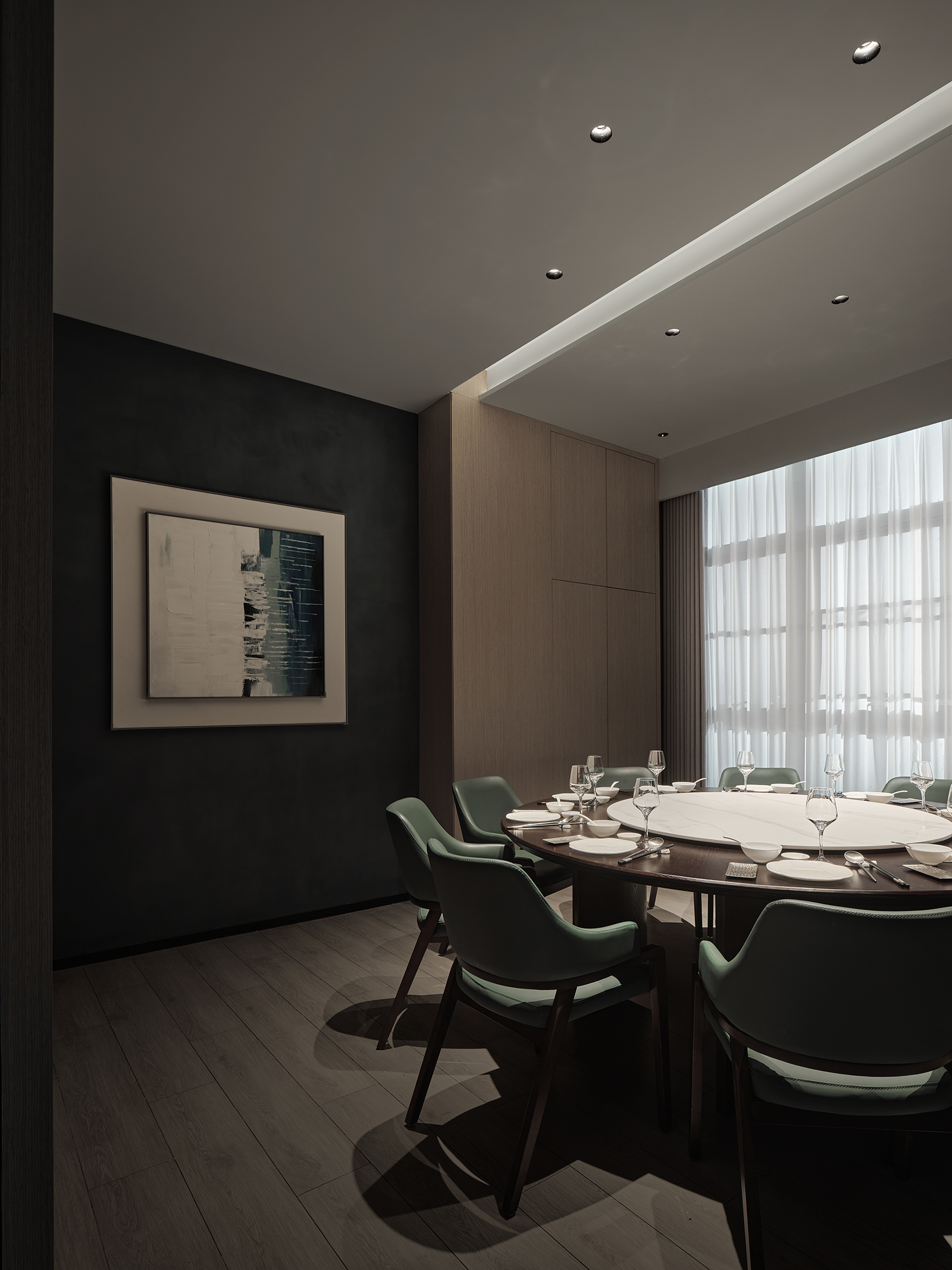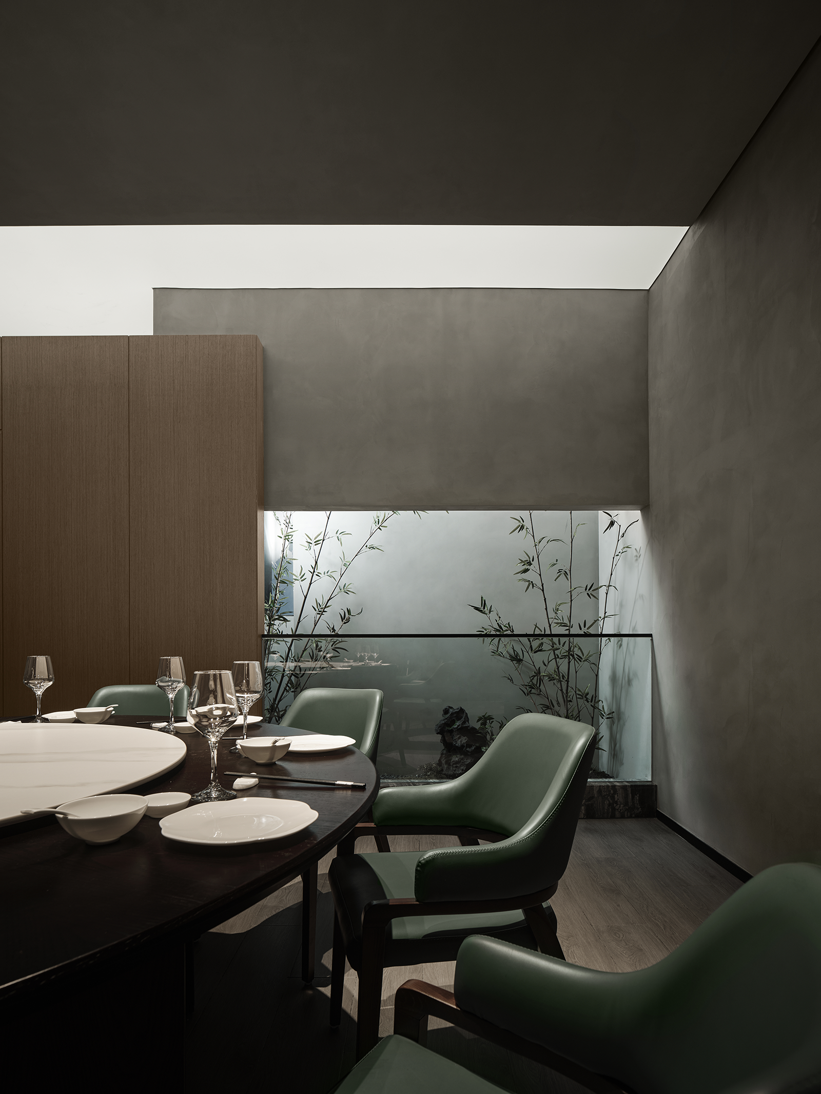 封闭的包厢空间融合了人造景观与灯光膜,改变封闭空间的就餐体验、模拟日光环境,增强舒适度。 -