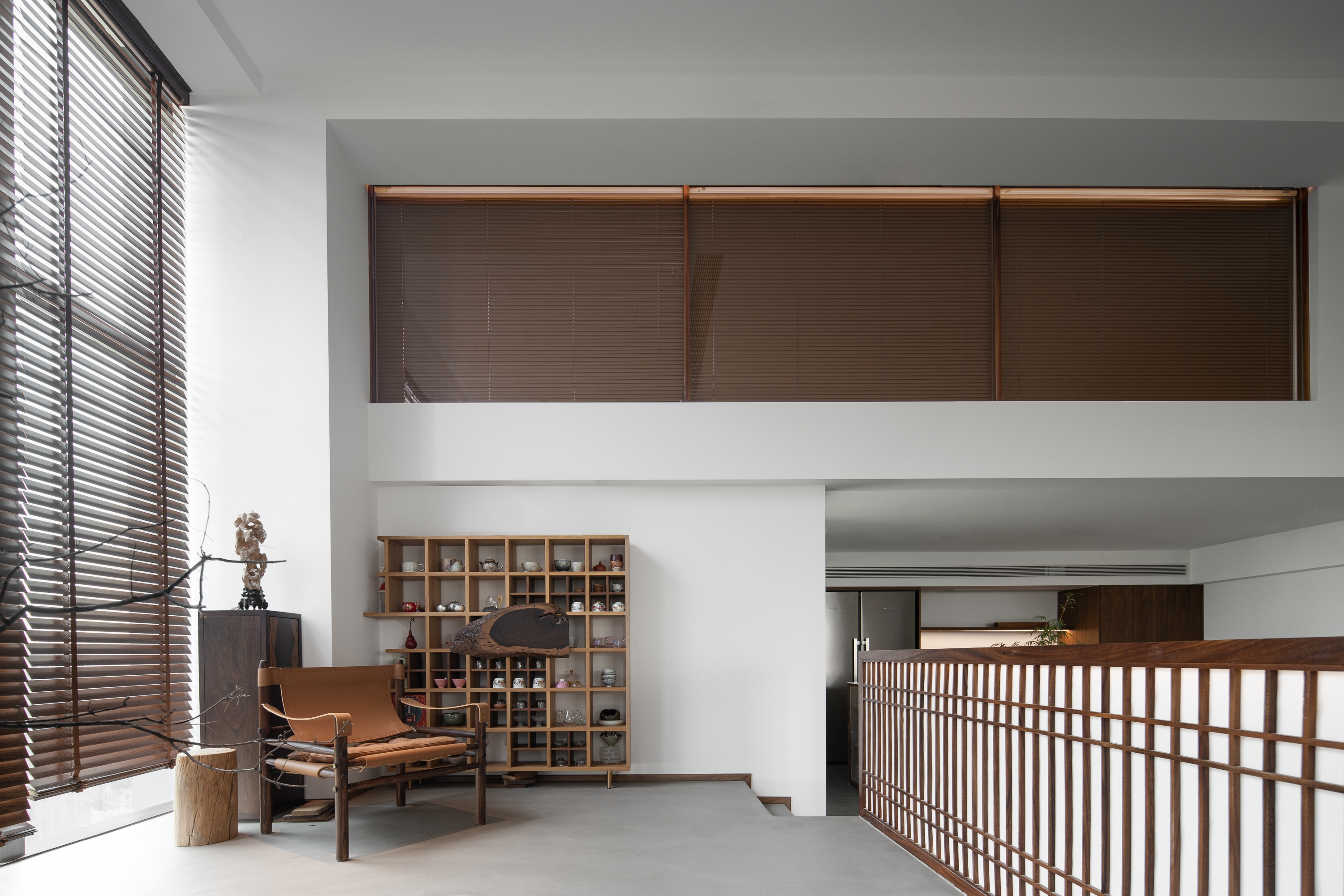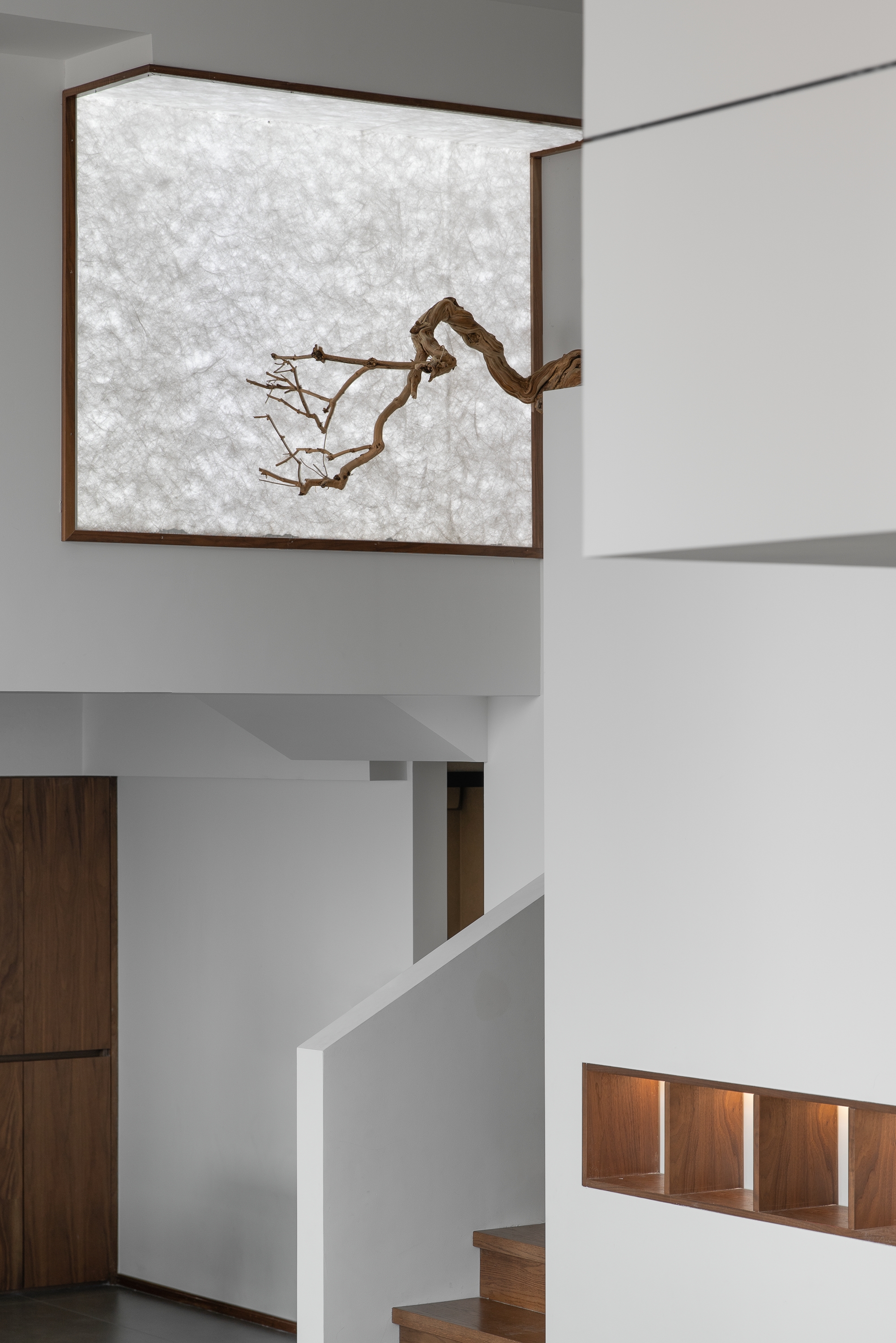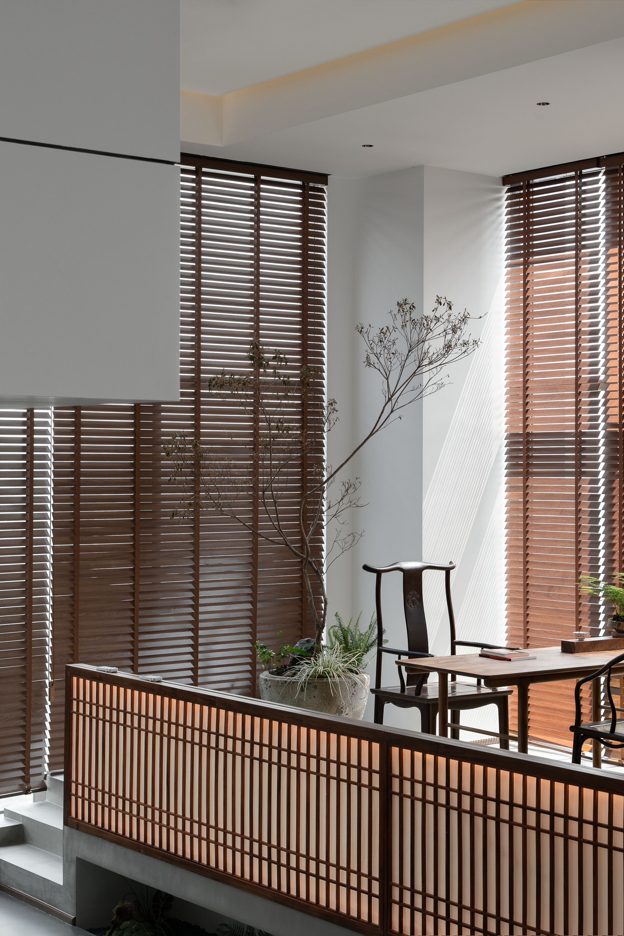 光影交错中,透光的格栅和地龛的绿景,点亮了原本平静的背景