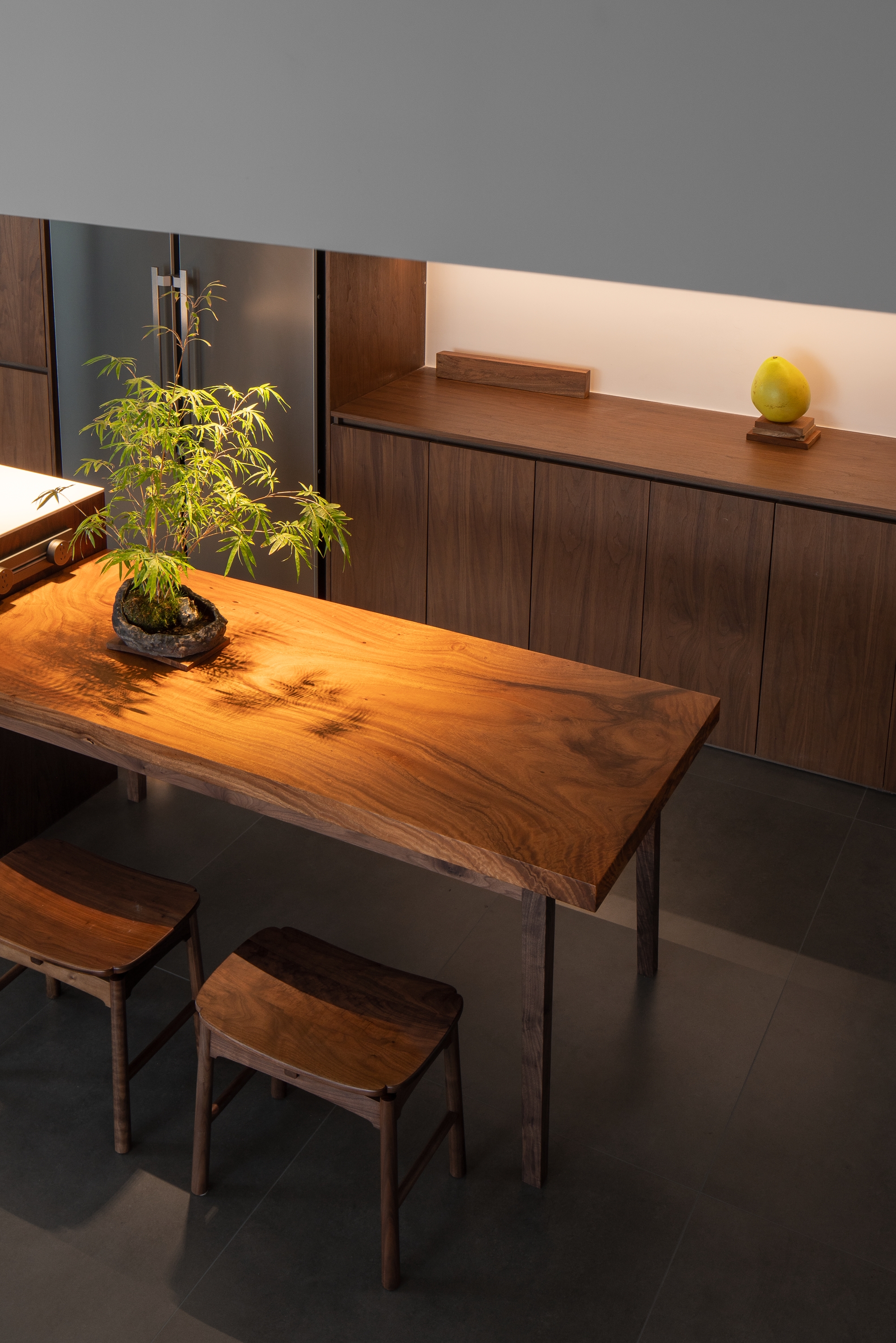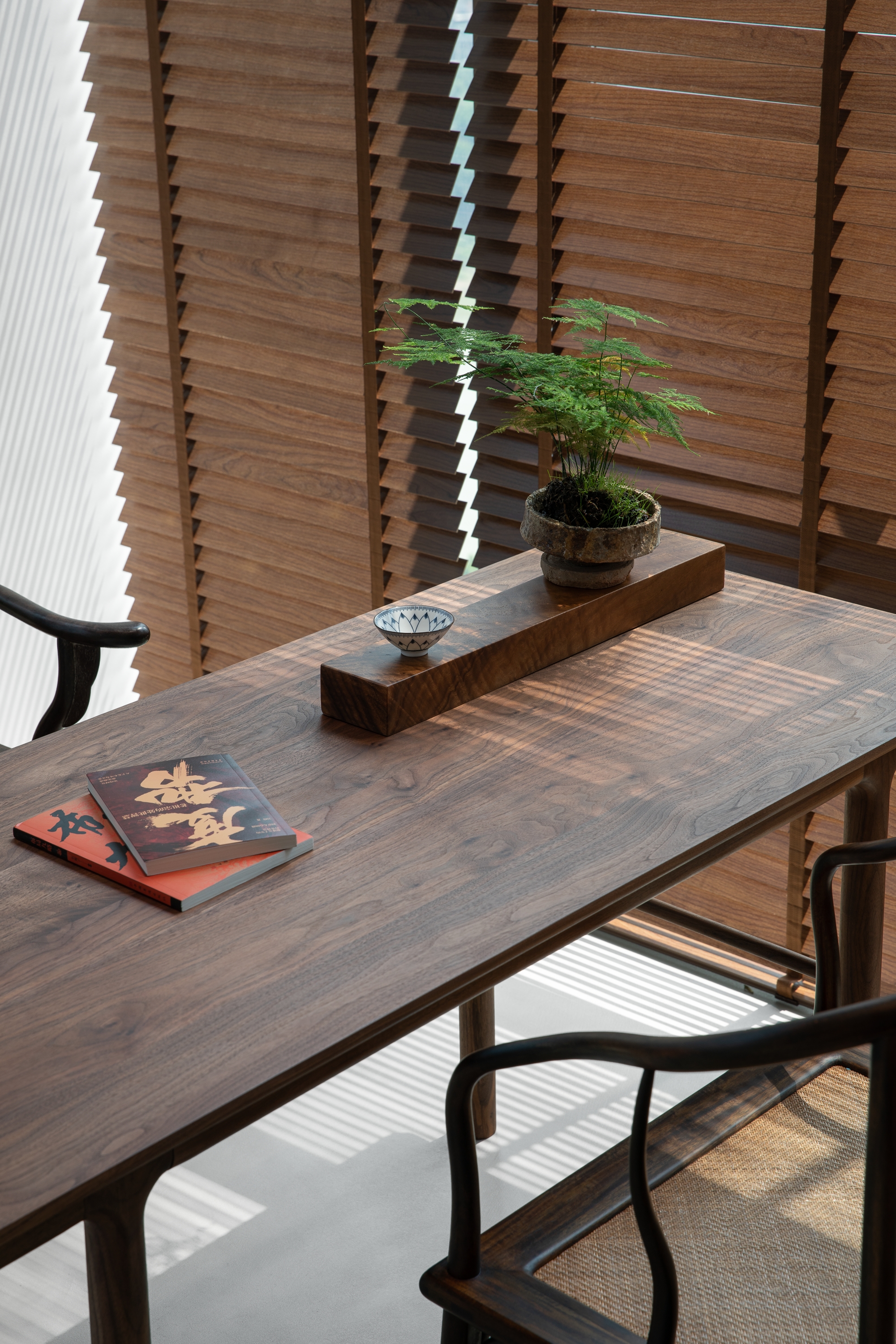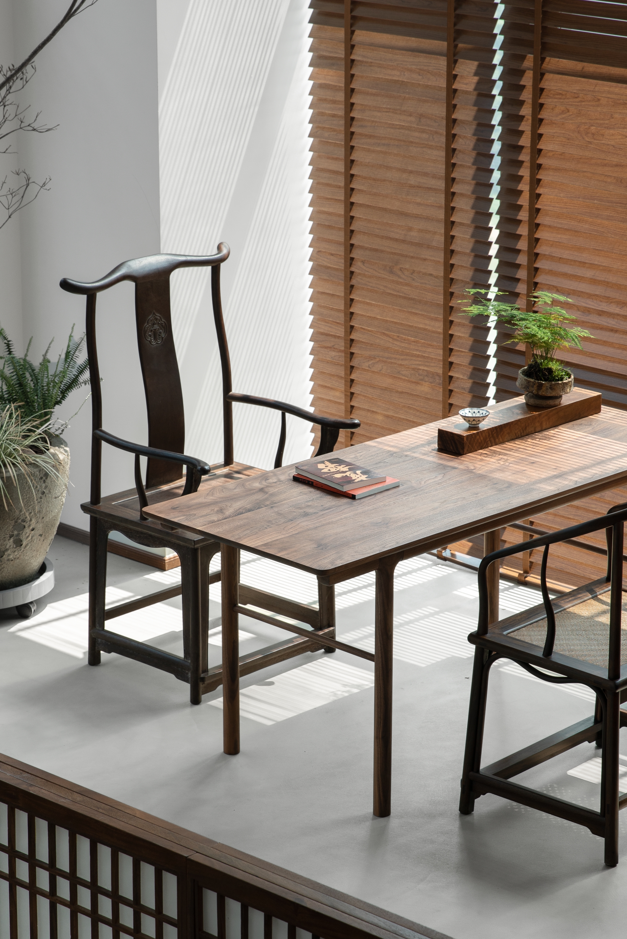 光影交错中,透光的格栅和地龛的绿景,点亮了原本平静的背景