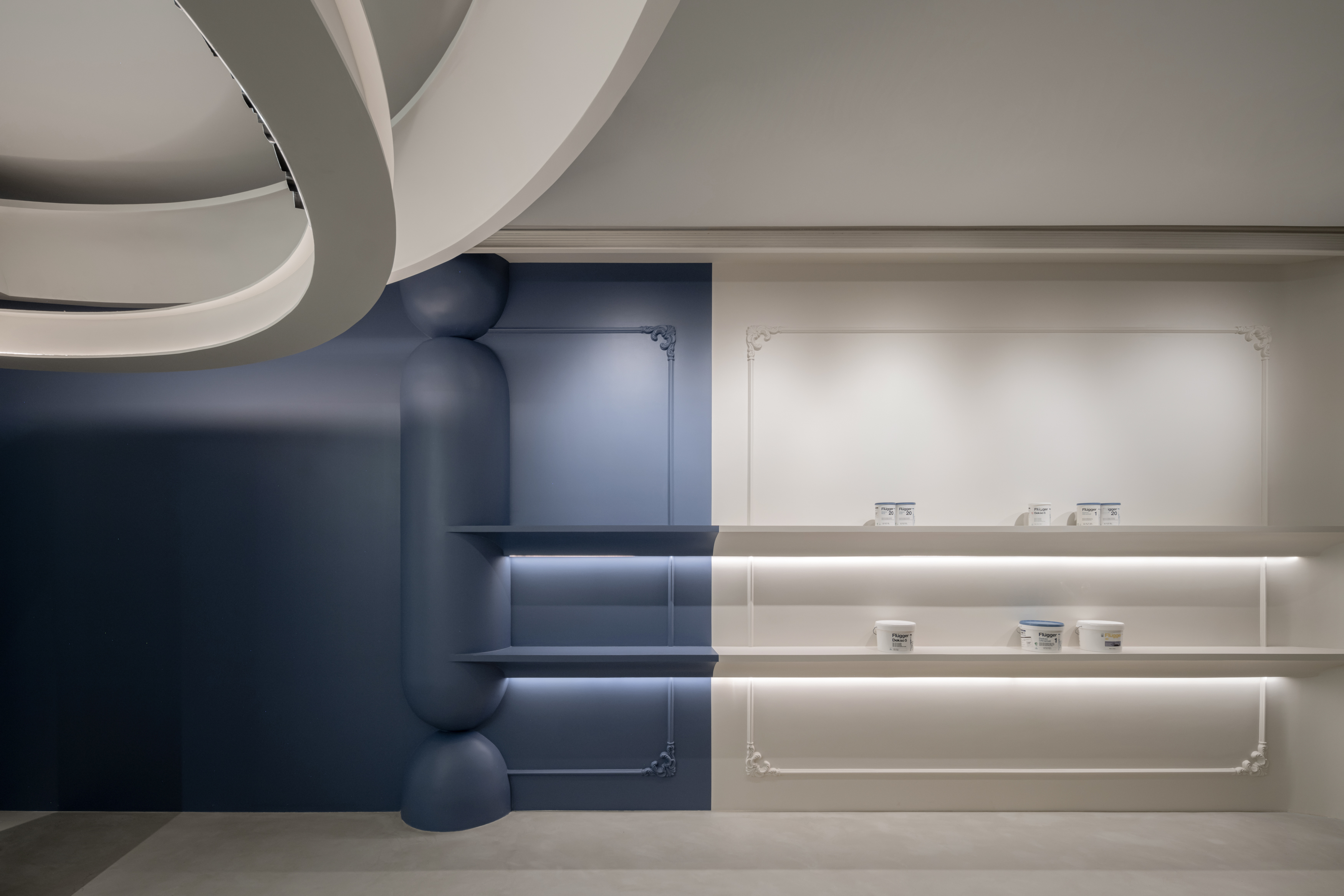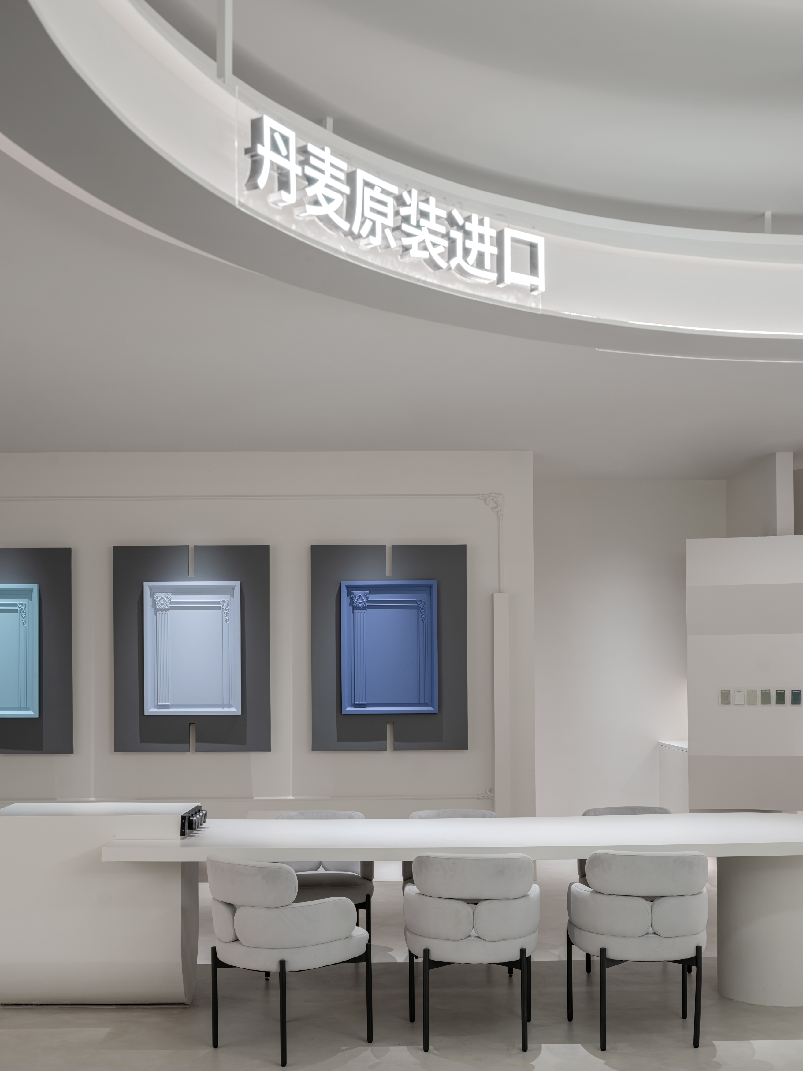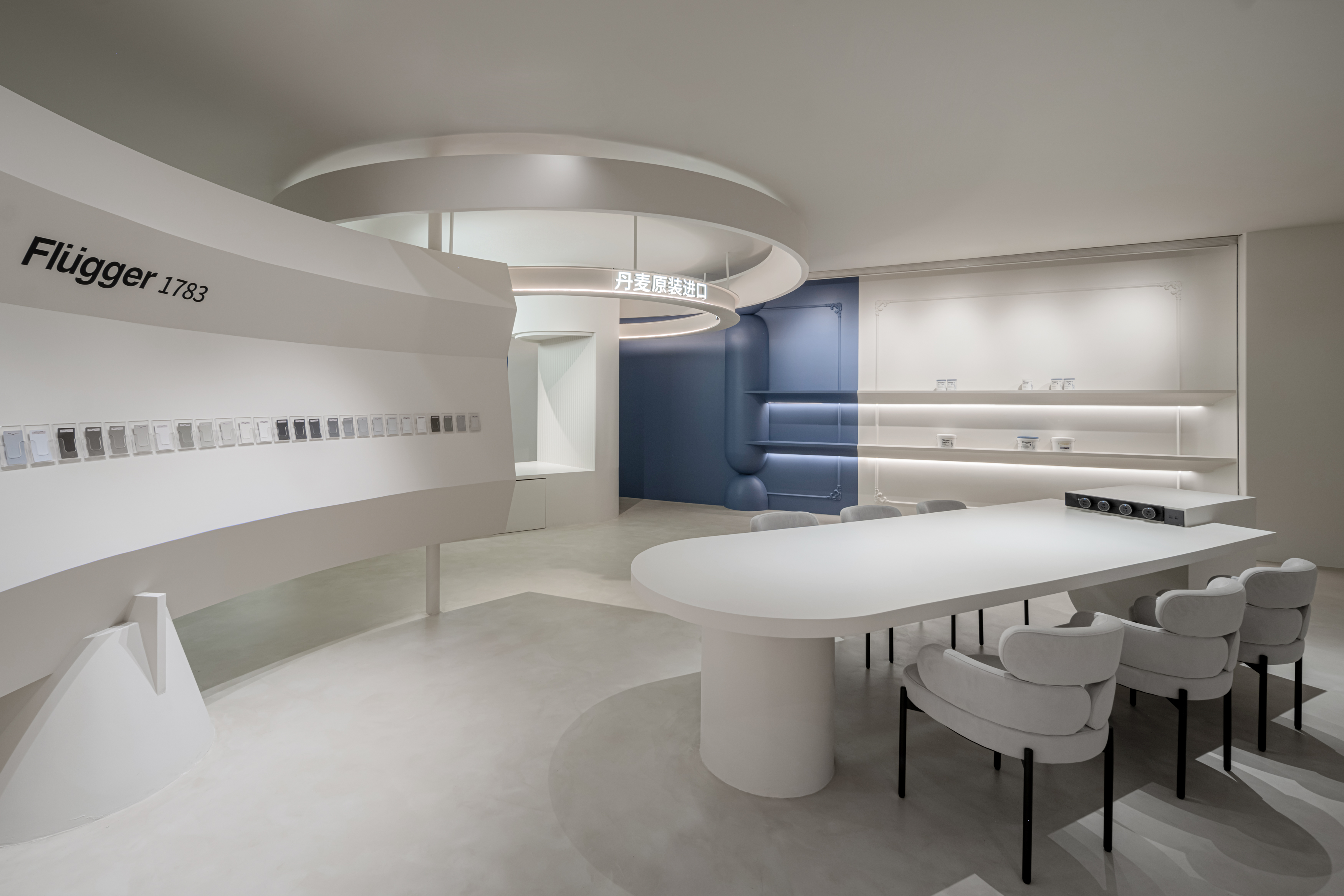 空间意境:在环境风格上,该项目大胆地采用极简与建筑感结合的设计语言,以柔和的曲线和环形结构为主要视觉元素。与传统的方正空间不同,这种设计打破了平面式的视角限制,创造出具有视觉引导性的流线型空间。结合蓝色和白色的色调,以及充满未来感的隐藏式灯带,整体环境氛围既具科技感又保持了一种宁静的舒适感。