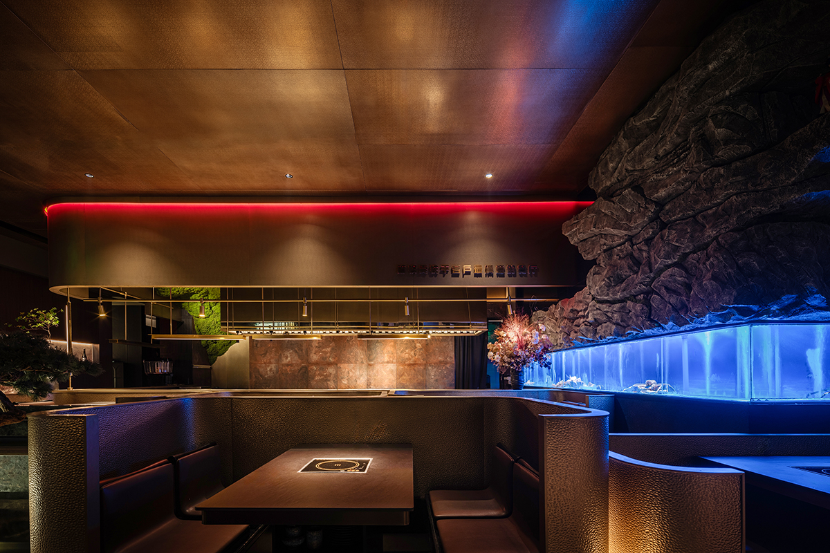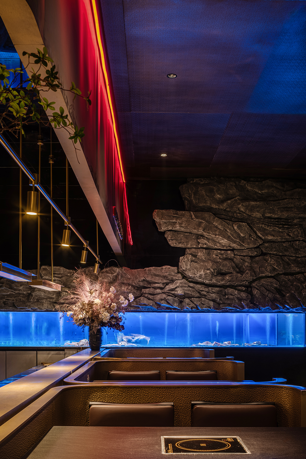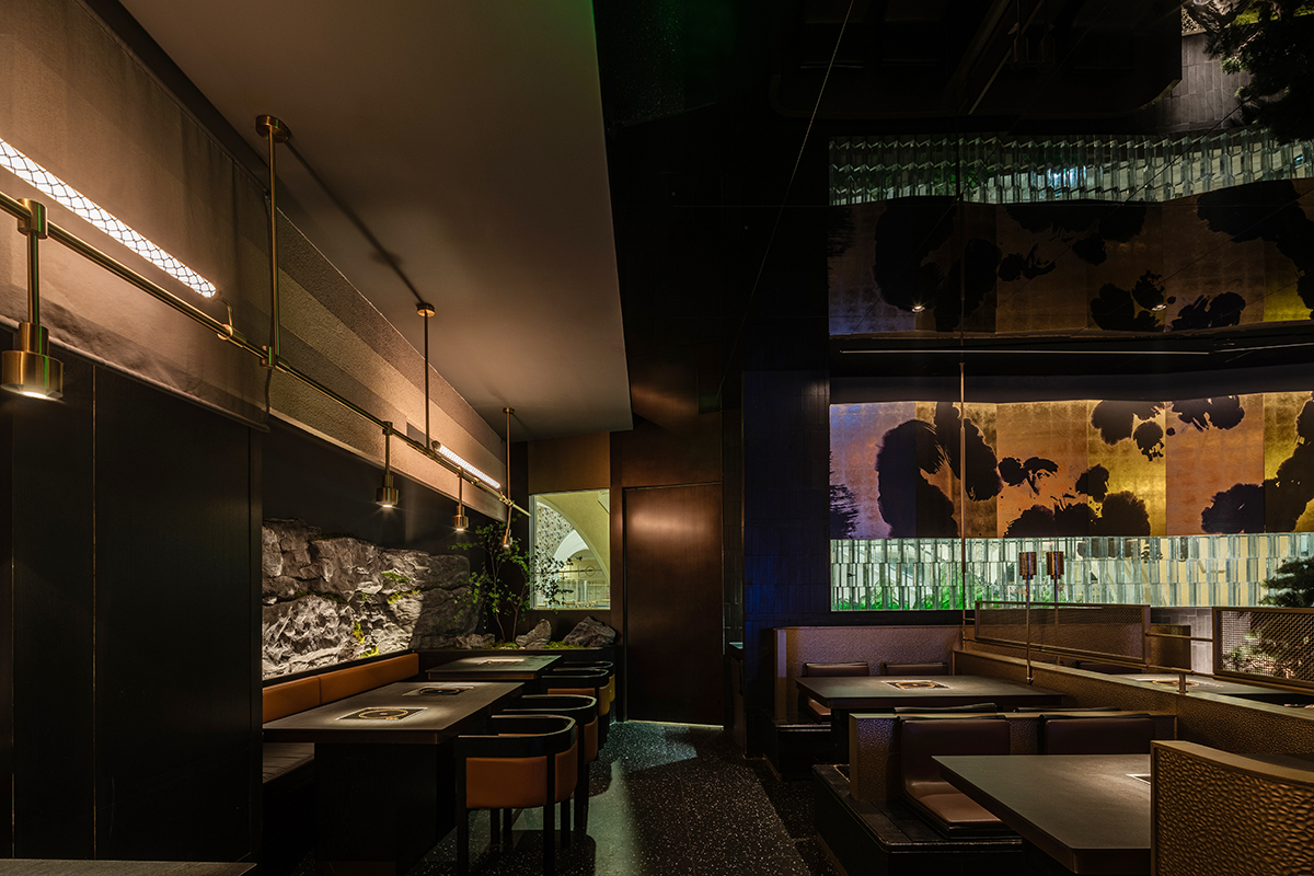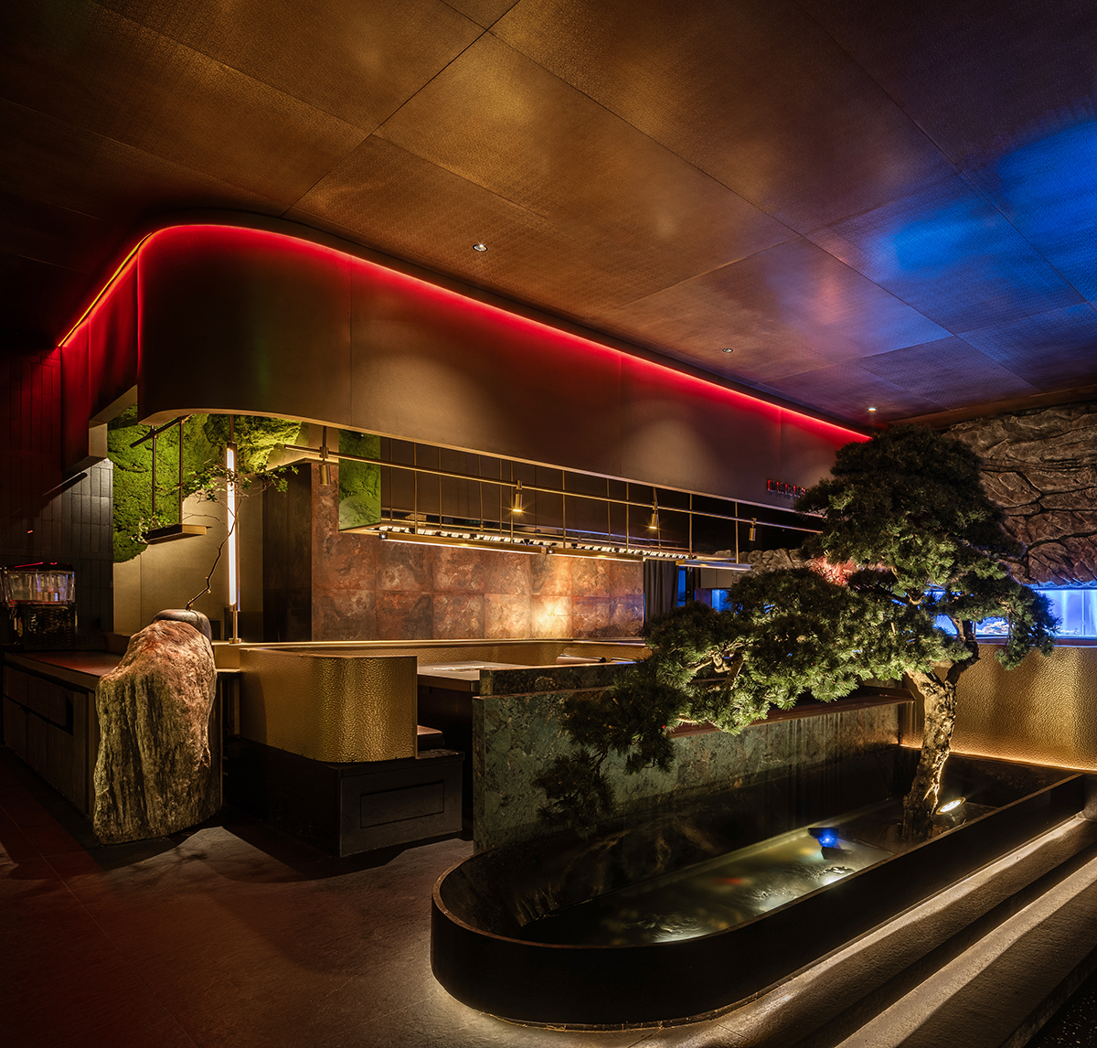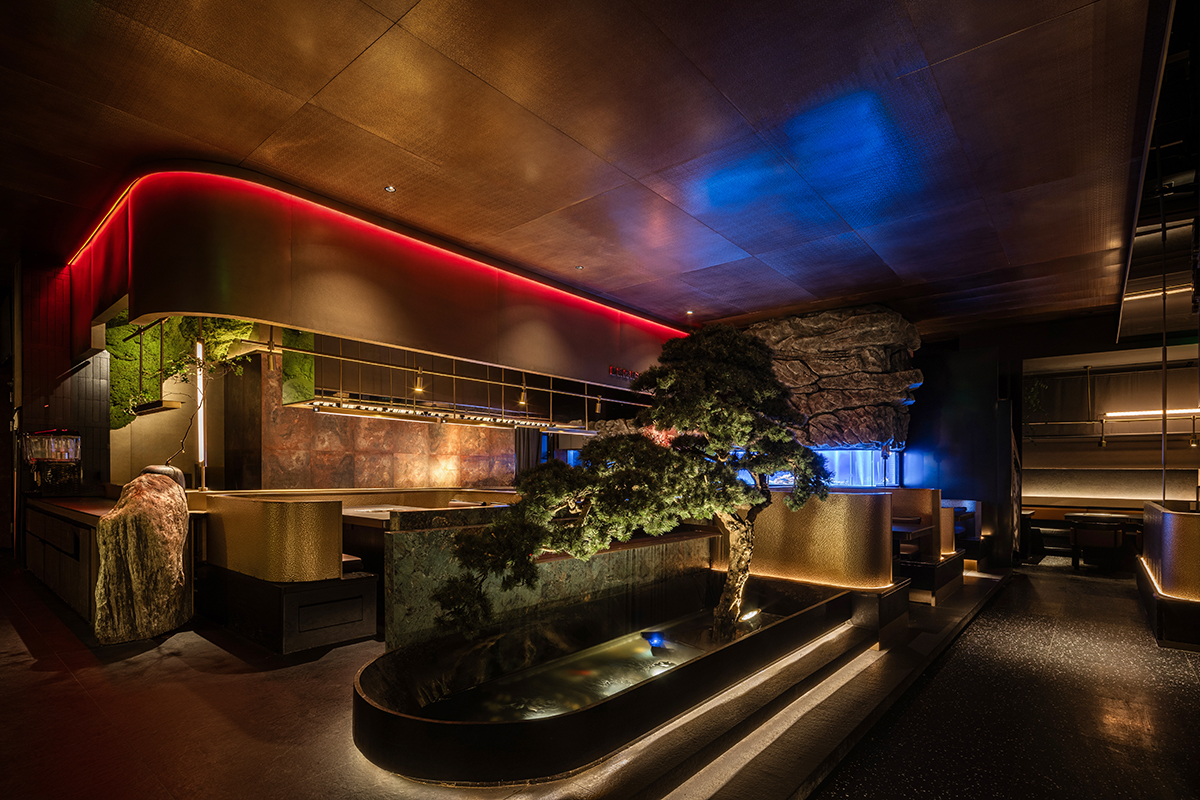 空间布局:一块巨石矗立,与背后的流水瀑布相映成趣,营造出一种亲切而自然的空间氛围。餐厅整体色调以暗雅为主,点缀着金色的华丽、赫赤的热情与翡绿的生机,仿佛是一幅简约而不失精致的日式和室画卷。在这里,简单与复杂相互交织,形成了独特的对立统一之美。你可以将这里视为都市生活中的一片“隐居之所”,是逃离喧嚣、寻求平衡的心灵港湾