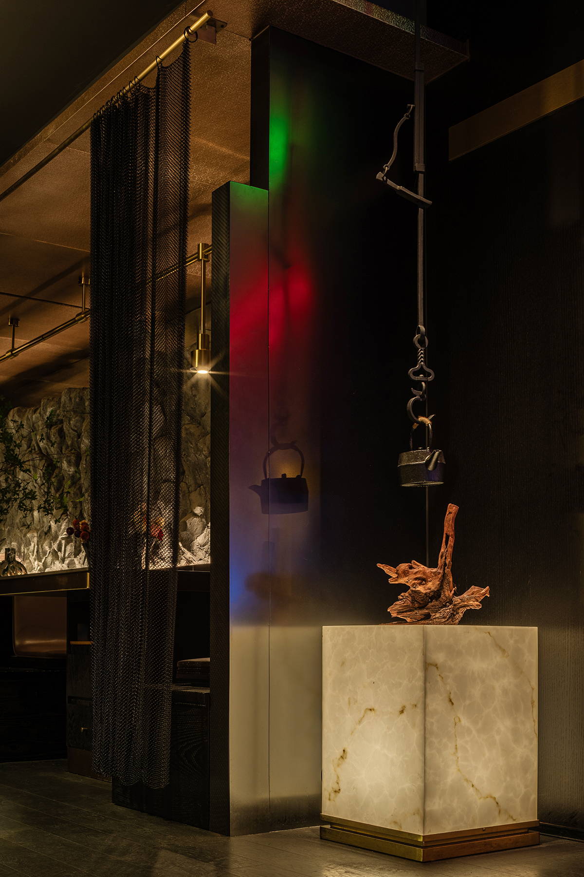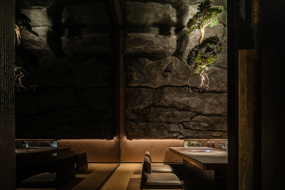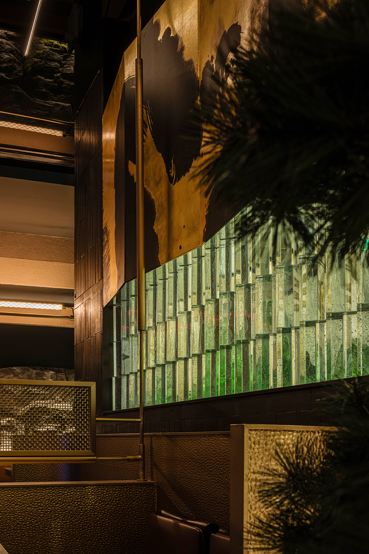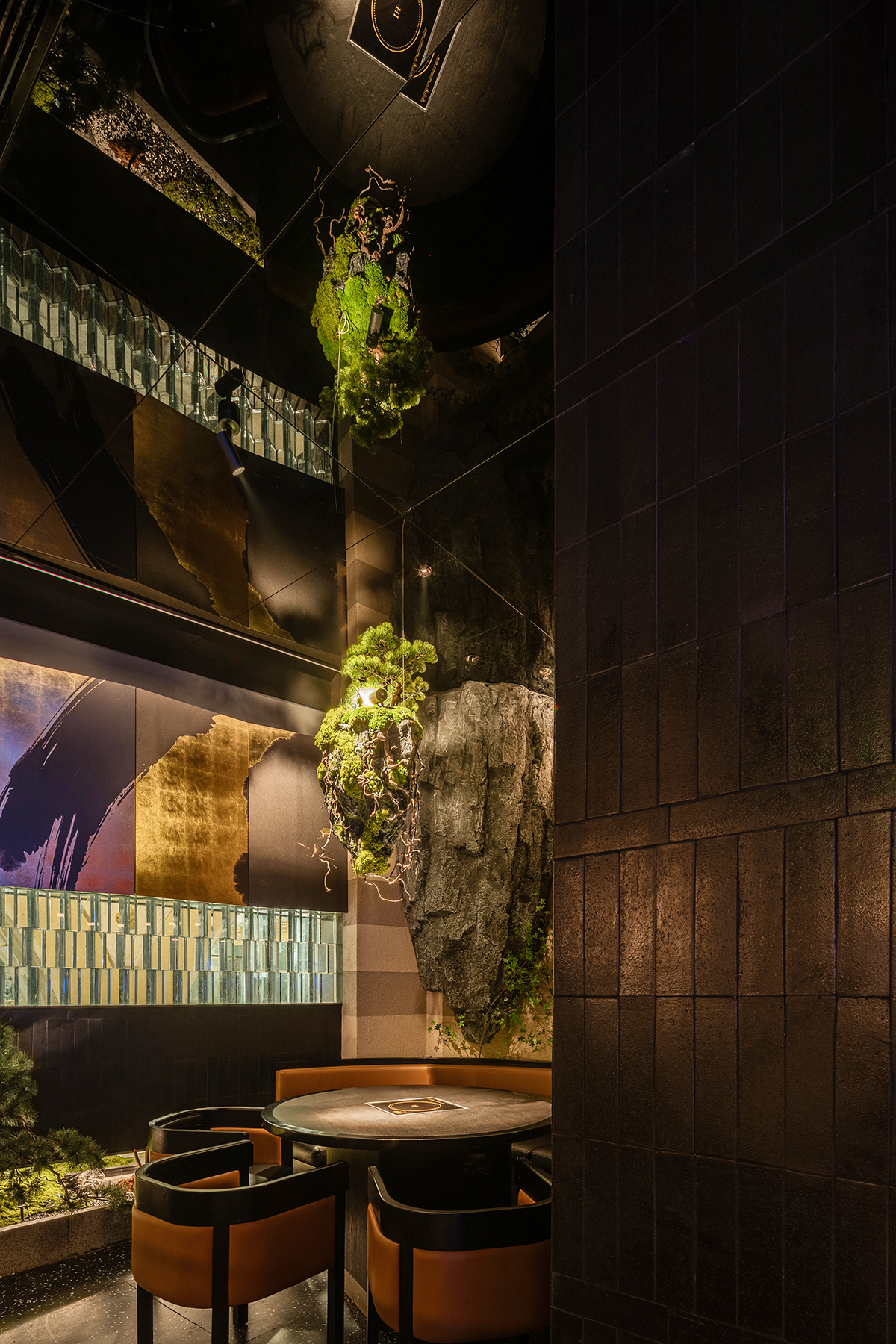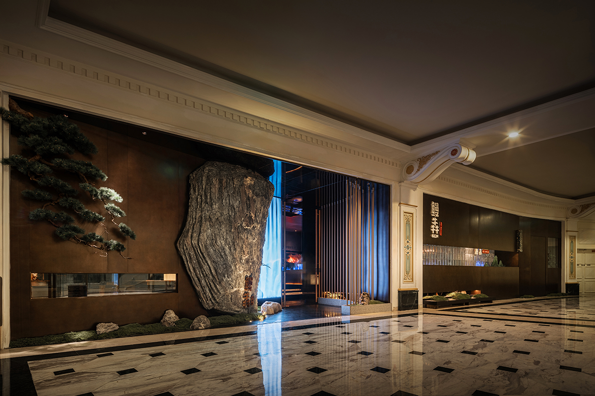 空间布局:一块巨石矗立,与背后的流水瀑布相映成趣,营造出一种亲切而自然的空间氛围。餐厅整体色调以暗雅为主,点缀着金色的华丽、赫赤的热情与翡绿的生机,仿佛是一幅简约而不失精致的日式和室画卷。在这里,简单与复杂相互交织,形成了独特的对立统一之美。你可以将这里视为都市生活中的一片“隐居之所”,是逃离喧嚣、寻求平衡的心灵港湾