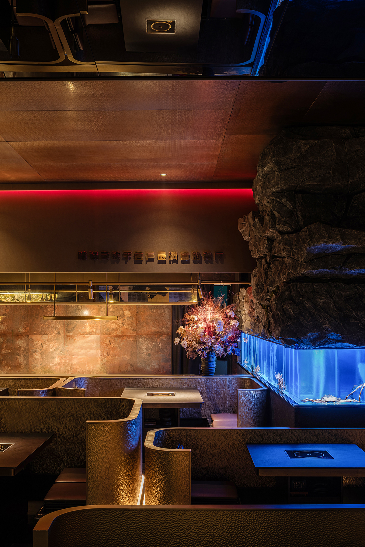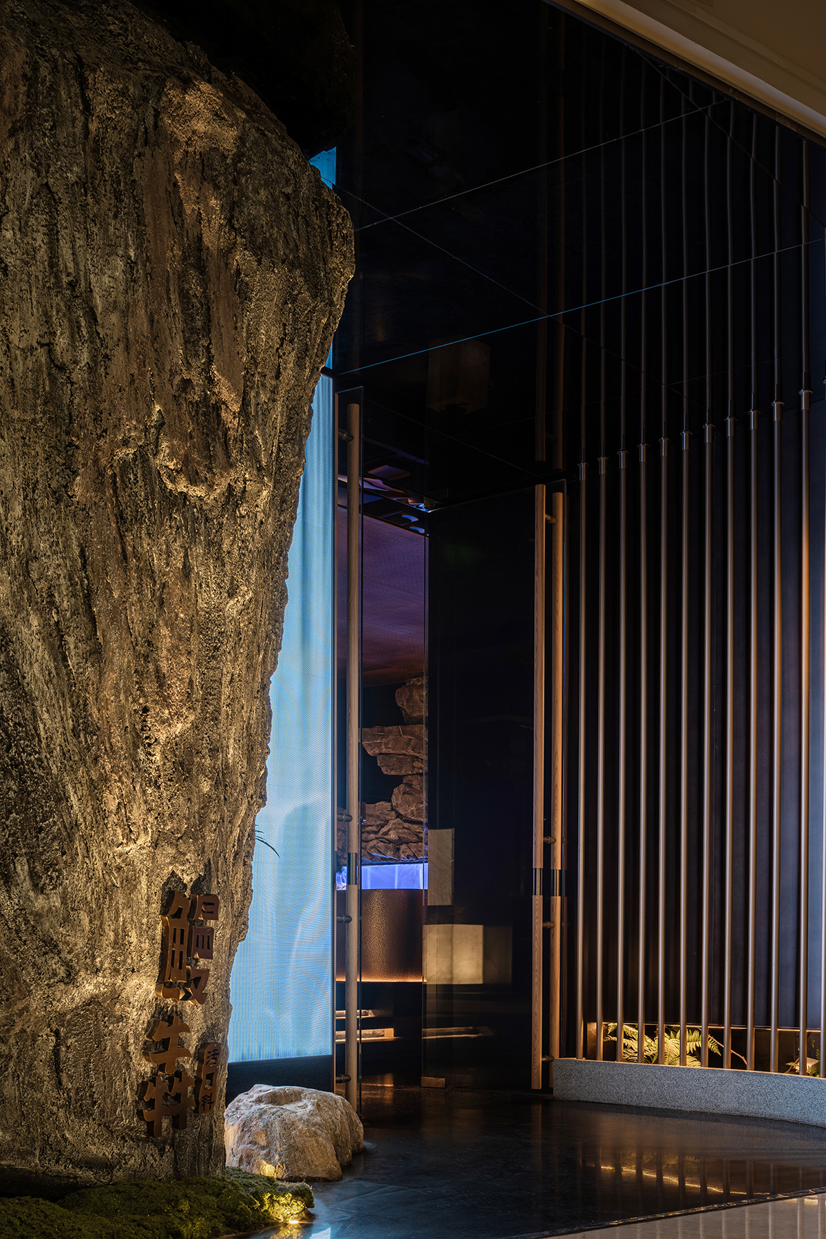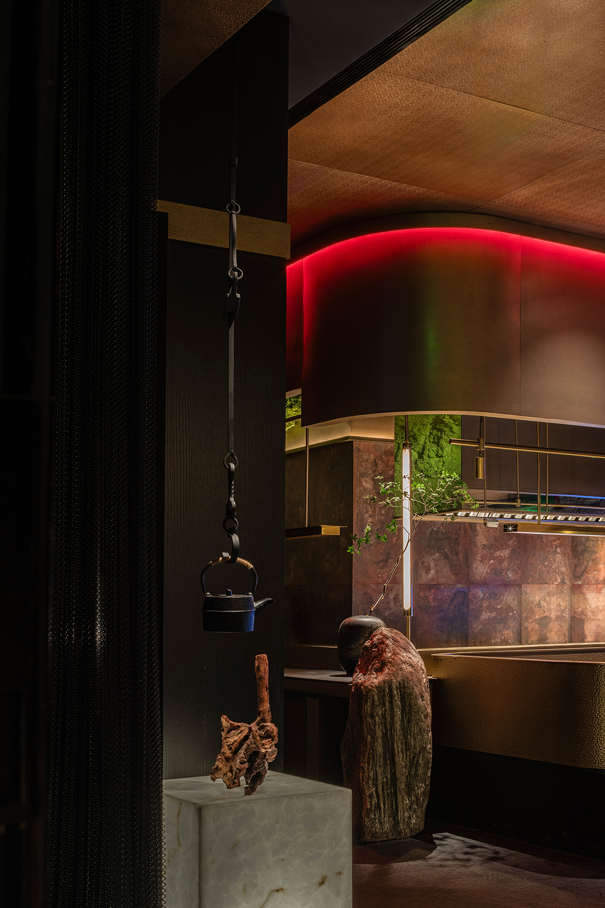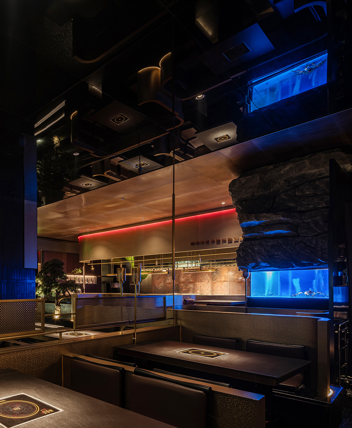 空间布局:一块巨石矗立,与背后的流水瀑布相映成趣,营造出一种亲切而自然的空间氛围。餐厅整体色调以暗雅为主,点缀着金色的华丽、赫赤的热情与翡绿的生机,仿佛是一幅简约而不失精致的日式和室画卷。在这里,简单与复杂相互交织,形成了独特的对立统一之美。你可以将这里视为都市生活中的一片“隐居之所”,是逃离喧嚣、寻求平衡的心灵港湾