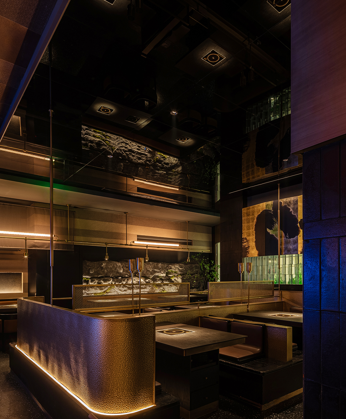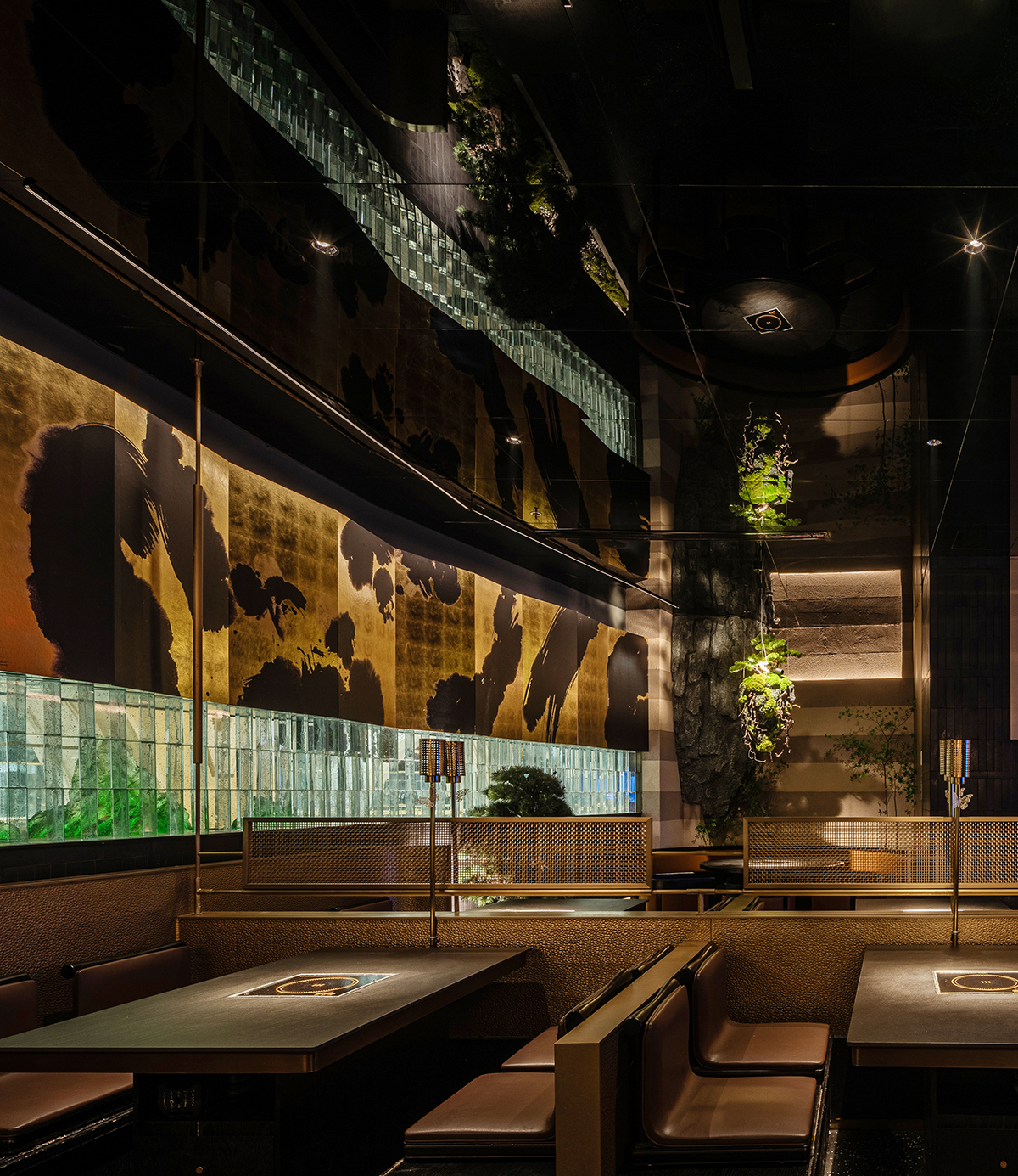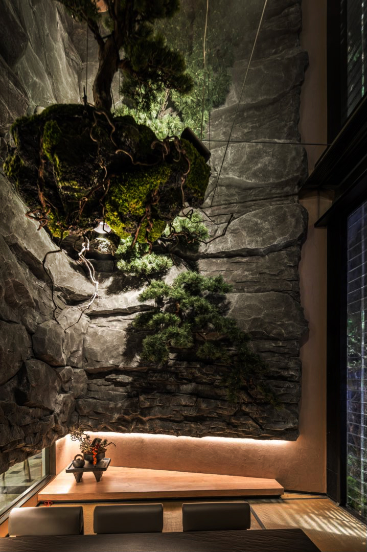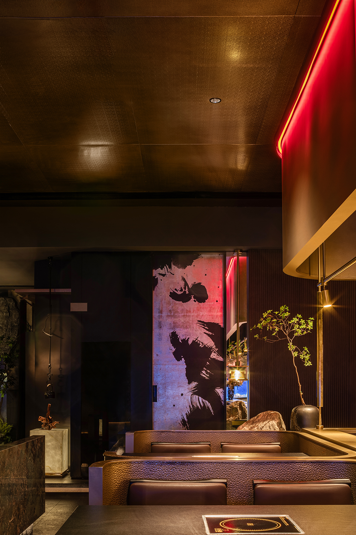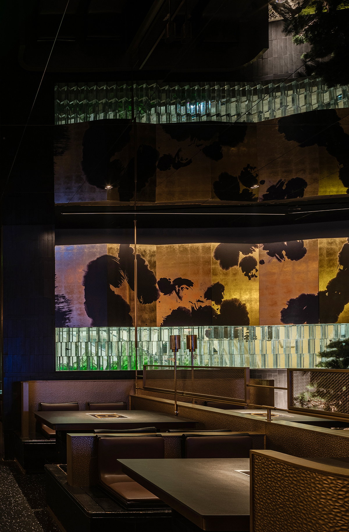 空间布局:一块巨石矗立,与背后的流水瀑布相映成趣,营造出一种亲切而自然的空间氛围。餐厅整体色调以暗雅为主,点缀着金色的华丽、赫赤的热情与翡绿的生机,仿佛是一幅简约而不失精致的日式和室画卷。在这里,简单与复杂相互交织,形成了独特的对立统一之美。你可以将这里视为都市生活中的一片“隐居之所”,是逃离喧嚣、寻求平衡的心灵港湾