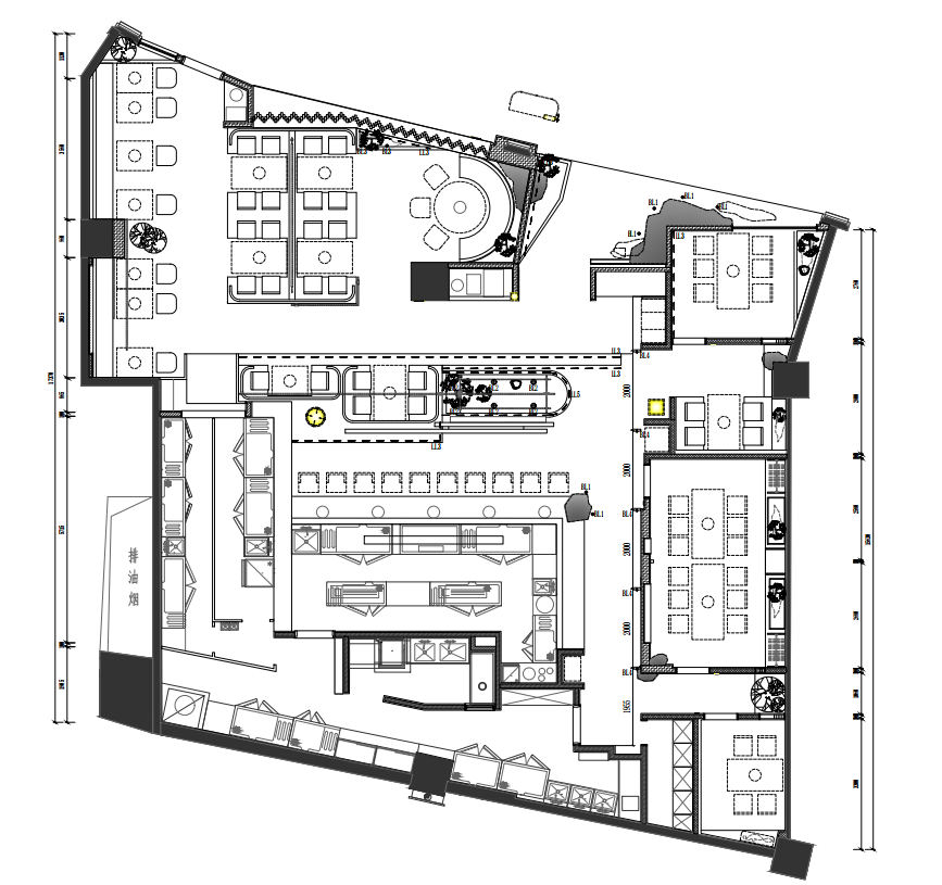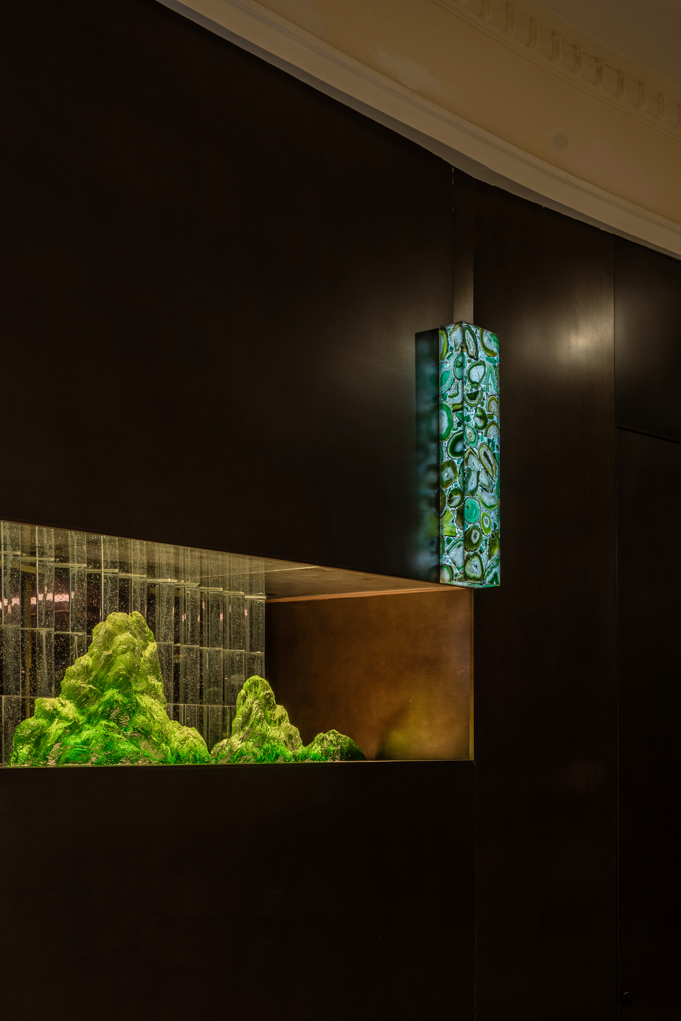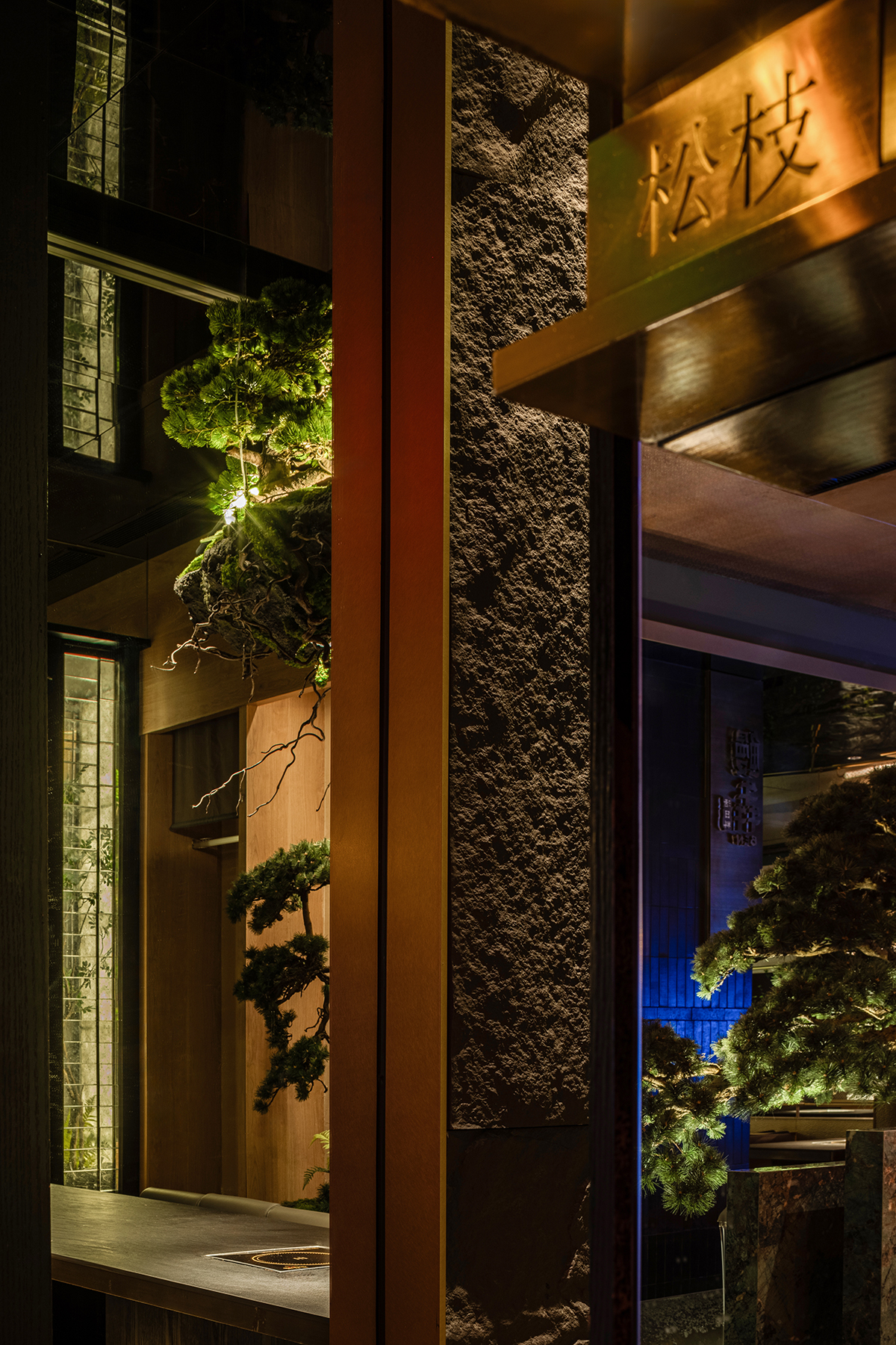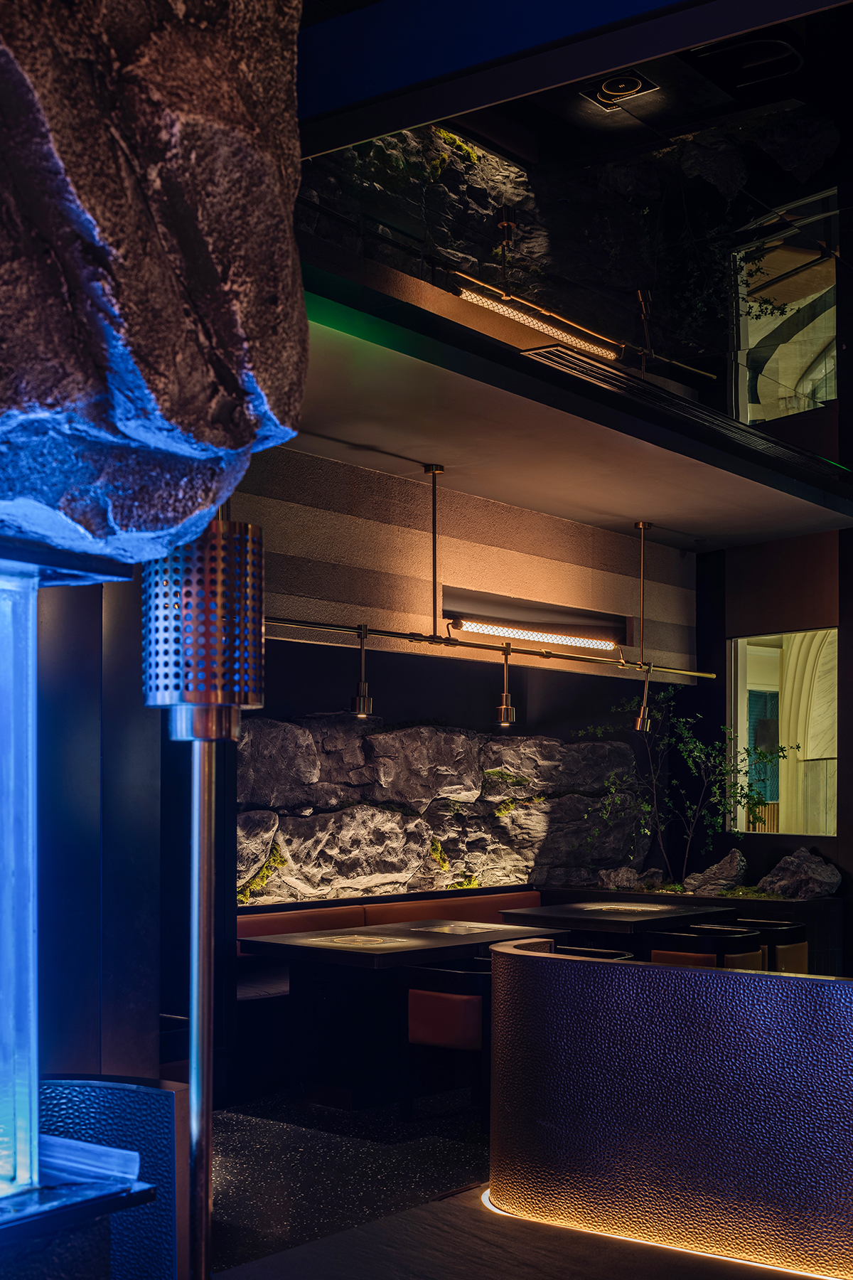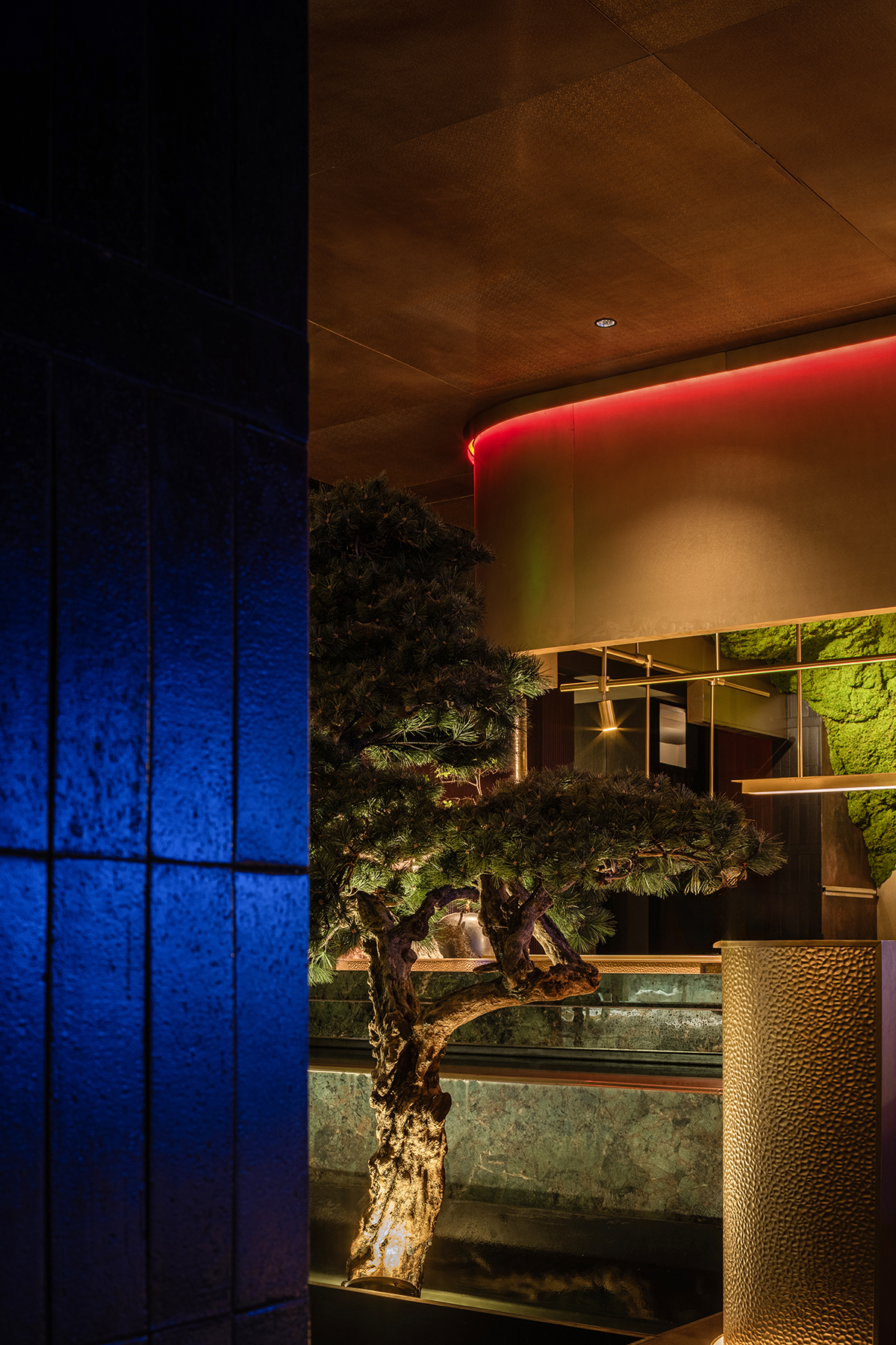 空间布局:一块巨石矗立,与背后的流水瀑布相映成趣,营造出一种亲切而自然的空间氛围。餐厅整体色调以暗雅为主,点缀着金色的华丽、赫赤的热情与翡绿的生机,仿佛是一幅简约而不失精致的日式和室画卷。在这里,简单与复杂相互交织,形成了独特的对立统一之美。你可以将这里视为都市生活中的一片“隐居之所”,是逃离喧嚣、寻求平衡的心灵港湾