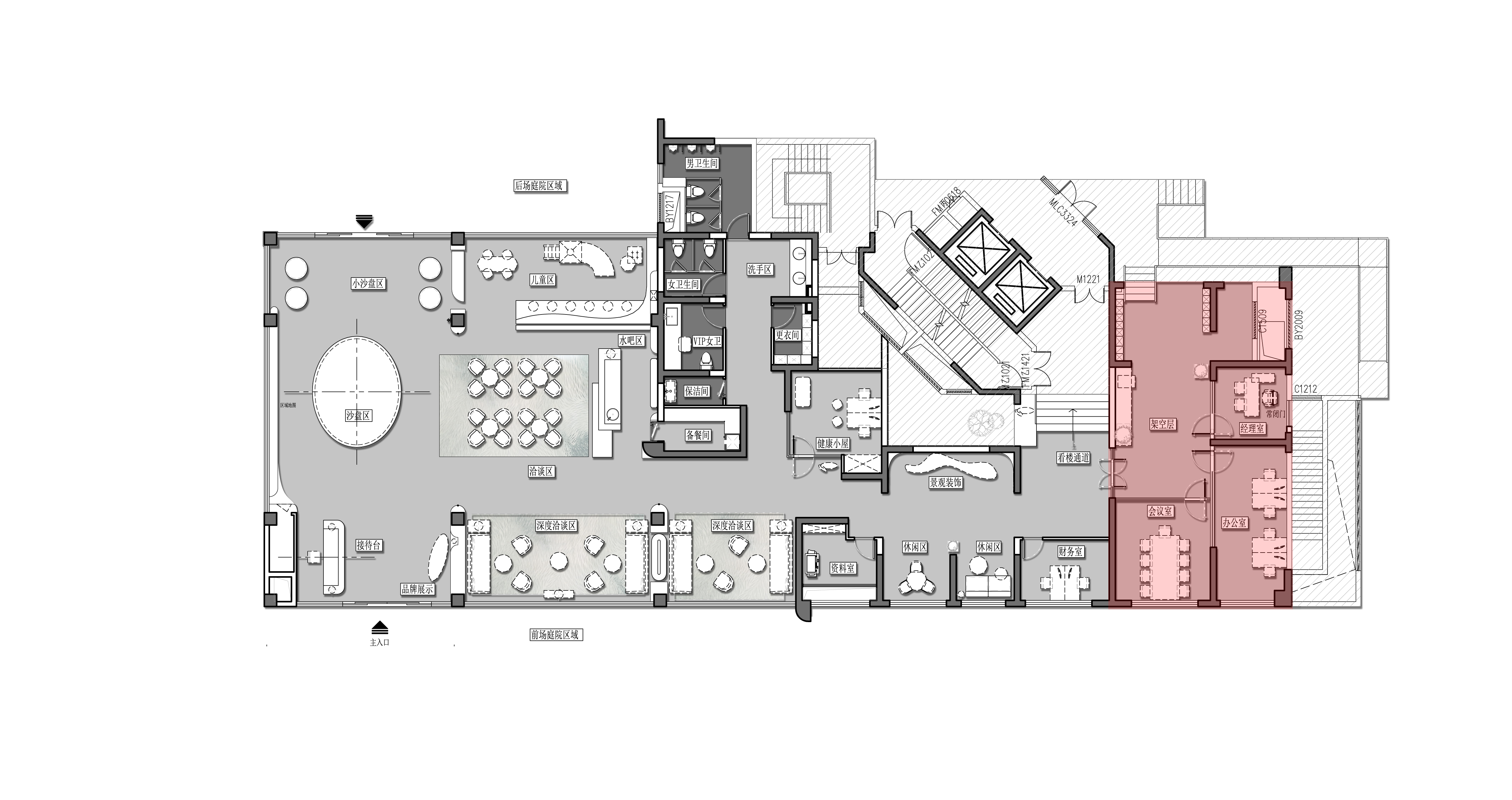 空间布局:由于是临时售楼部,所以,结合商铺与架空层高低差关系,做了很多后场区域高低错落关系,卫生间,看楼通道都根据高差和空间局限性进行落位,因地制宜合理布置好每个功能布局。