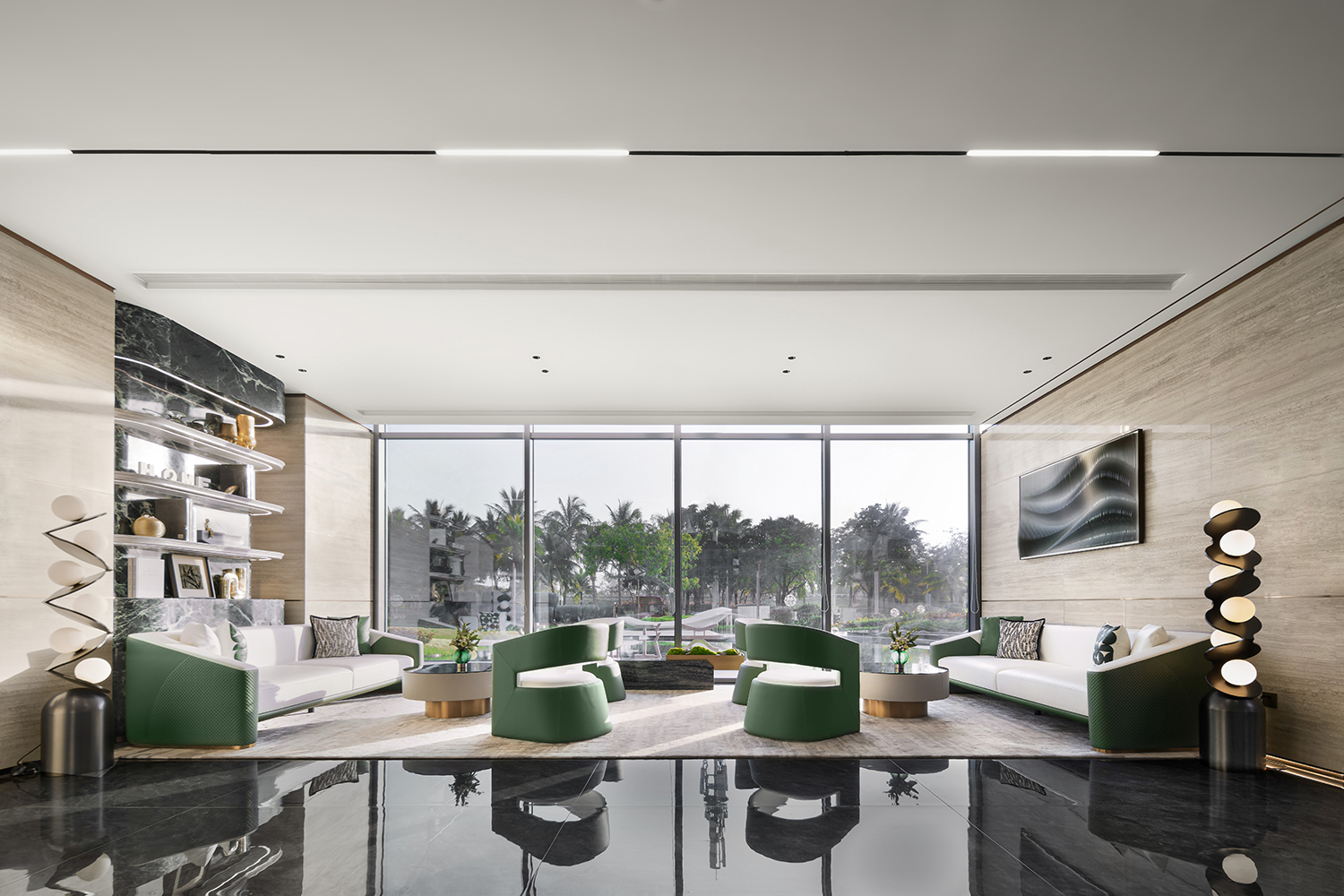 局部用了普拉达绿,简洁中体现精奢贵气之美,在有限的造价限制之下,创造出用材用心之道。