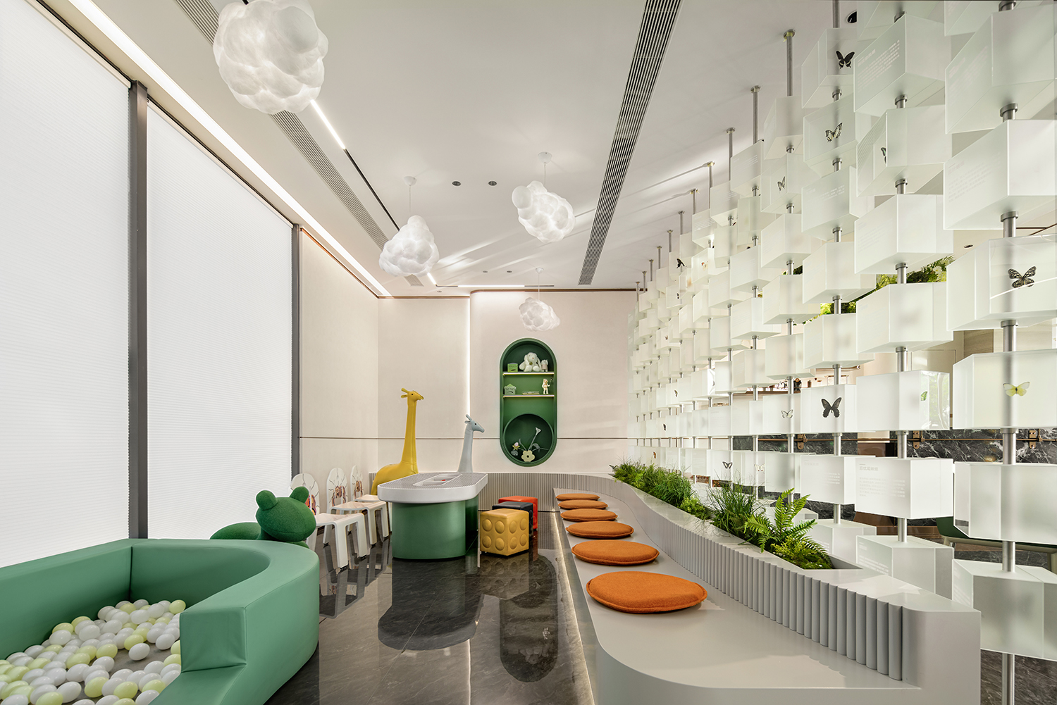 儿童区与洽谈区内外进行延展,隔而不断。也考虑大人的陪伴成长,提供亲子活动的家具设计,通过局部的家具作为空间中功能结构,体现设计融合综合考虑的特点。