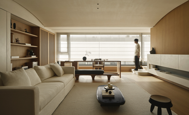 空间布局:设计将楼梯位置的改动,重新定义客厅的延展面积。宽裕的挑高,消解了空间体块的局促,亦将窗外光线充分吸纳,塑造出通透的空间感。