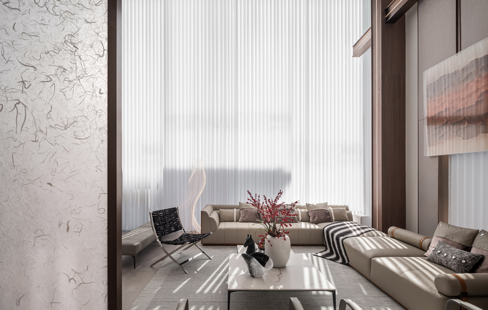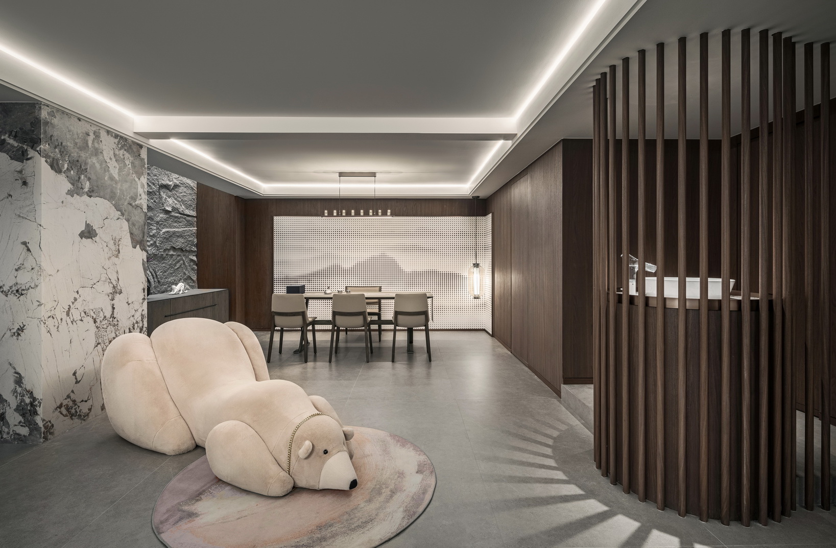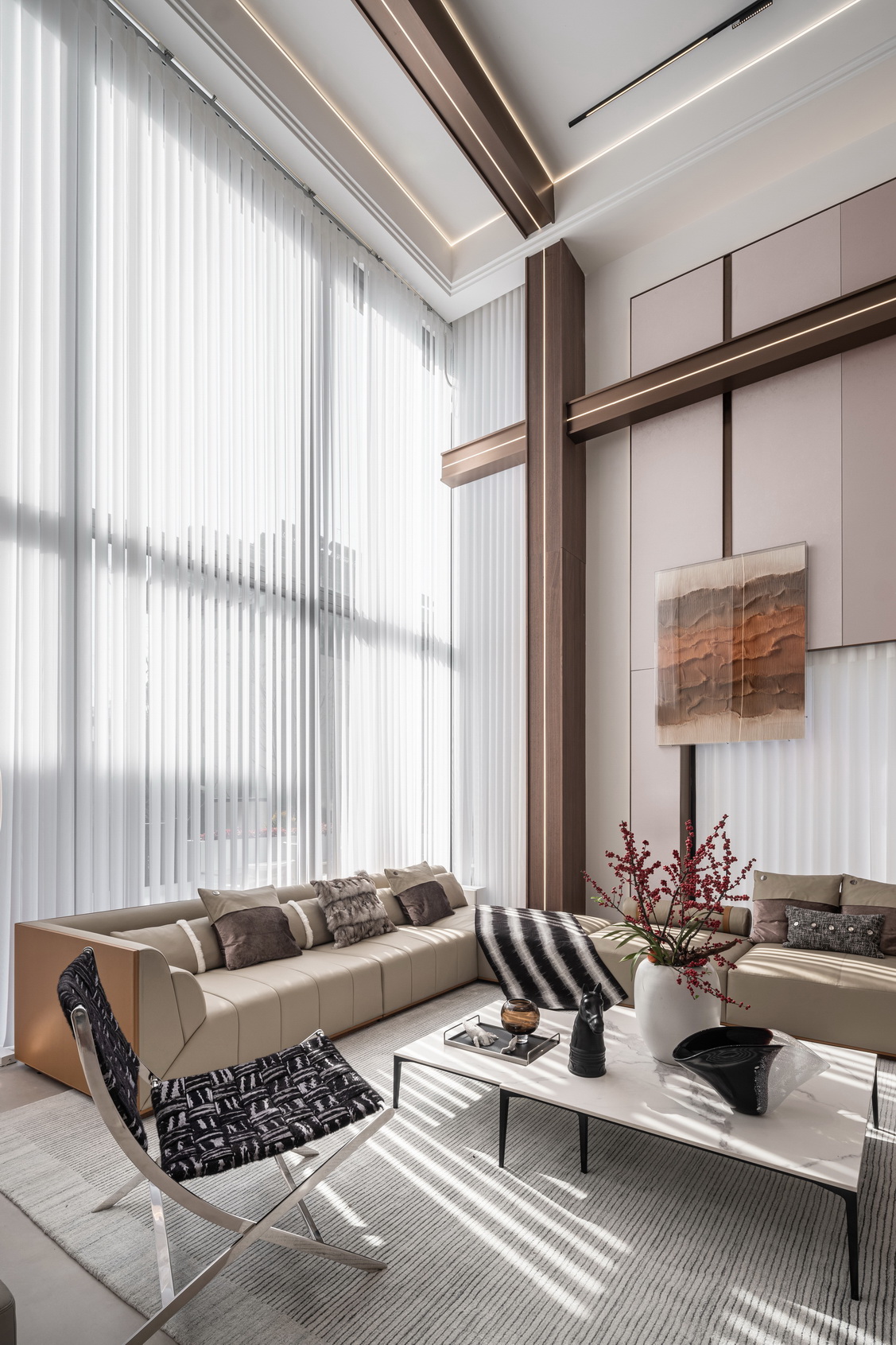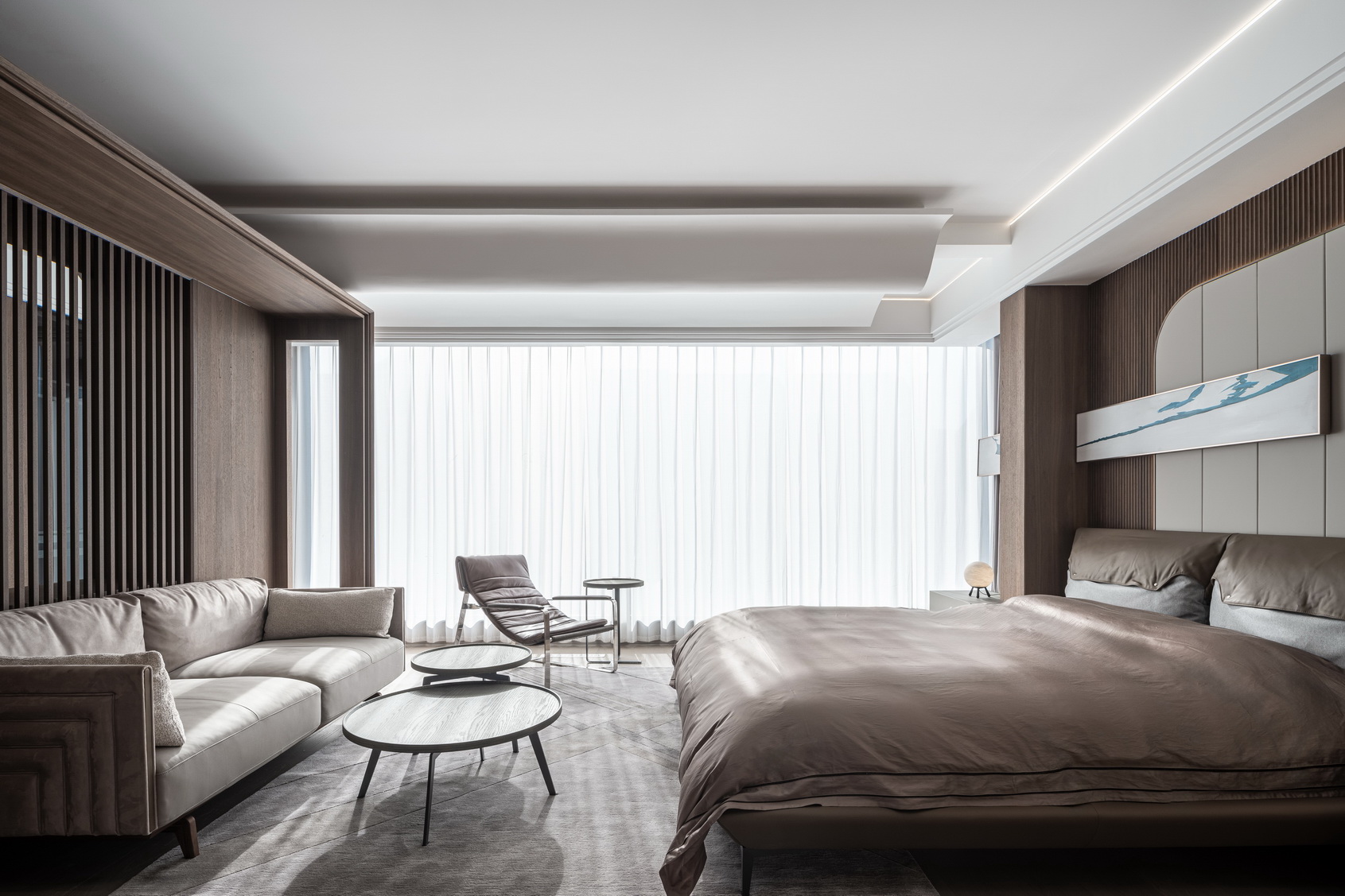 设计选材:地处雪浪山下,长广溪边;捕捉地域文化特质,提炼山、水设计元素,呈现内空间与外景观相关联,内外呼应的现代写意空间--现代轻奢风格