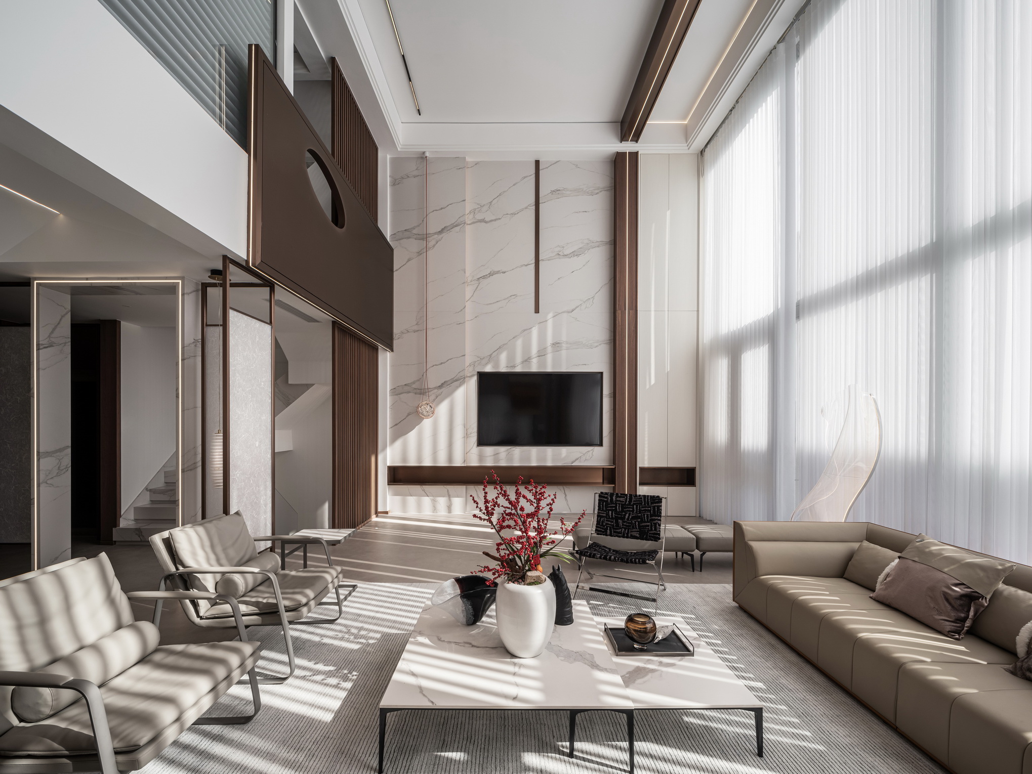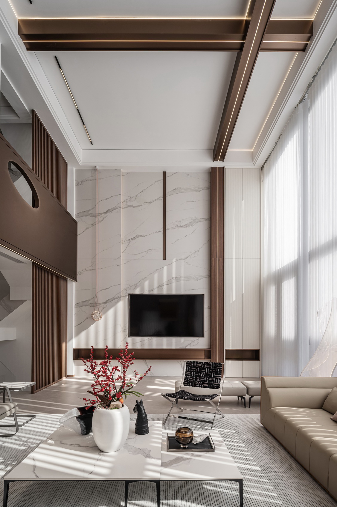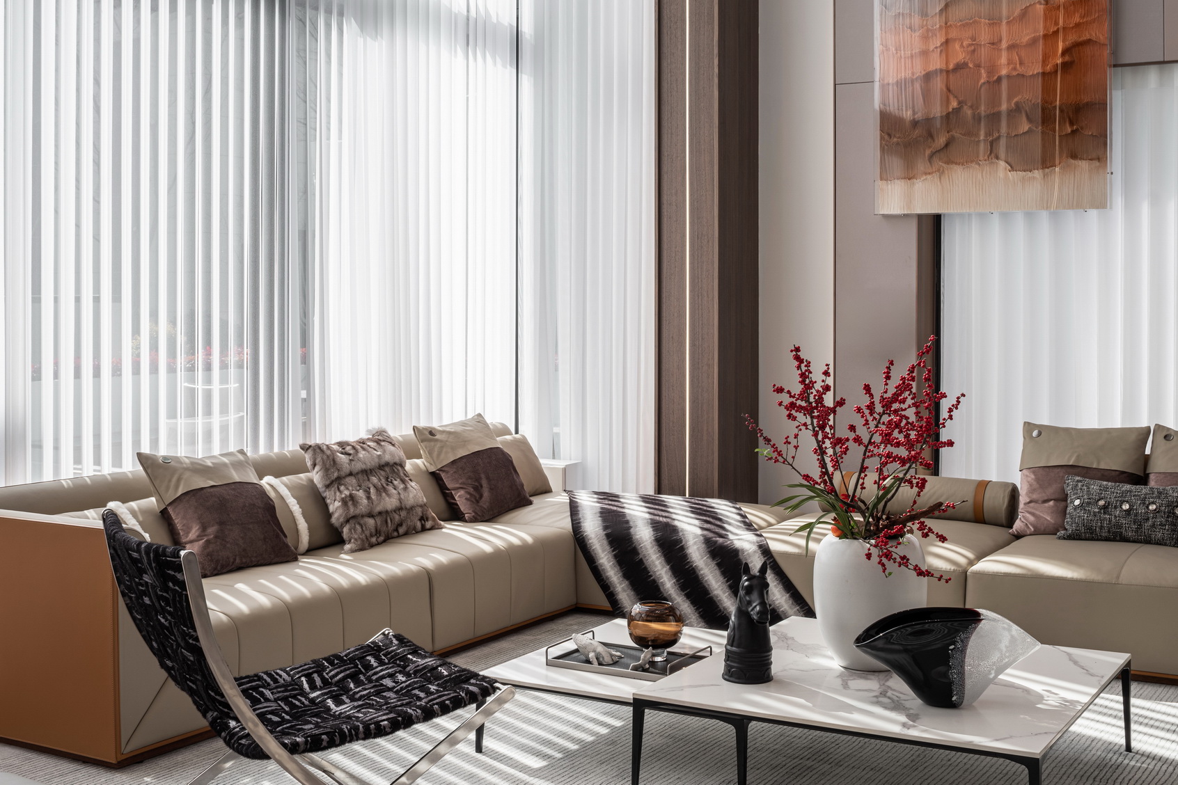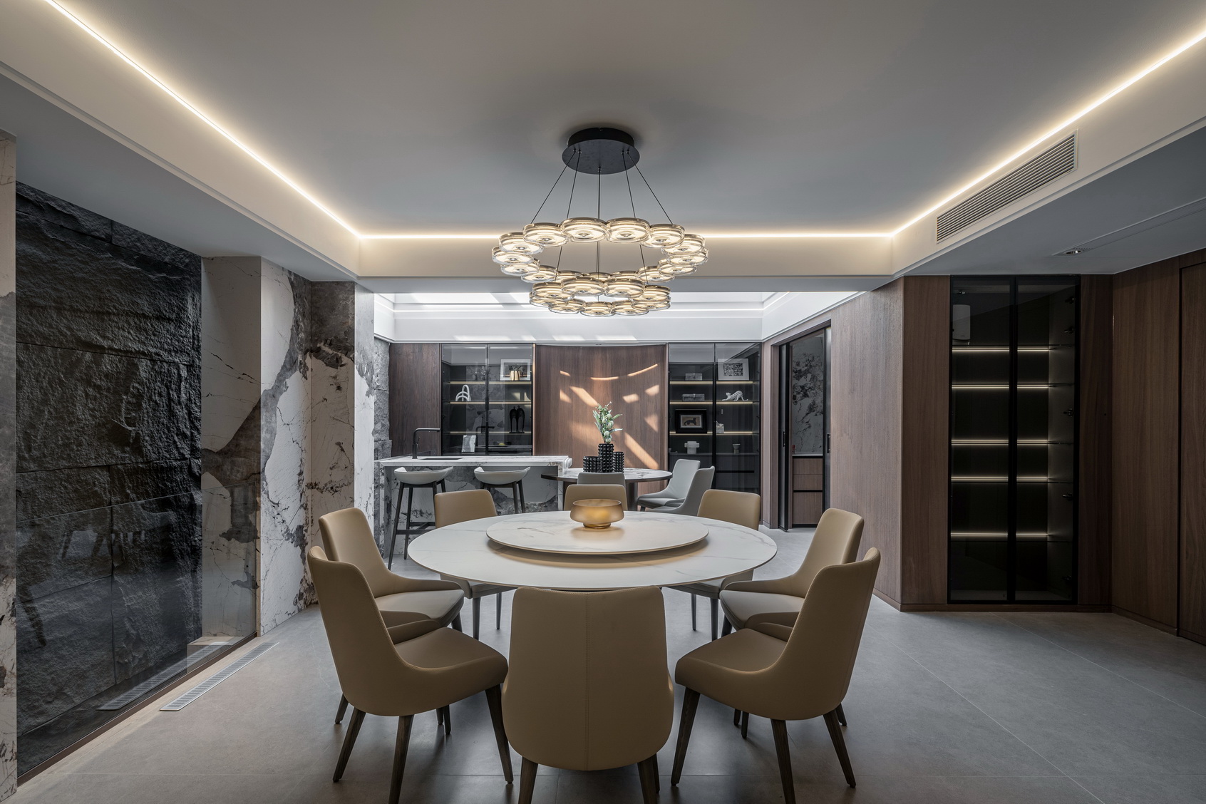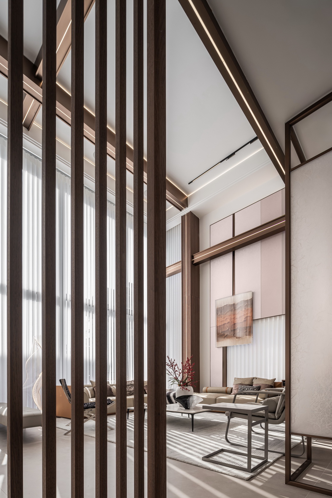 设计选材:地处雪浪山下,长广溪边;捕捉地域文化特质,提炼山、水设计元素,呈现内空间与外景观相关联,内外呼应的现代写意空间--现代轻奢风格