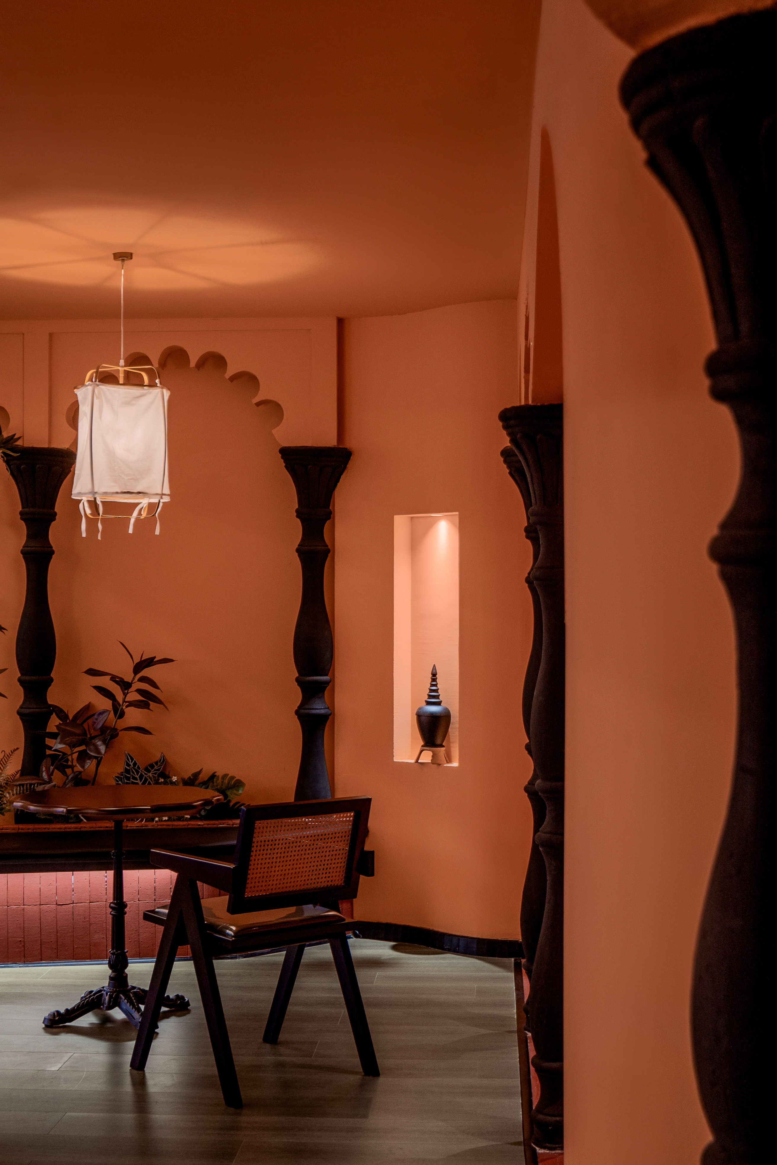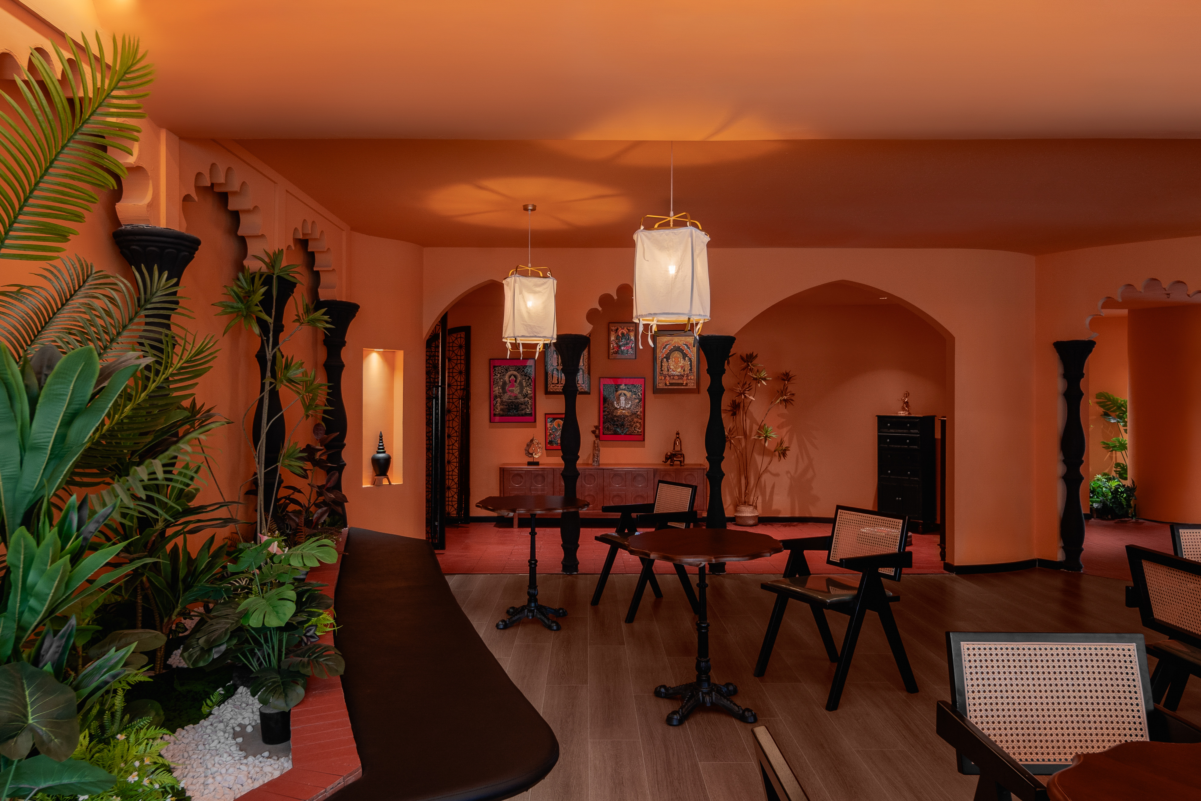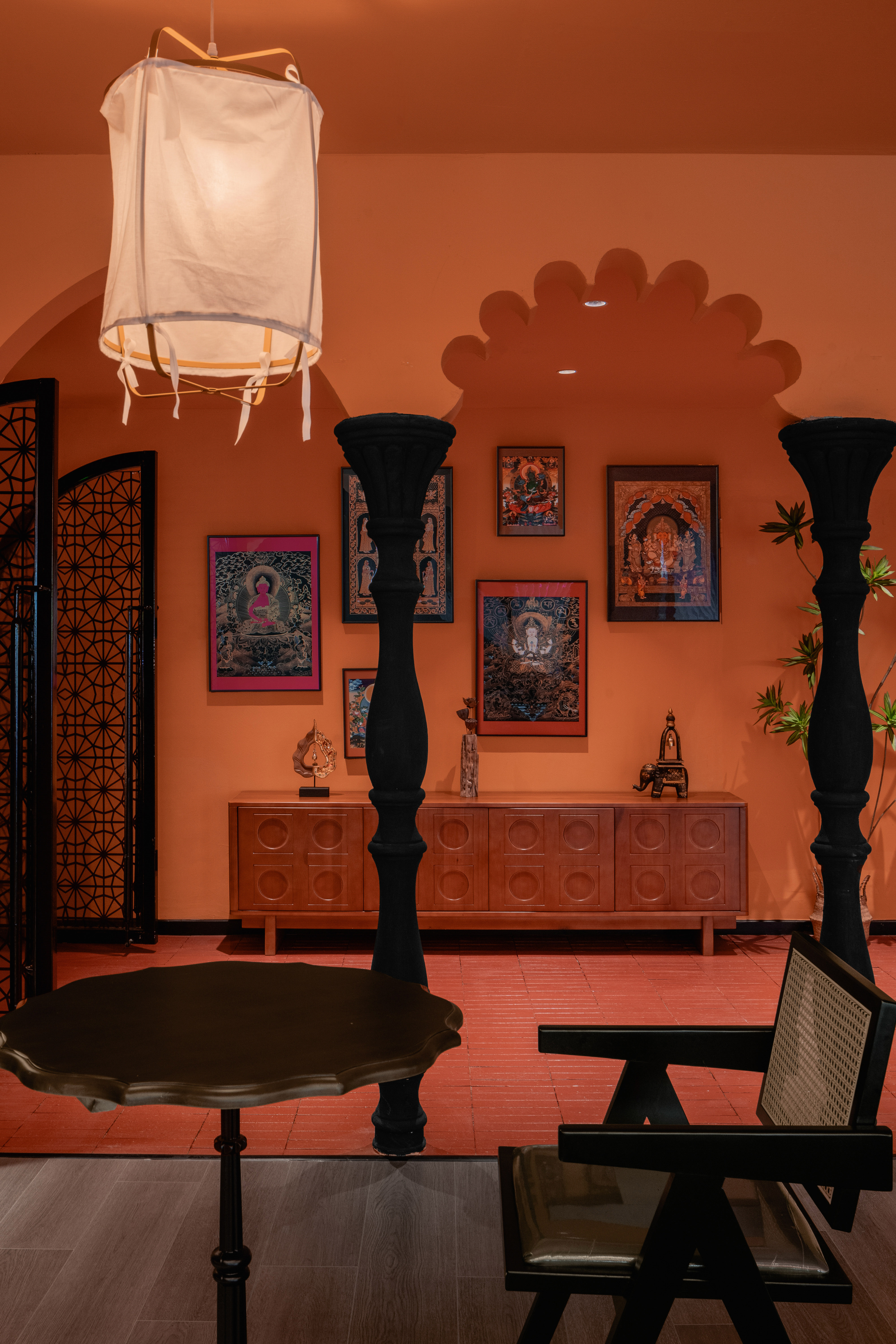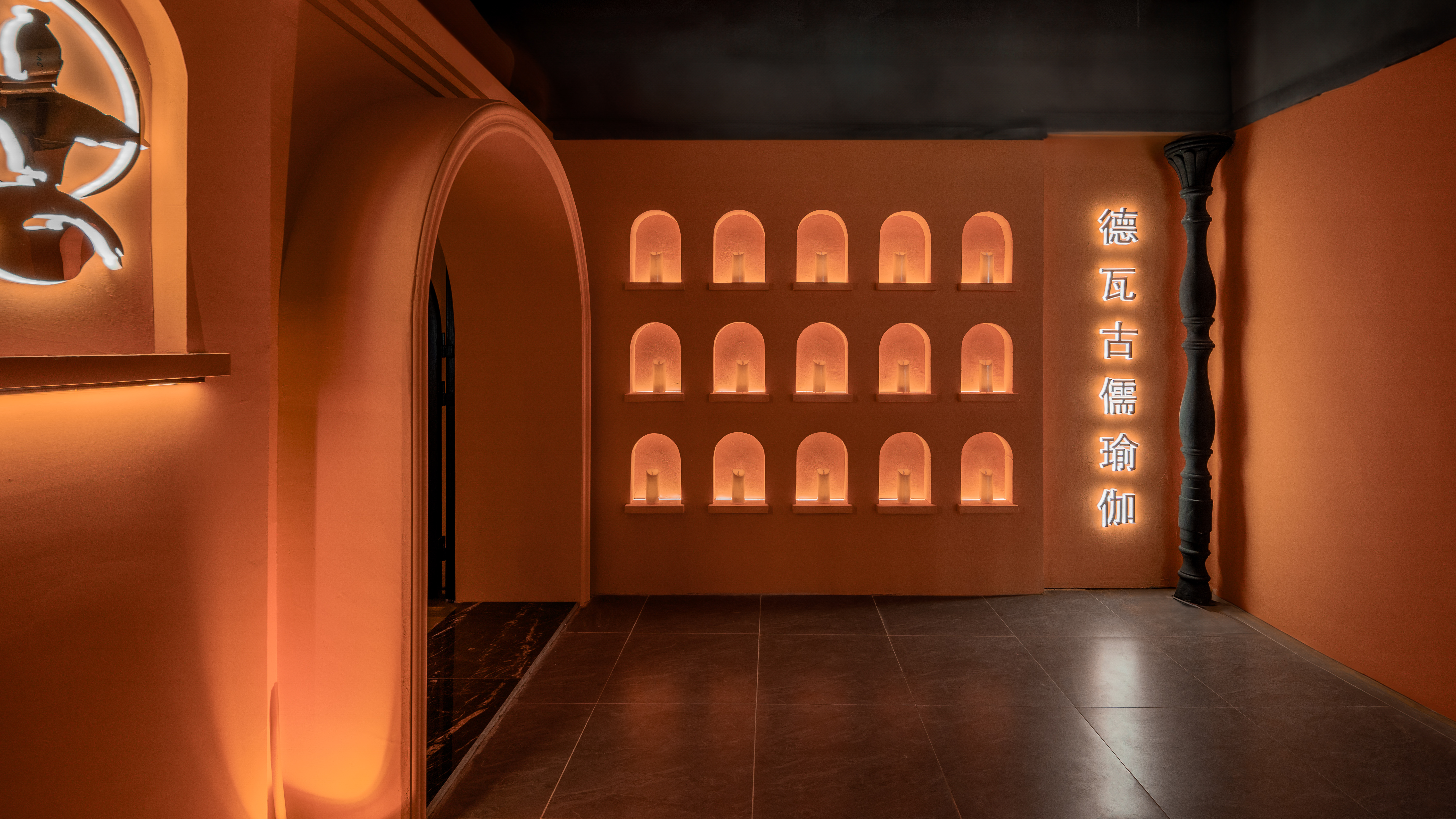 空间小而精,设置储物格放置具有印度元素的装饰物,地面放置音律击打乐器,视觉与听觉上的引导,赋予空间更为沉浸的本质。